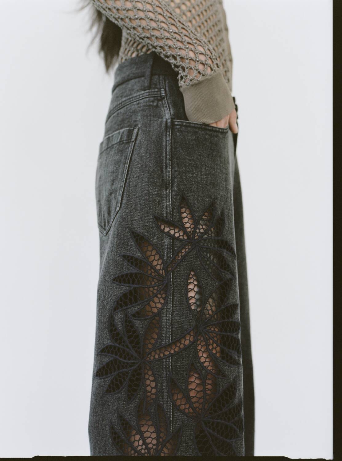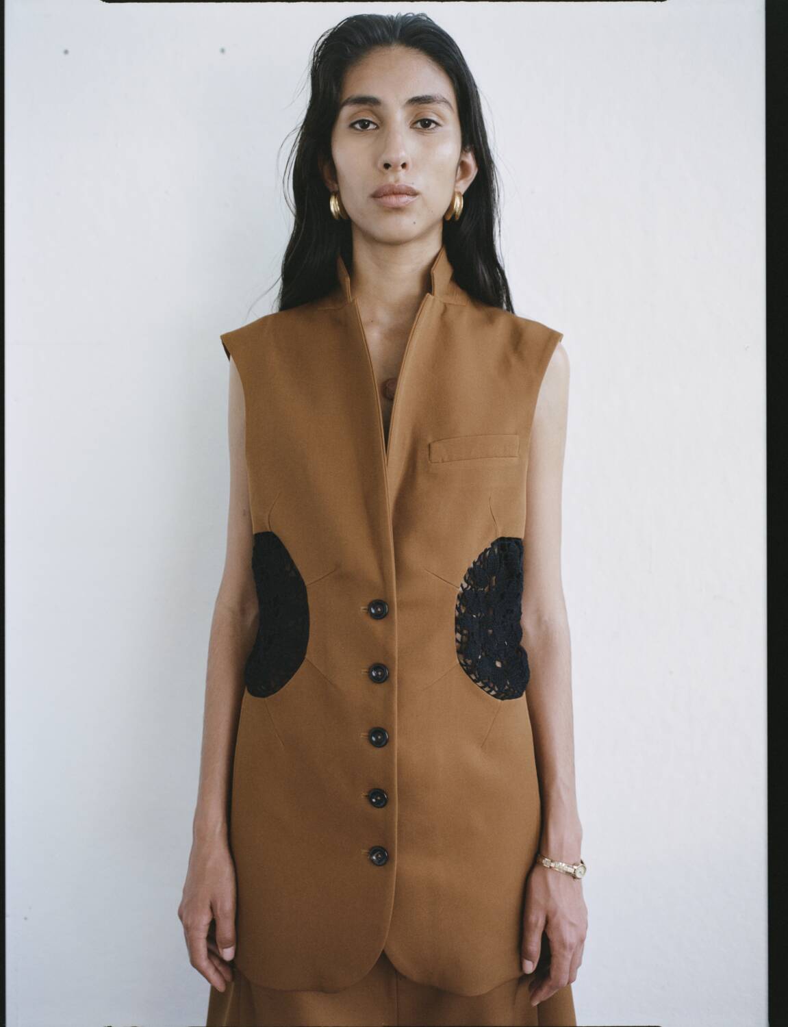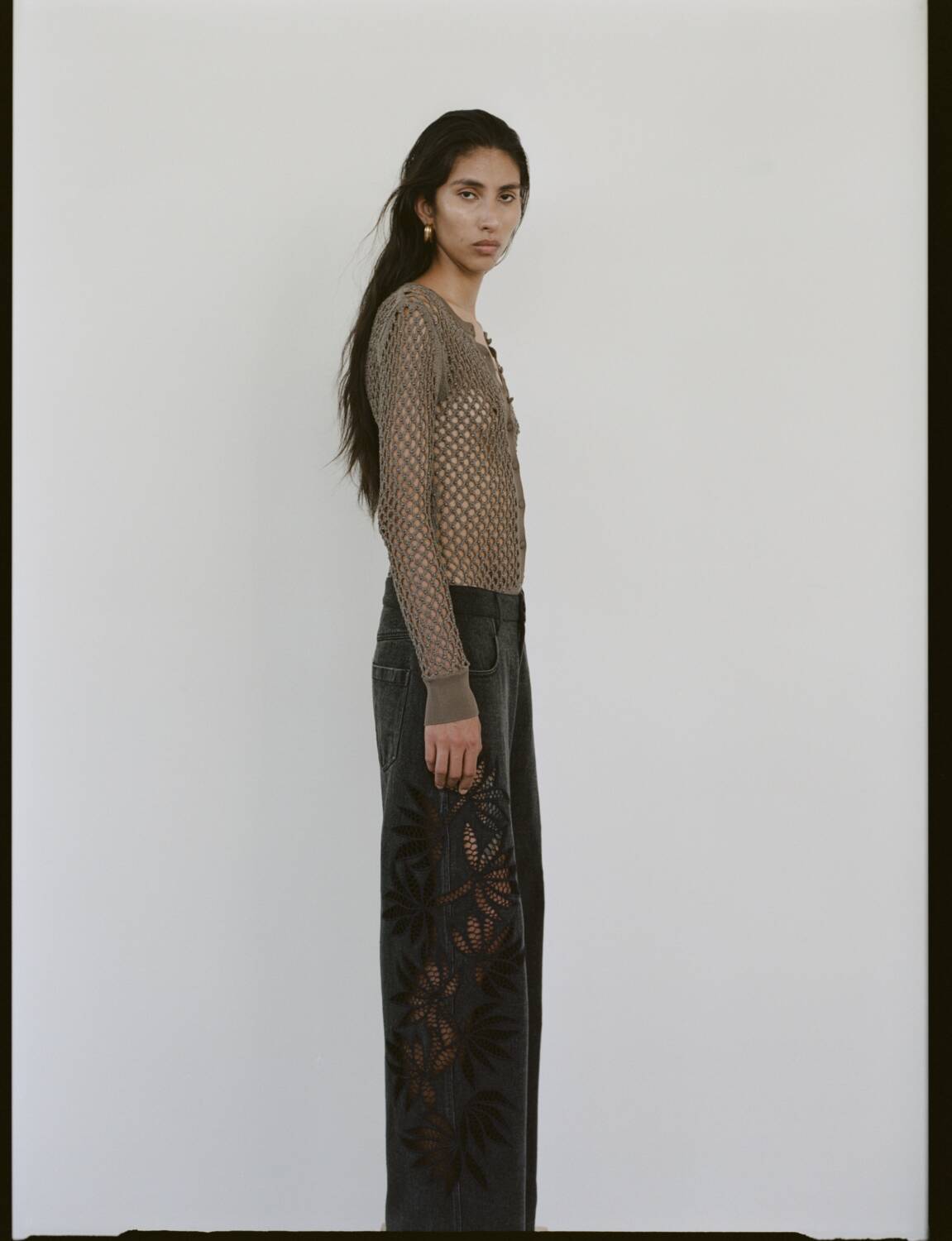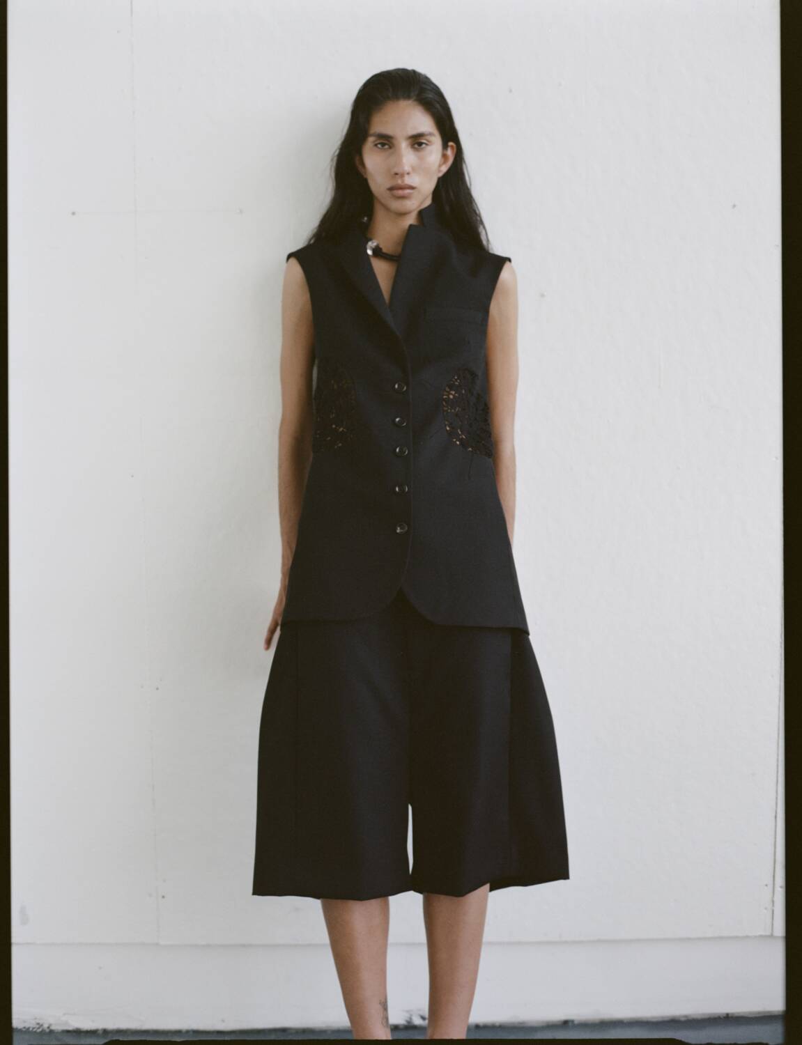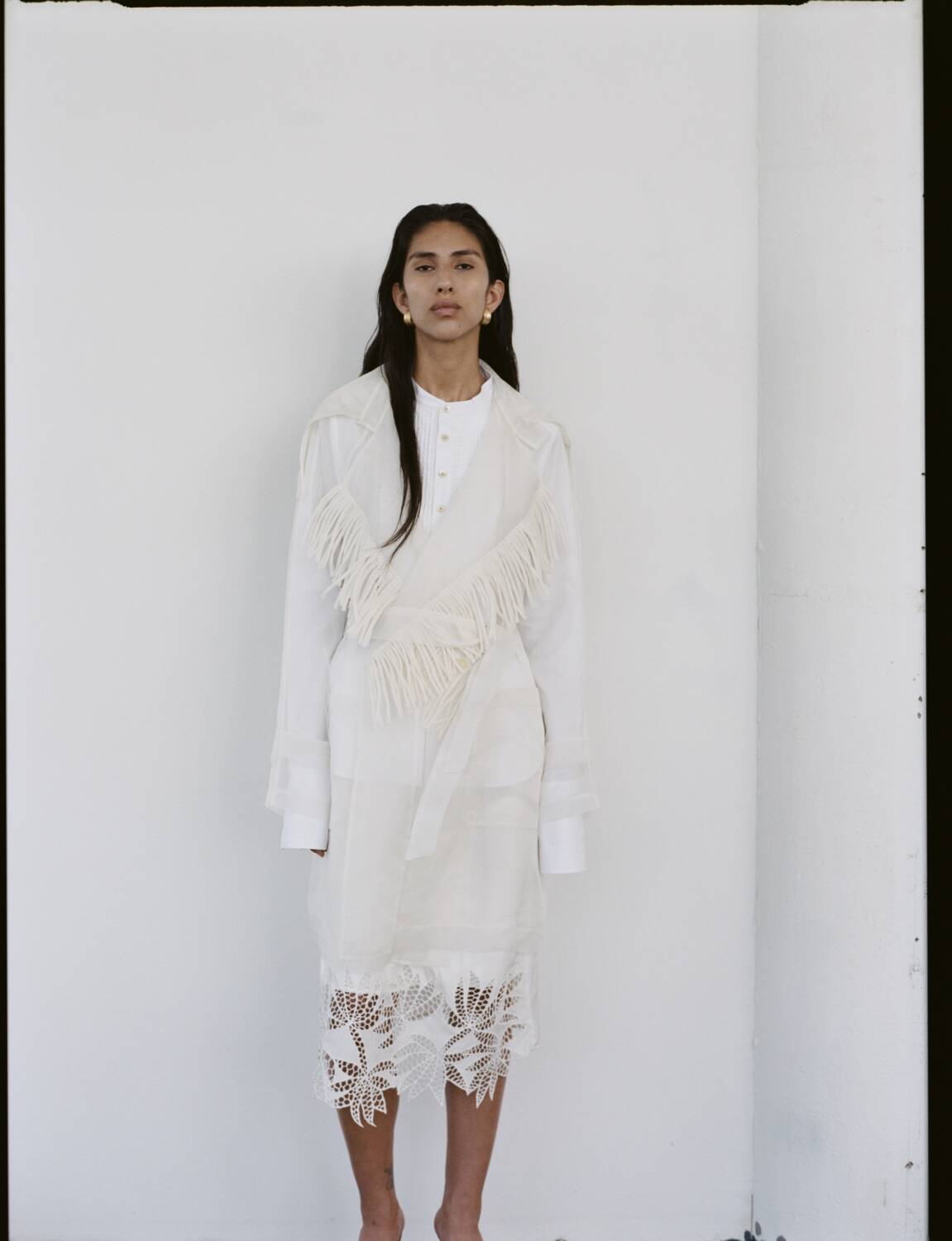 Symbolic elements nodding to sun-drenched summertime rituals that take place by the island’s rivers were abstracted across the garments. Broderie anglaise lace referenced the palm trees or weed leaves that dot the Caribbean’s natural landscape. Pieces that mirrored those worn in Jamaica’s undiscovered traditions were romanticised, expressed in blood-red crochet headscarves and opaque tights worn under white dresses.
