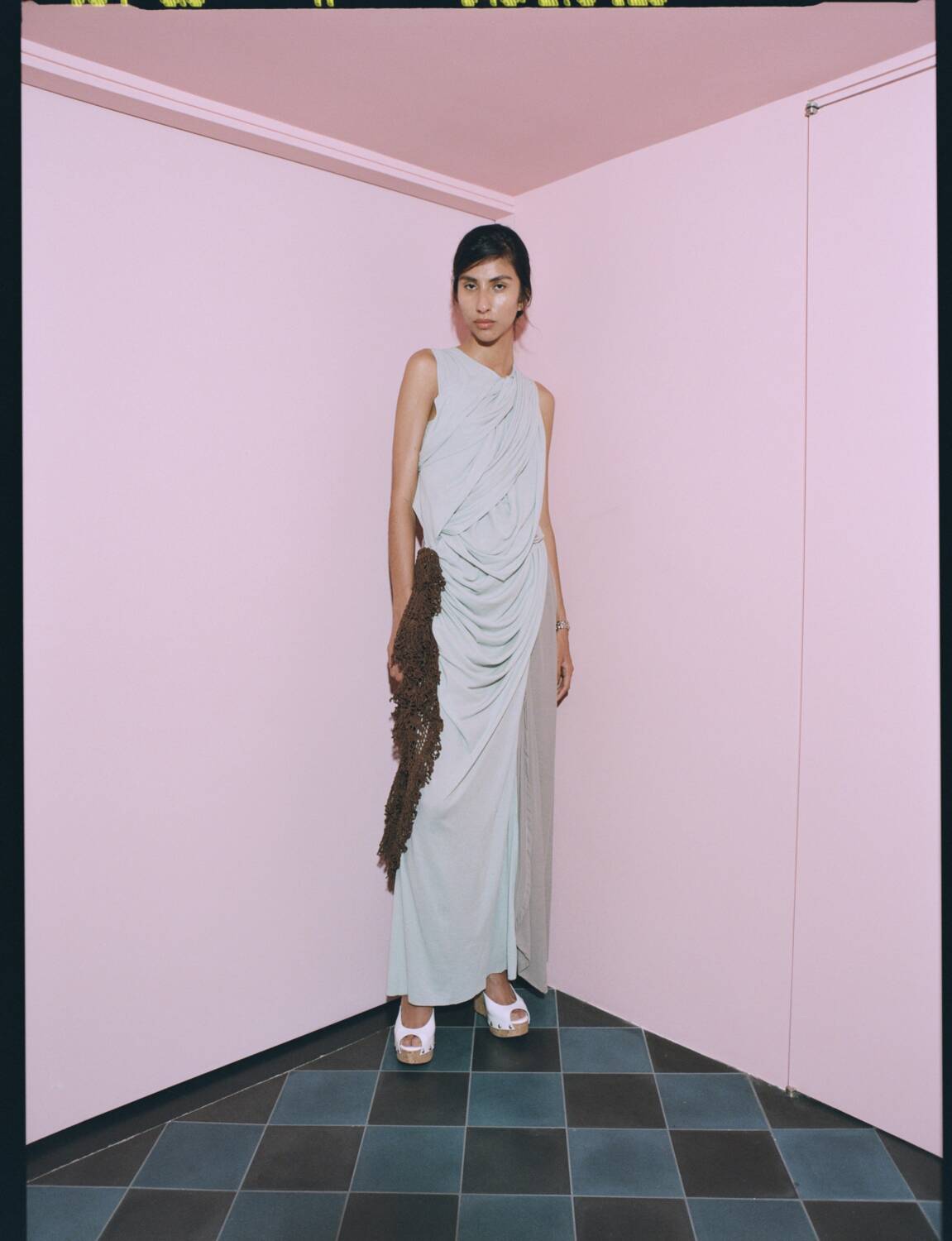 The influence of dancehall ran throughout, visible in the tension between proper attire and the sensuality of the genre. Silver-studded paillettes shimmered on the delicate straps of satin dresses with georgette skirts. Mesh gowns sprayed with crystals were paired with platform wedge sandals, emulating the spirit of the women that commanded dancehall spaces in the early ‘00s.