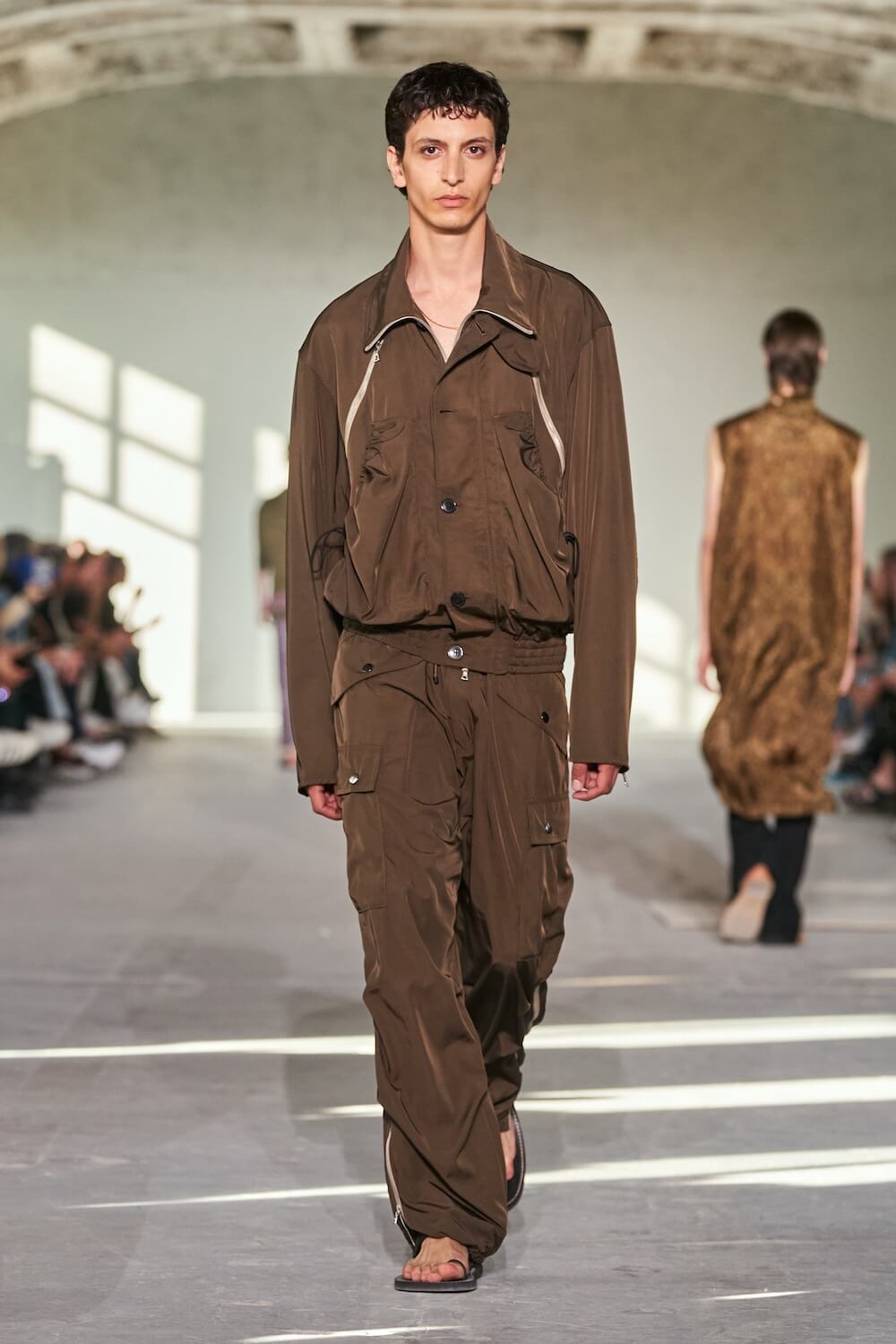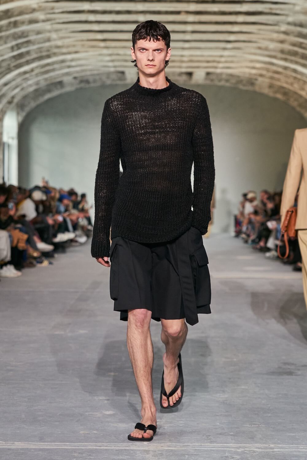 Dries Van Noten took a considered look at craft and construction for his SS24 menswear collection. Delivering an education in discrete, disruptive elegance, the Belgian designer ditched the elaborate printmaking techniques he’d mastered last season in favour of sleek tailoring, strong silhouettes, fluidity and levity. Where swirling graphics, exotic blooms and dizzying depictions of diving birds once were, quiet suggestions proxied, bringing a lopsided shadow motif created by layering print-on-print to simple suiting. Hypnotic visuals remained, but they were soft-pedalled and appeared only intermittently on gossamer tunics and dusters.