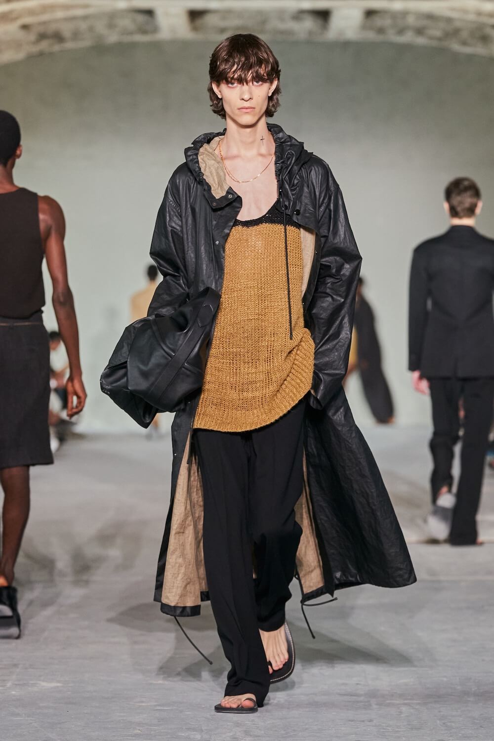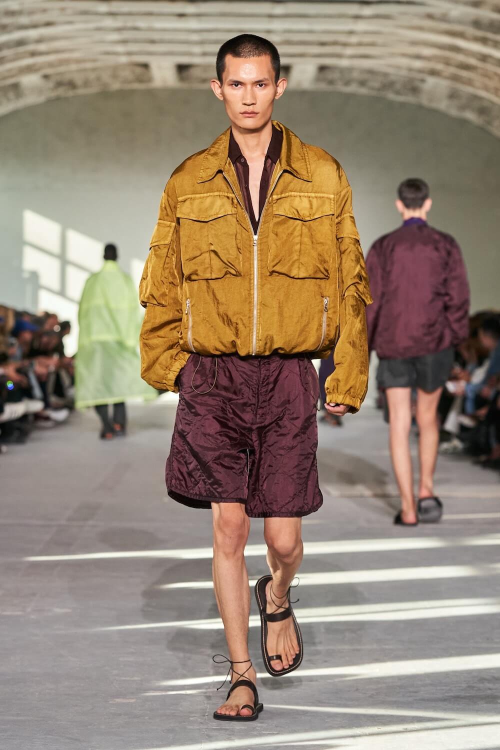 Silhouettes were long and lean, but parkas still bulged and unconventional colourways made for a dazzling display of rust, ecru, lilac, ink and olive tones as well as apricot, citrine, mint and ombre effect treatments. A mustard bomber jacket featured sculptural raglan sleeves while a belted raglan shoulder coat in herringbone wool was cut with zig-zags of camel and black. Lustrous nylon dusters, windbreakers, flowing safari shirts and sport shorts floated from the body like high fashion feathers, in turn “celebrating subtle details and nuance over bold gestures”. By taking a step back, Dries Van Noten tapped into the holy grail of uncomplicated allure.