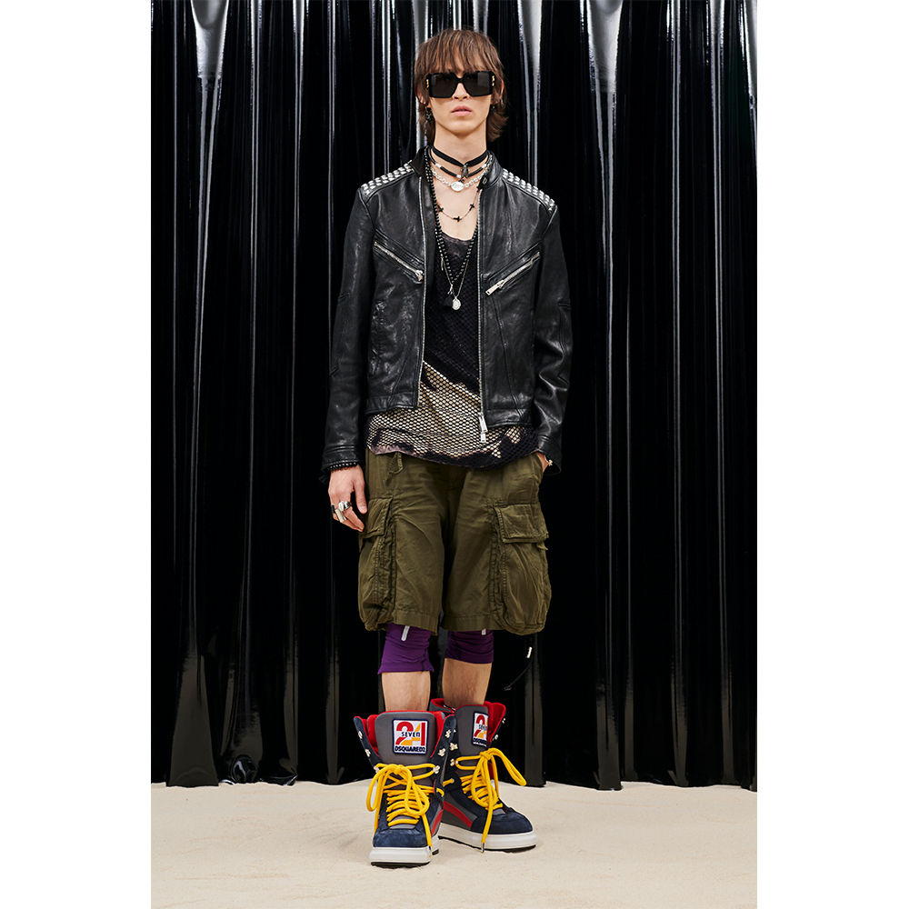 In the men’s department, the epitome of surfer boy chic is communicated through delicate mesh tops, voluminous cargo pants, and bleached sweatshirts. For evening rendezvous, sleeveless blazers arrive alongside Canadian tuxedo sets and bedazzled Hawaiian shirts paired with zippered leather bottoms. As for accessories, both collections carry a variety of leather bags, supersized kicks, and jewelry enriched with shark tooth pendants and seashells. Whether you’re looking to surf some waves, hit the town, or anything in between, Dsquared2 has got your next shoreside adventure covered.