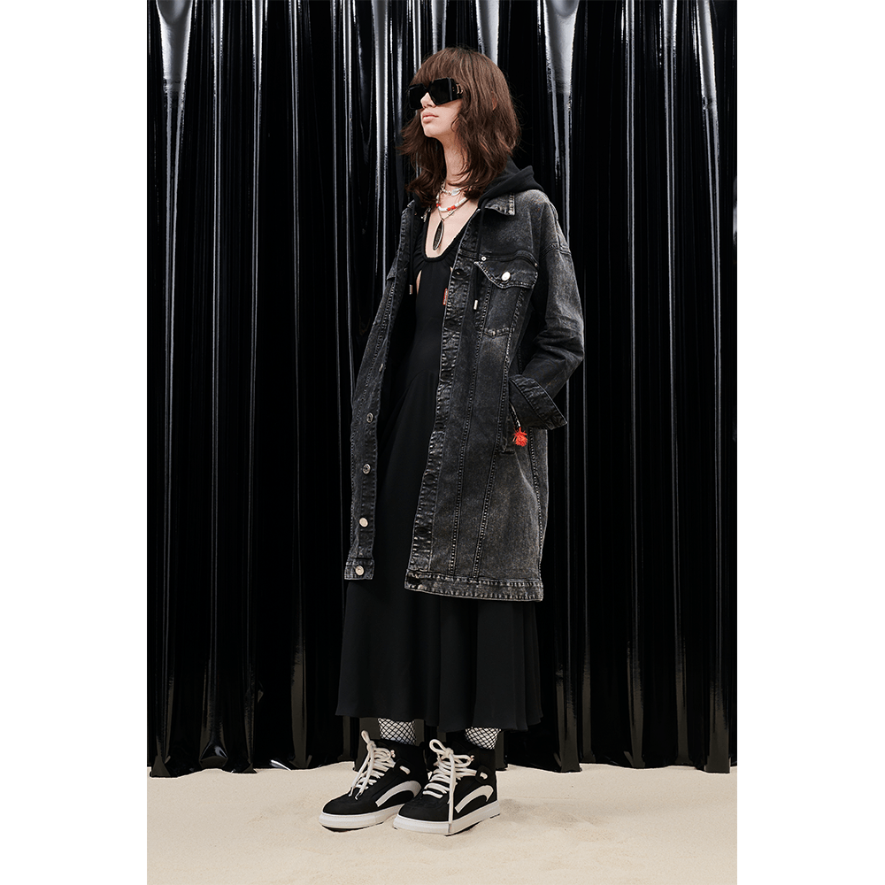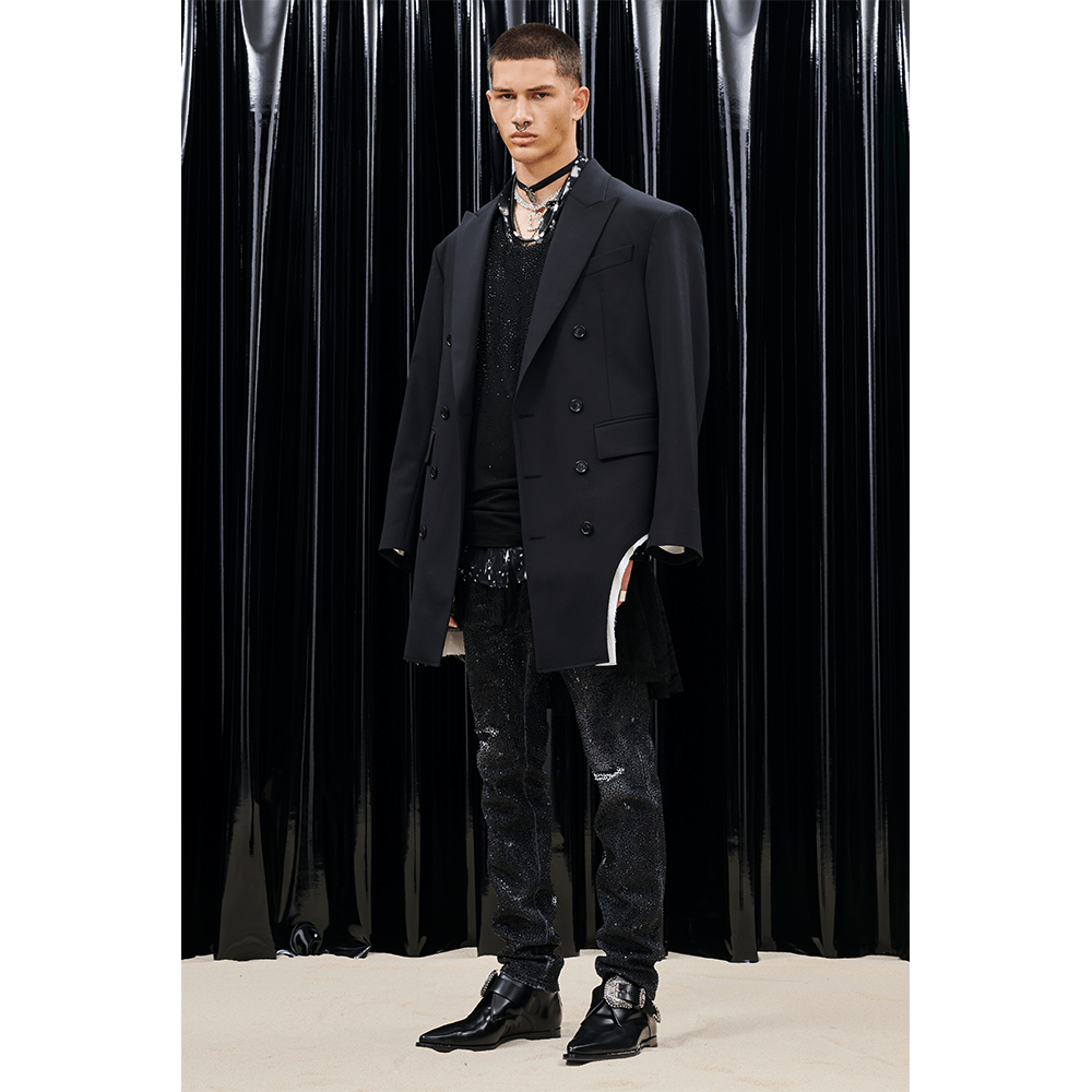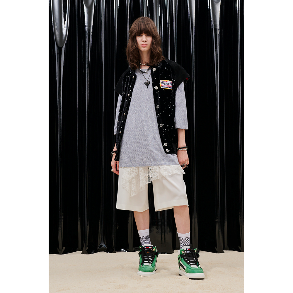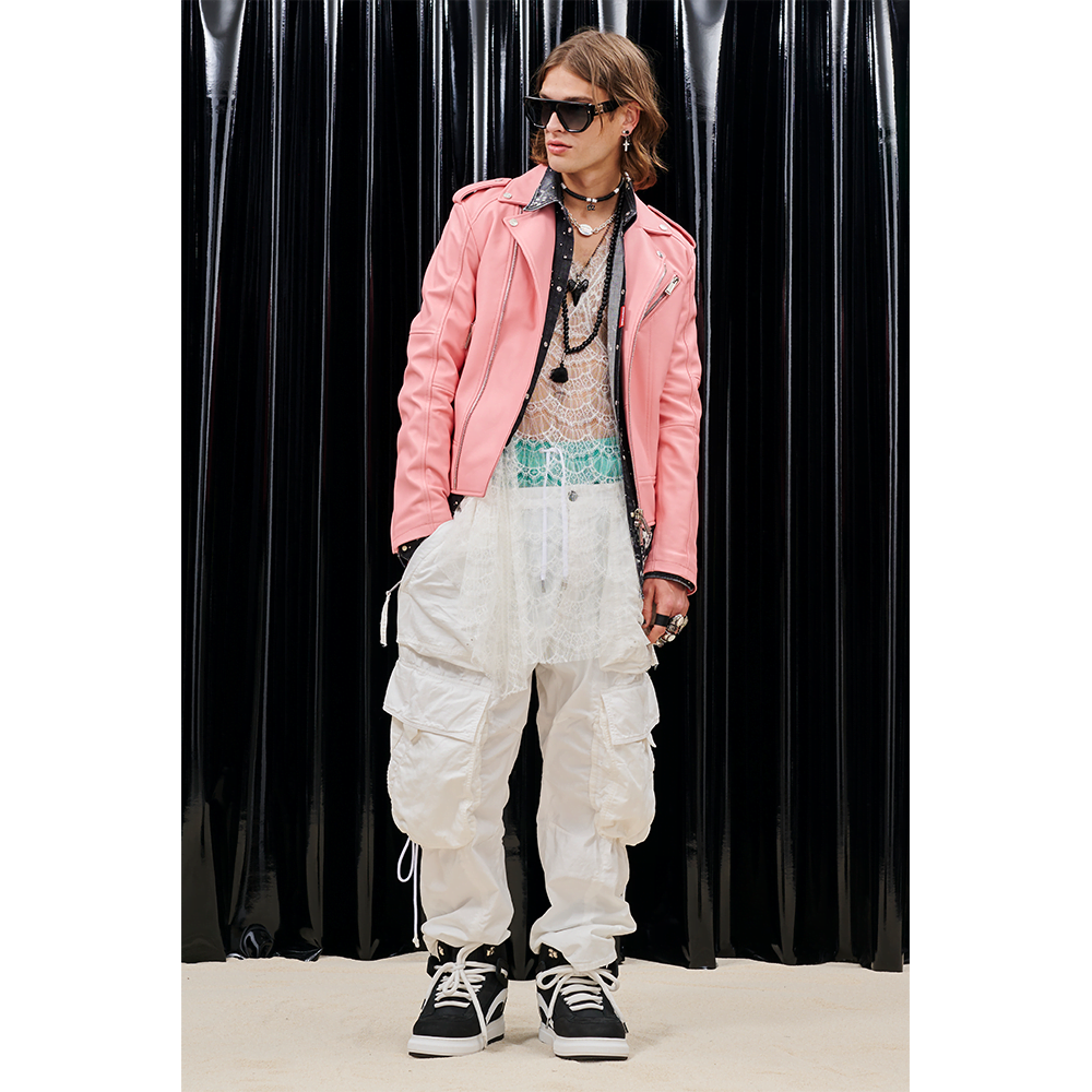 For women, intricate lace dresses are set atop graphic tees, cut-off blazers are paired with distressed baggy denim and slanted crop tops, while leather motorcycle sets are accompanied by 90s-inspired skate shoes and a bundle of deep-sea accessories. The transitional range delivers a euphoric spin, merging together powerful female characters through paint-splattered vests and oversized tees that sit next to acid-trimmed cocktail dresses and stud-encrusted undergarments.
