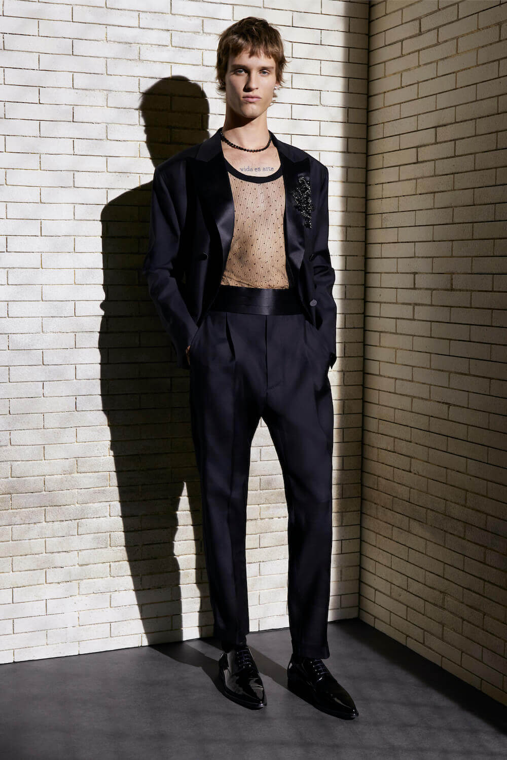 It was an array of nocturnal glamour that closed off the collection. For men, evening looks merged tuxedo tailoring with sheer underlayers and included an embroidered sequin tulle cummerbund draped-but built into the front of a white shirt. Every look was worn with shiny patent black loafers. For women, there were skimpy ruched bodycons in salt-and-pepper silver and neoprene co-ords spliced together with fishnet panels and mesh. It was all killer, no filler.