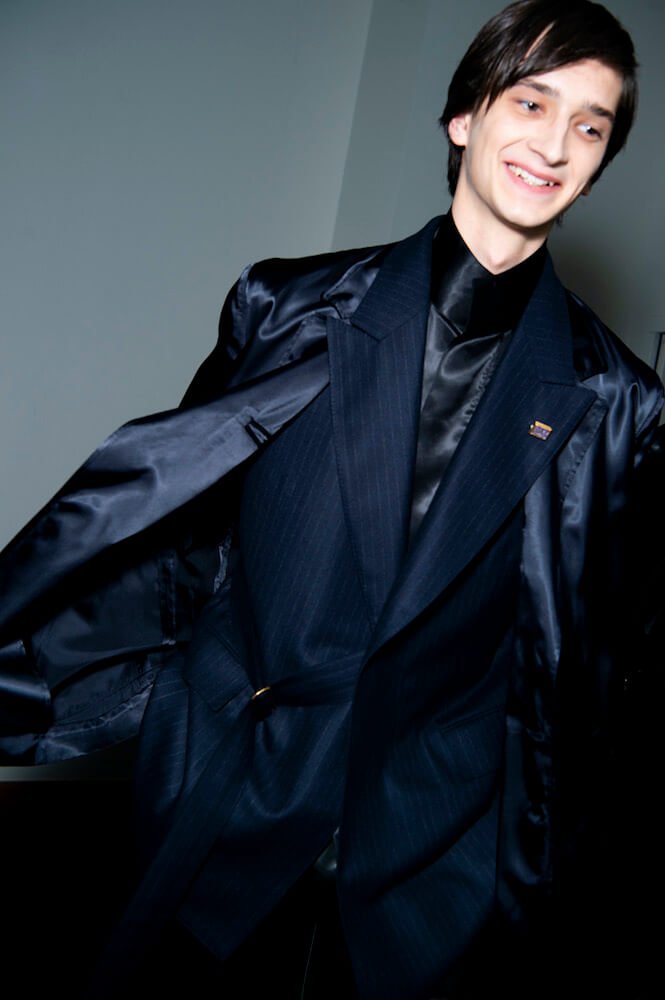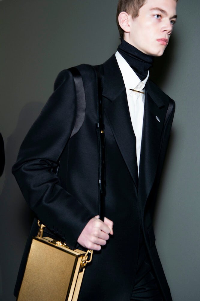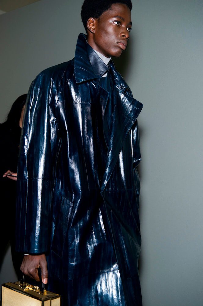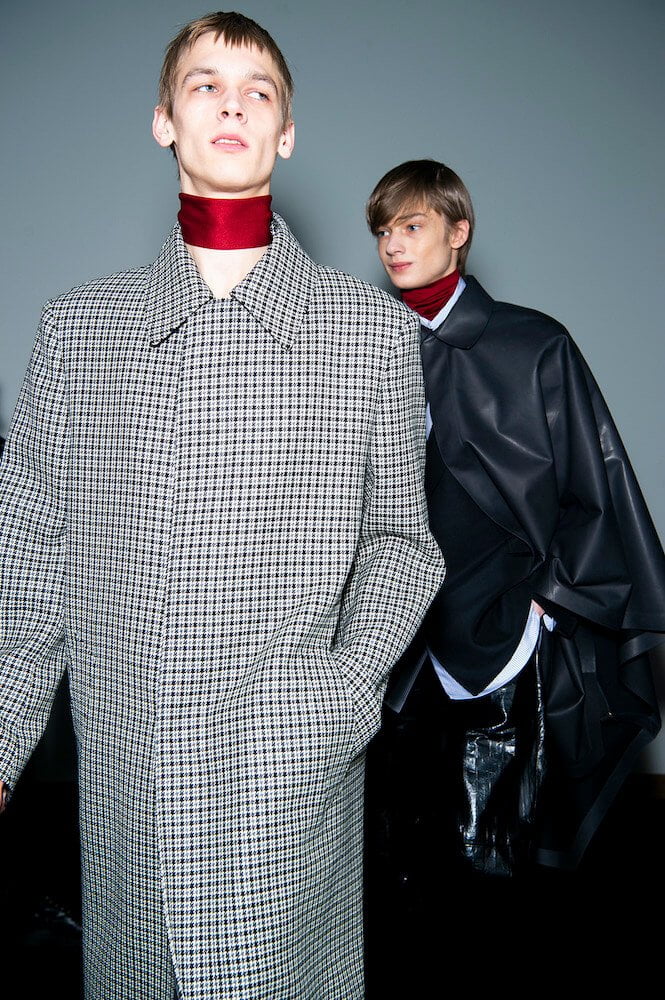 As ever, silhouettes were ace, as was the cuts, with strong shoulders and prominent collars being all the range. However, now more daring additions entered the mix. Royal blue and inky black shirts came in gorgeous satins, worn with skinny scarves styled like chokers. A crinkled PVC made several appearances, and looked particularly great when dyed a crimson red on a brilliant pair of trousers. Leather capes and cozy overcoats that were fitted with a belt fastening that started at the lining proved the strongest outerwear moments, whilst a selection of nifty mini-trunks will undoubtedly win over a new slew of Dunhill devotees.