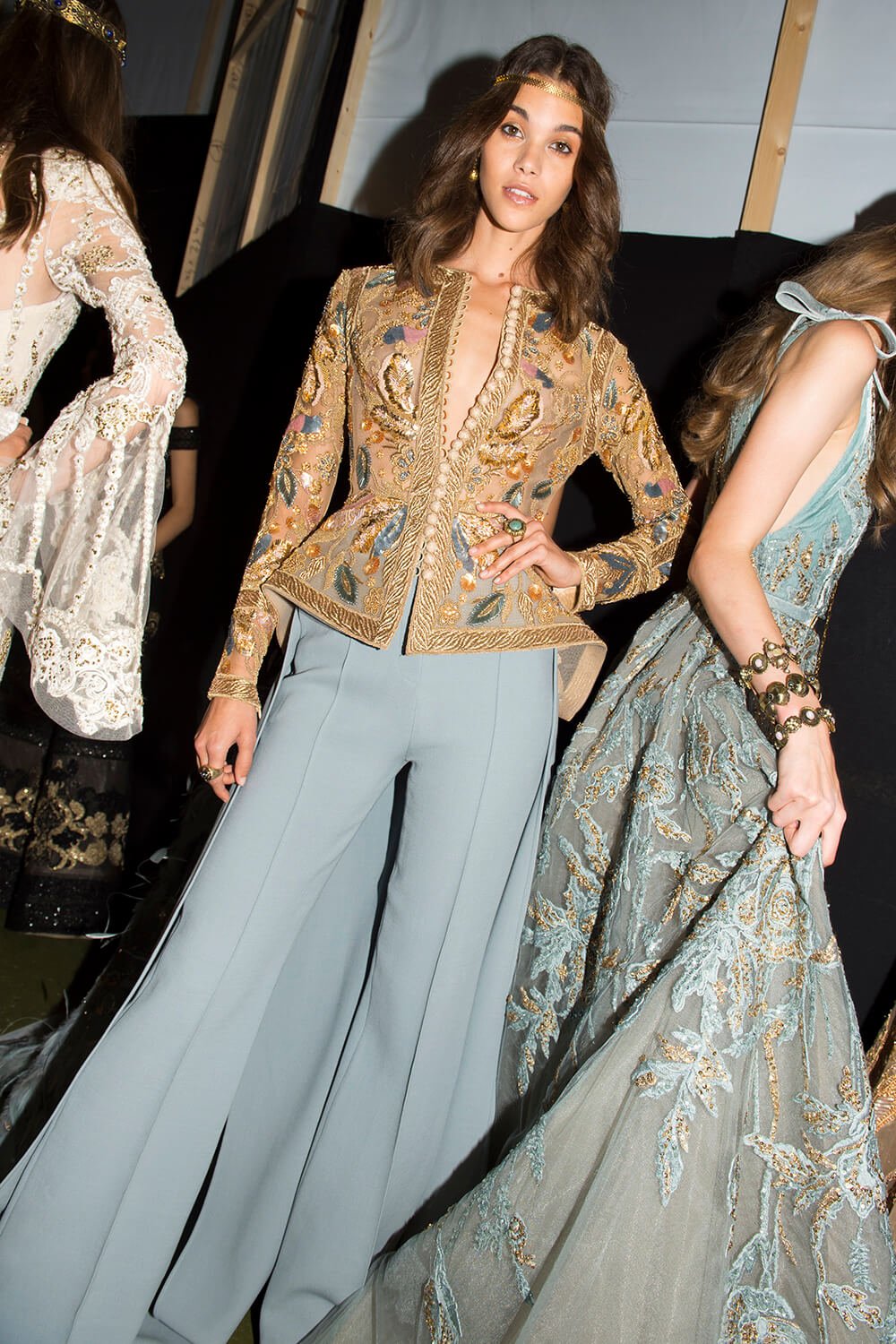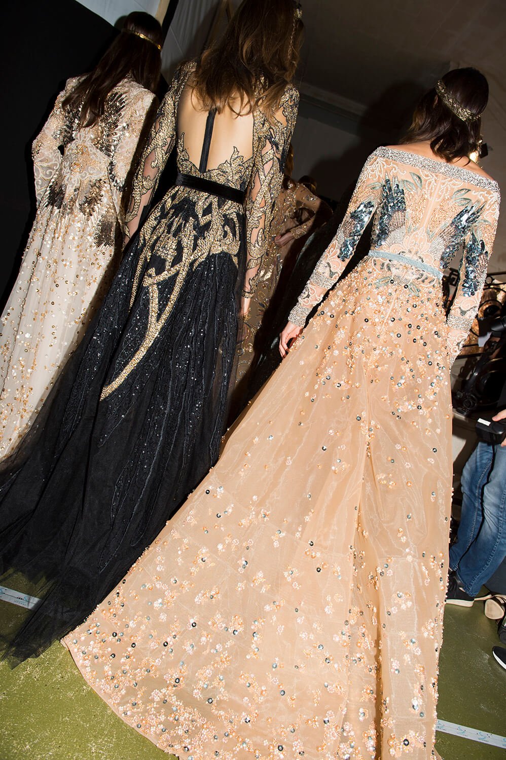 And what better at to bid battle than in yards of chiffon, mouseline and tulle? Because Elie Saab is, and always will be, about fantasy gowns – but here they were toughened up with beaded bodices that cinched the waist, or long overcoats with flared bell sleeves. Something about the fit of the gown suggested armour, sculpting the girl’s bodies and long in the arms, plunging at the neckline. It finished, as an Elie Saab couture show always does, with a bride – this time in gold, hooded and with a train so long that it took two models to carry it after her. If you can’t do a two-man train at couture, when can you?