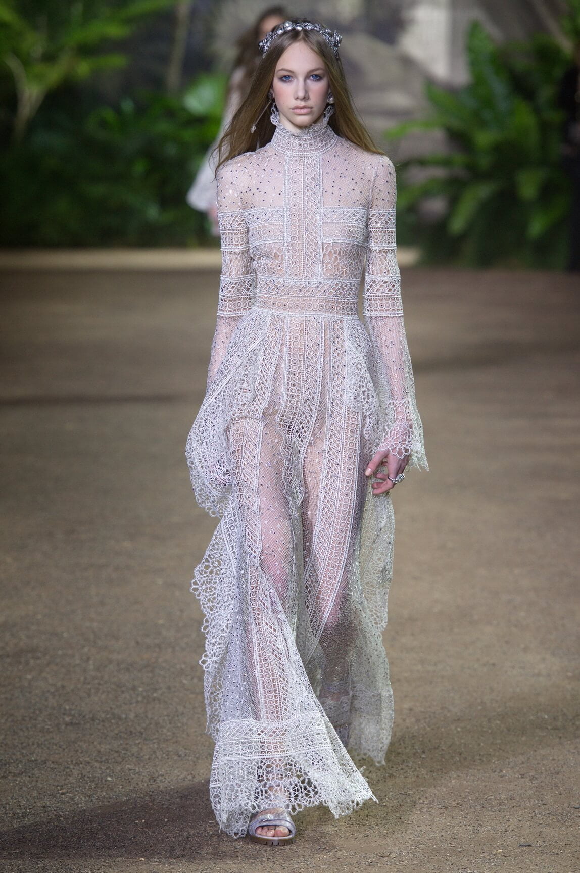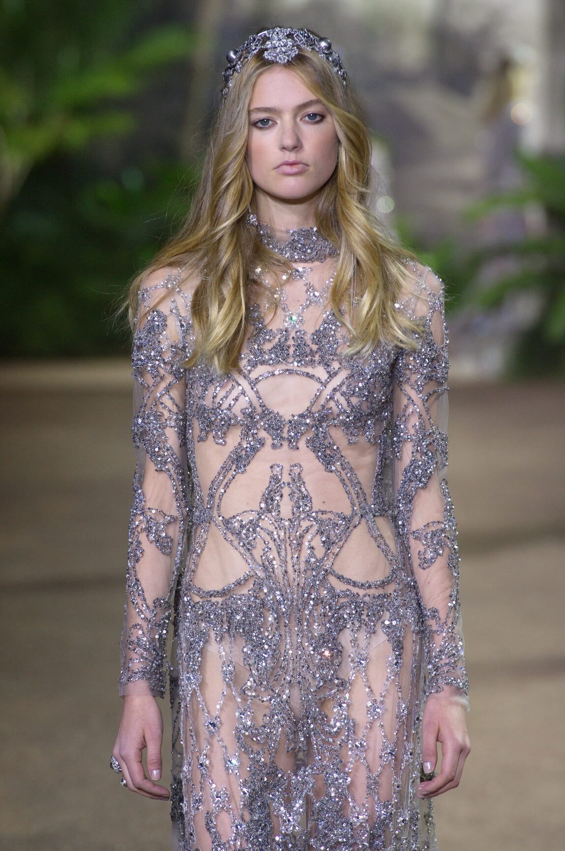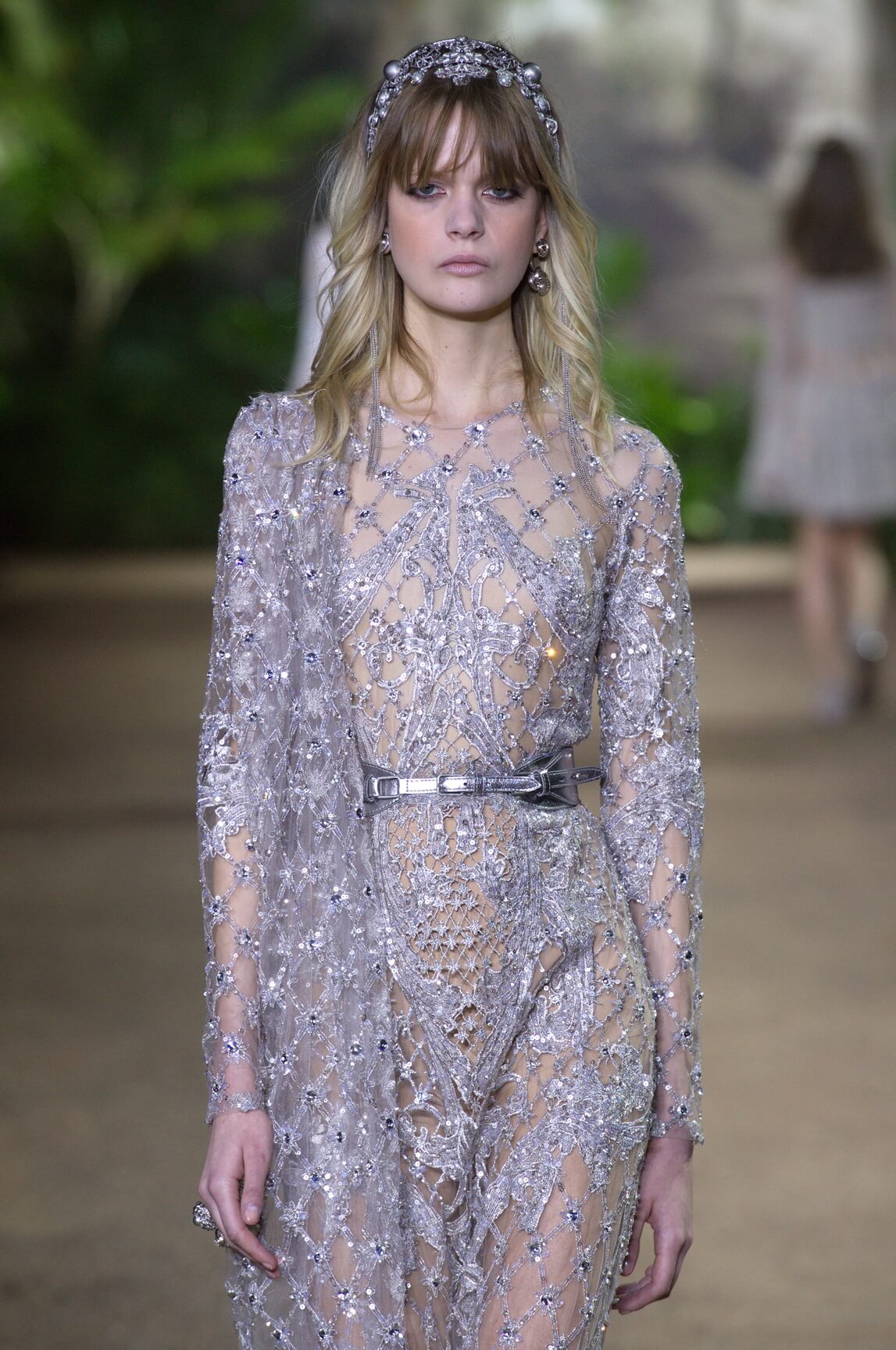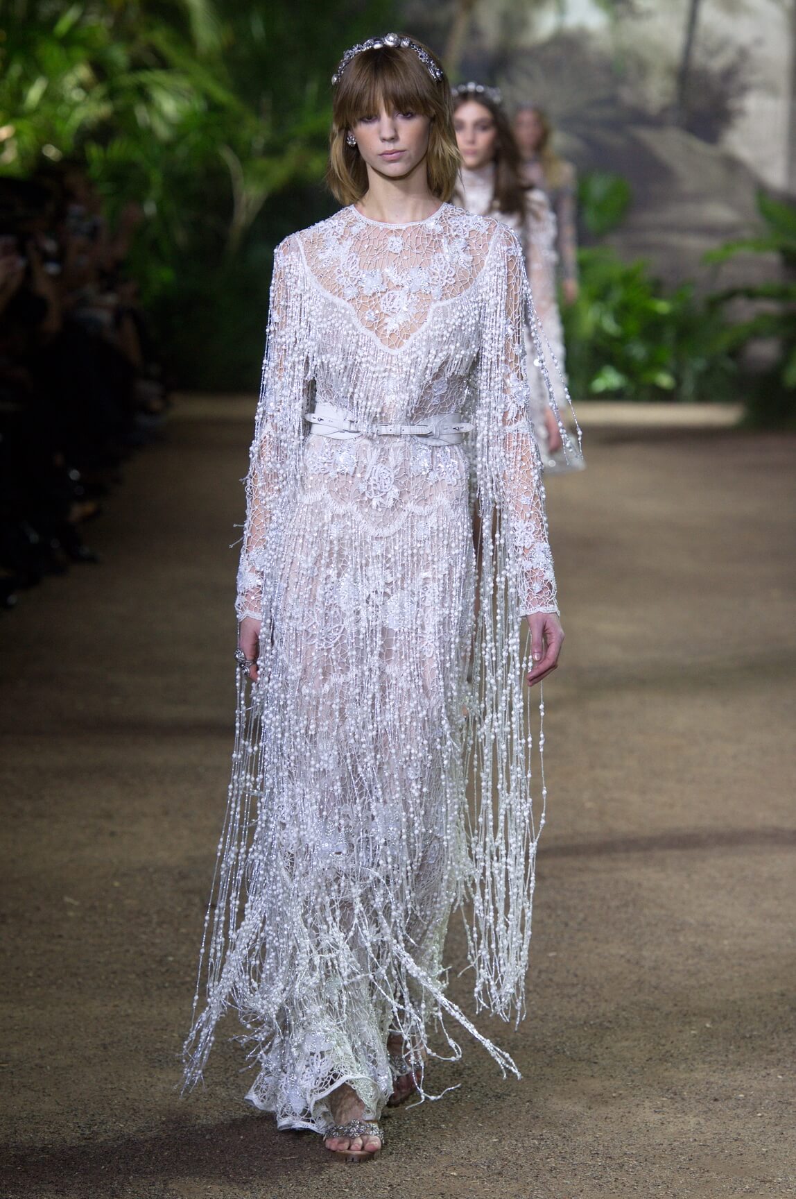 Elie Saab looked to India – Maharanis and Raj ladies, richly dressed in sumptuous layers of embroideries and lace – for his spring 2016 haute couture collection. That wound up transposing the riches of that subcontinent – embroideries, silks, exuberant sari drapes – into dresses that echoed the finest French haute couture. The finale wedding gown, a glittering golden crinoline modelled by Anna Cleveland and draped with a whisper-find tulle veil, was the sublime summation of the approach. The colour palette was muted, shades of white, grey, platinum glitter and a soft Indian Ocean blue the subdued canvas to show off the toiletries for which Saab is internationally renowned, and indeed coveted. This season, there was much ado about fringing, adding un peu d’animation to slender silhouettes with a hint of the Edwardian.