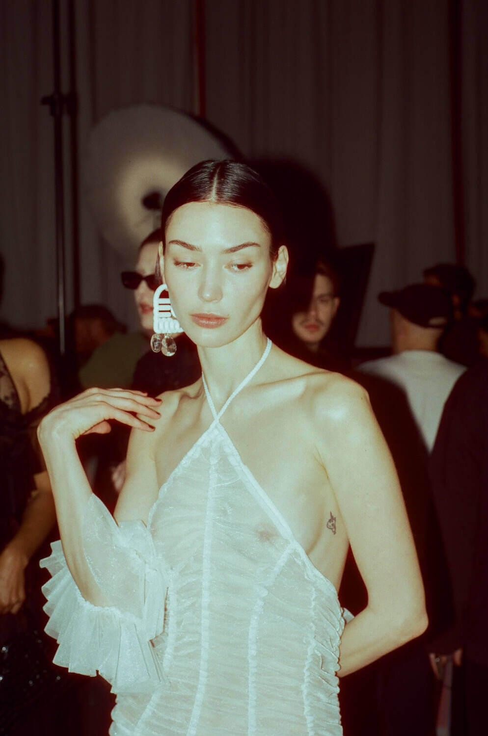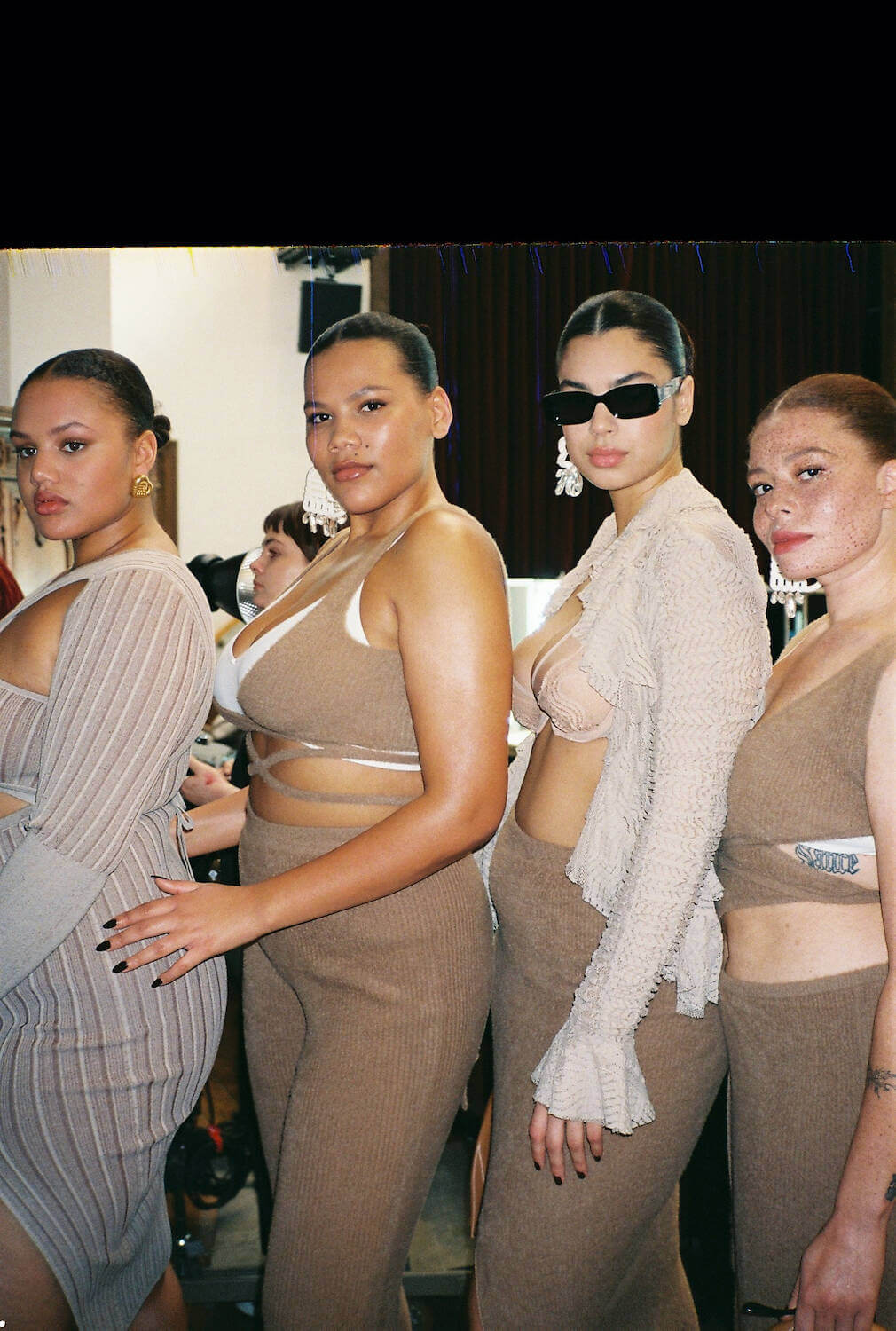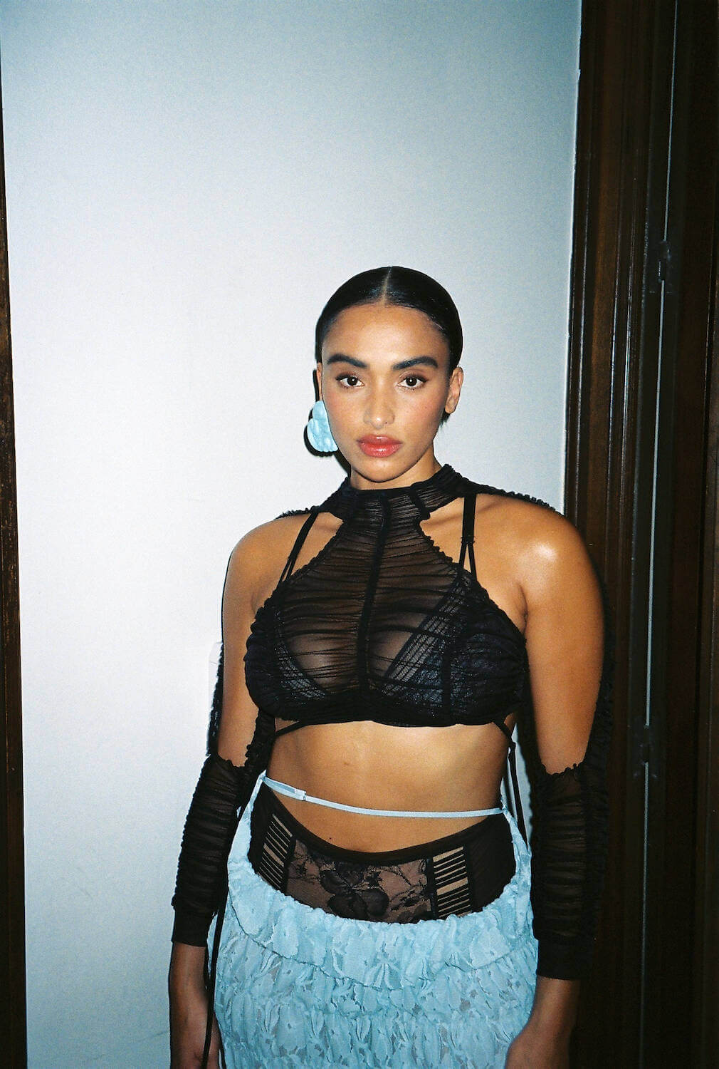 Textiles play a crucial role in the brand’s aesthetic which often uses clever ruching techniques, stretch, ribbed jersey, smocking and cutouts to create its sexy, elevated, see-through silhouettes. “We spend a lot of time in warehouses in the south and north of Paris to find deadstock fabrics,” Manas explains, “then mixing the fabrics we found together because it’s the only way we want to create collections.” The brand’s AW23 collection, for example, was manufactured using 90 percent deadstock. Manas goes on to explain that 80 percent of the materials they use offer some kind of elastication, but that she prefers to play with ruching in order to “welcome a lot of aspects of size”.