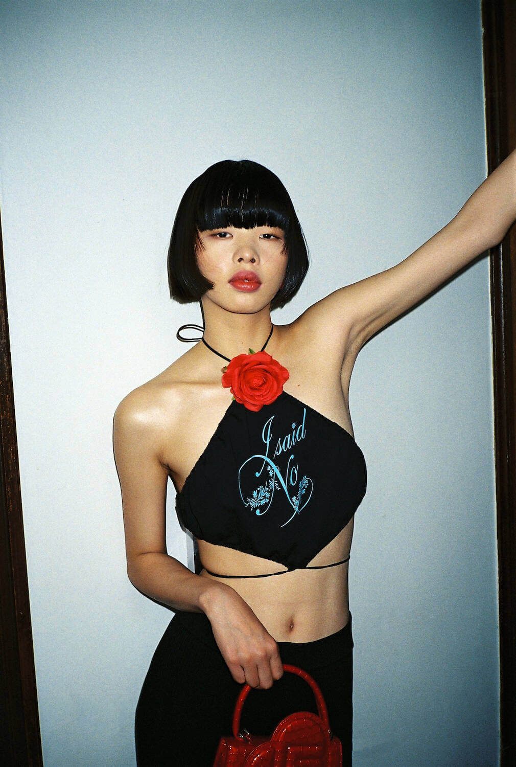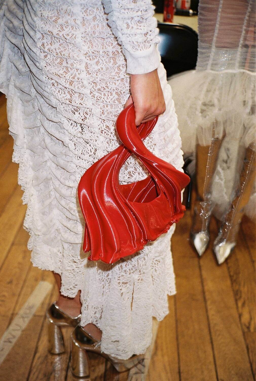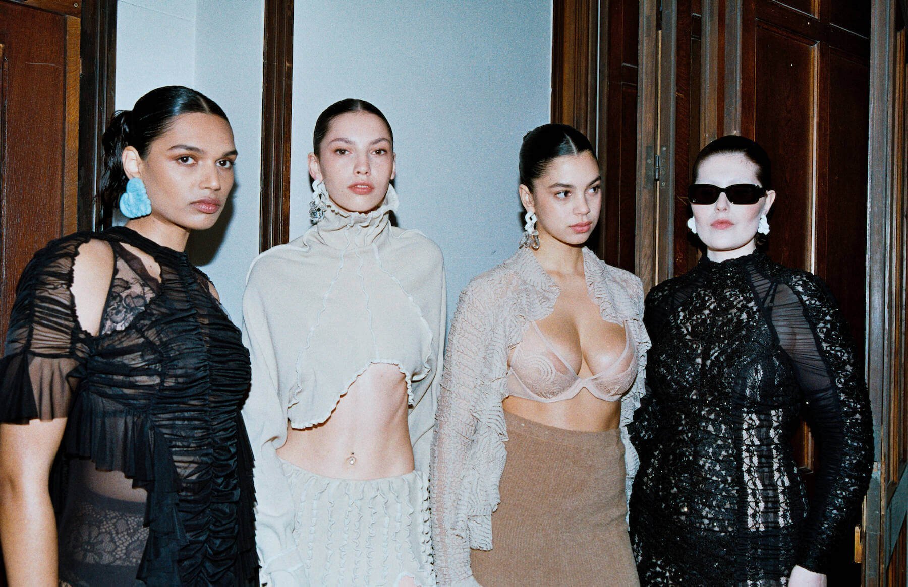Textiles play a crucial role in the brand’s aesthetic which often uses clever ruching techniques, stretch, ribbed jersey, smocking and cutouts to create its sexy, elevated, see-through silhouettes. “We spend a lot of time in warehouses in the south and north of Paris to find deadstock fabrics,” Manas explains, “then mixing the fabrics we found together because it’s the only way we want to create collections.” The brand’s AW23 collection, for example, was manufactured using 90 percent deadstock. Manas goes on to explain that 80 percent of the materials they use offer some kind of elastication, but that she prefers to play with ruching in order to “welcome a lot of aspects of size”.