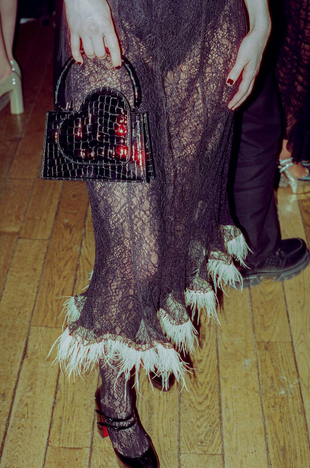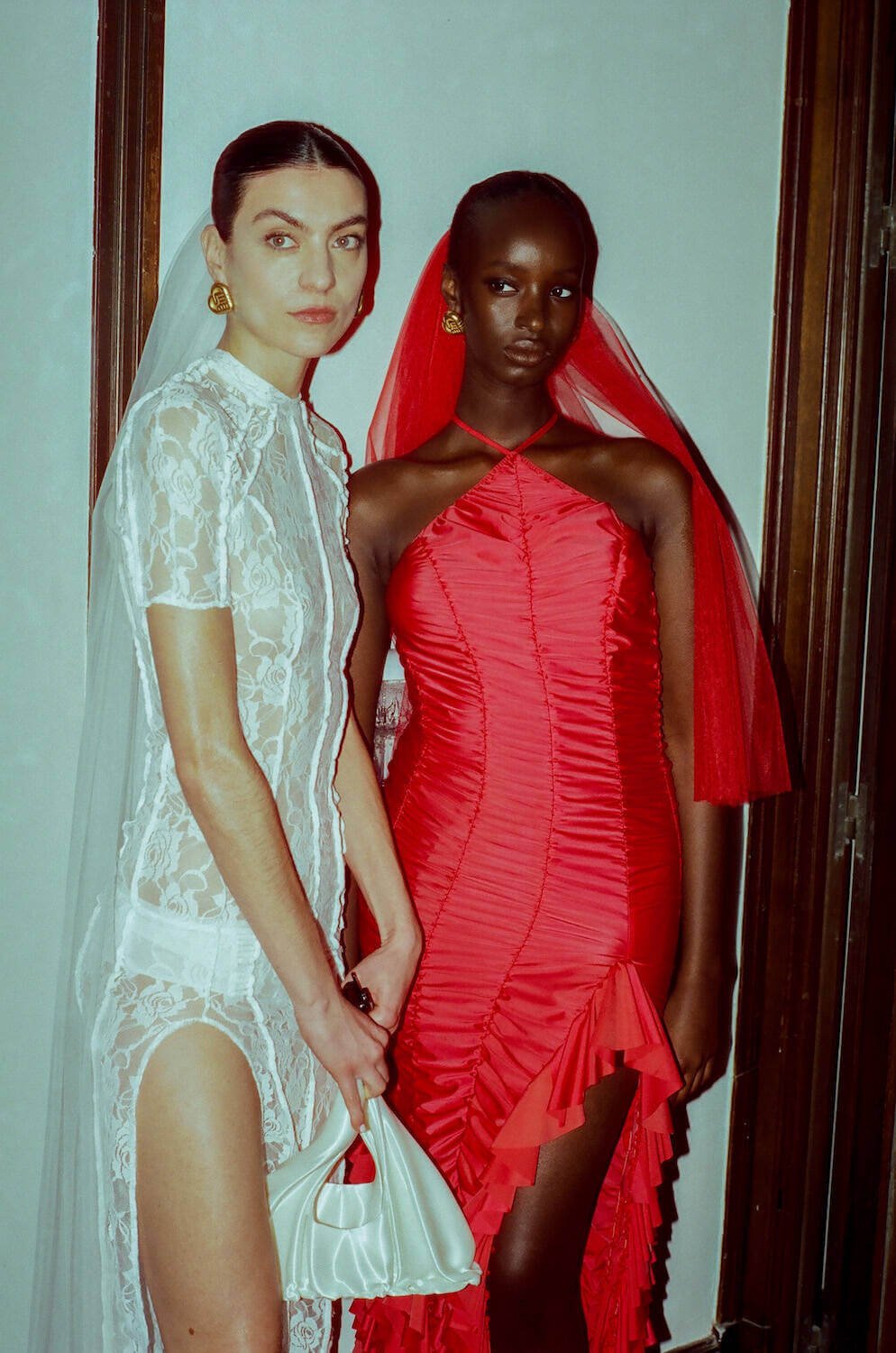 Their impending wedding actually served as inspiration for their AW23 collection, a playfully feminine line-up aptly named For Better Or For Worse. “It’s the first time we really used personal stuff to help design a collection,” Delepierre reflects, “and that was quite a challenge because we don’t like doing that that much.” Using their own nuptials as the starting point, the duo wanted to design a “dreamy”, fantasy ceremony. “We chose to do it in a super intense way because obviously our real wedding won’t look like that,” he continues. “There were a lot of inside jokes because we were thinking about the characters you can find at a wedding – the drunk best friend, the grandma, the mum – and we thought, ‘Oh, we would love to dress them’. Then we started the design process.”