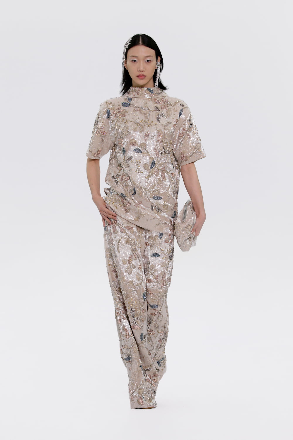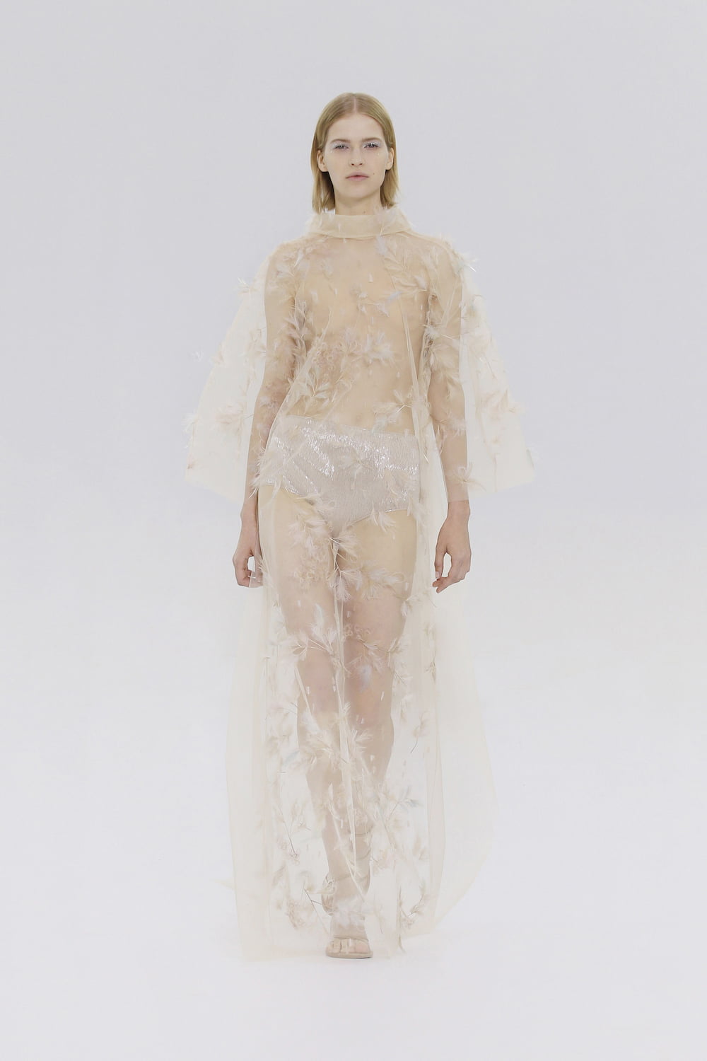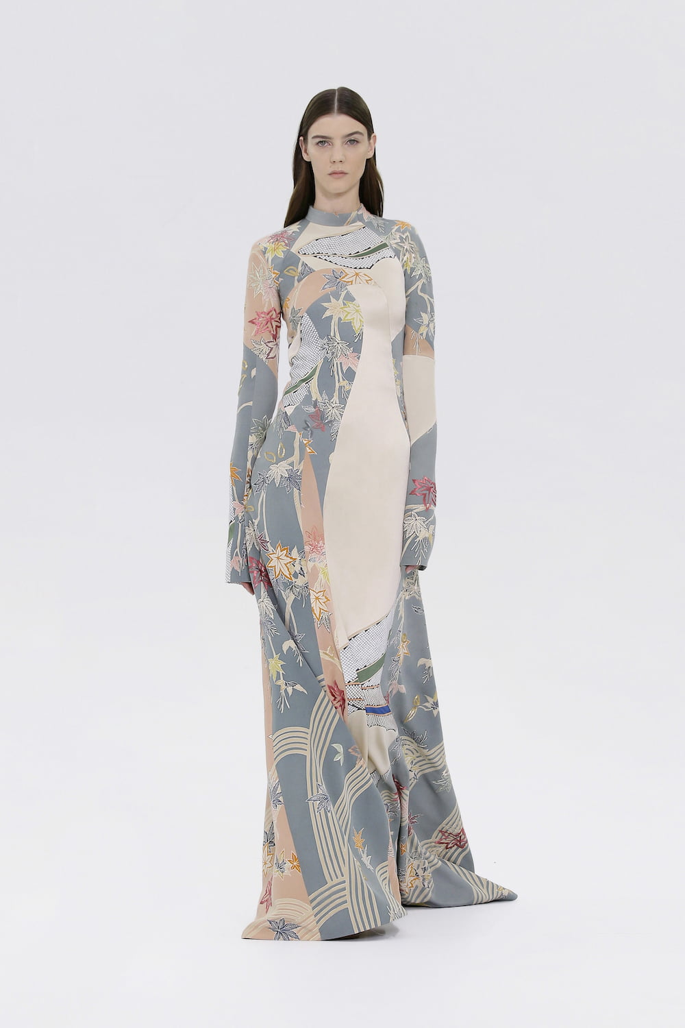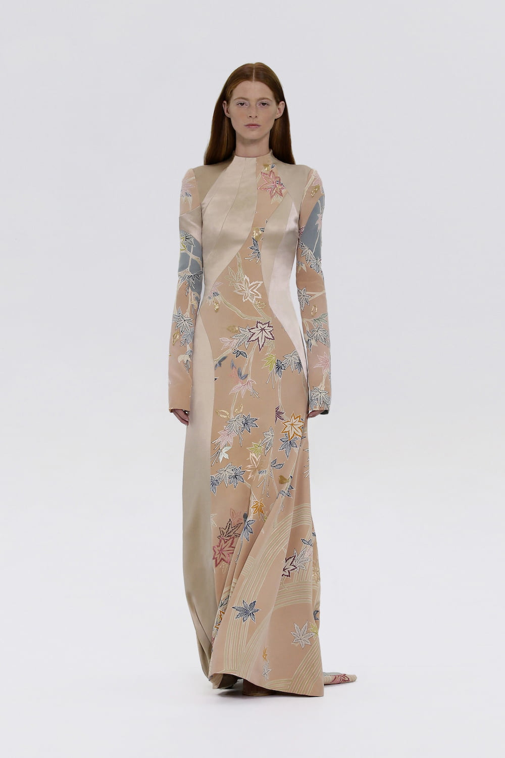 Kim Jones’ haute couture collection for Fendi began with a trip to Japan in March, before the borders had opened. “I managed to get in. I was so determined. I used to go six times a year. I love it so much,” he said during a preview. “We went to see a number of the suppliers we’ve always worked with on special projects, and I bought all these fragments of 17th-century kimonos. Just pieces of hand-painted silk fabric.” The antique pieces inspired him to contact a family of fabric-makers in Kyoto, who recreated and reinterpreted traditional Kata Yuzen motifs for the collection. Jones employed the patterns in long monastic column dresses that appeared like fragments pieced together, and in floral embroideries on transparent garments that included t-shirts, the haute couture way. “It’s pretty light. I wanted lightness in the clothes this season, also in terms of how the embroideries were done,” he explained. The show opened with a pair of tailoring looks constructed in the finest vicuna, a tactility Jones went on to evoke in long knitted dresses. “I wanted to have some light knitwear pieces for, you know, that jet-set lifestyle of the client. They can wear that on the plane and get off and still fabulous.” As the show progressed, his silhouettes became lighter and lighter until the dresses became almost embroidered overlays floating on the skin. “I love the colours,” Jones said of his earthy tones and muted pastels. “I’m really happy with it.”