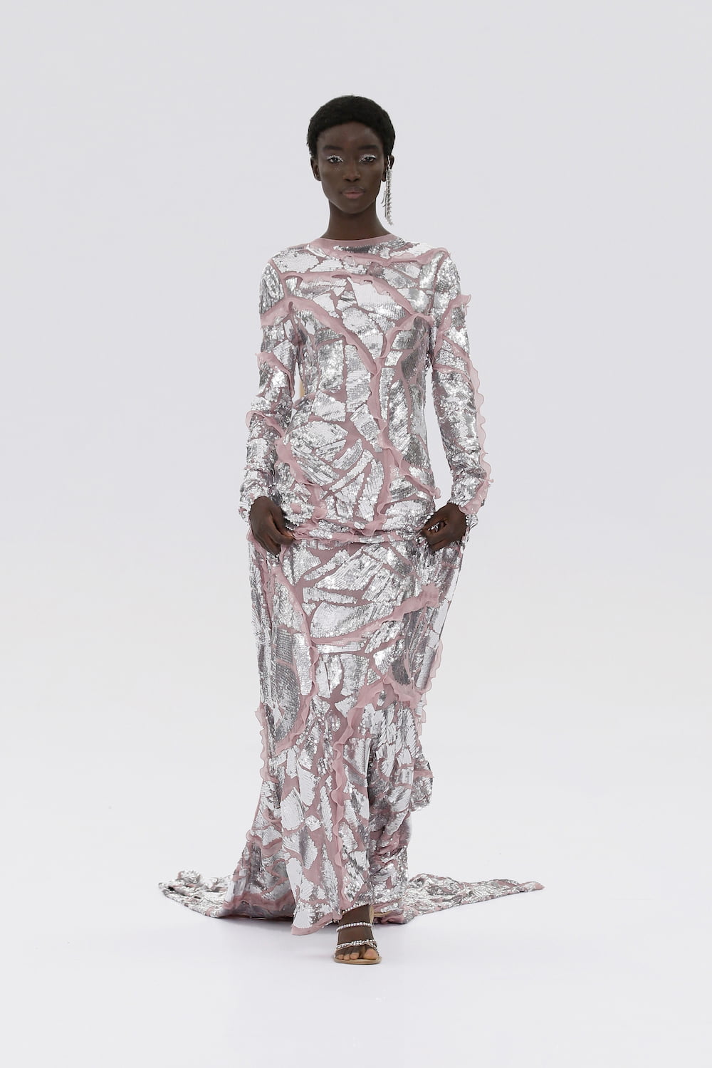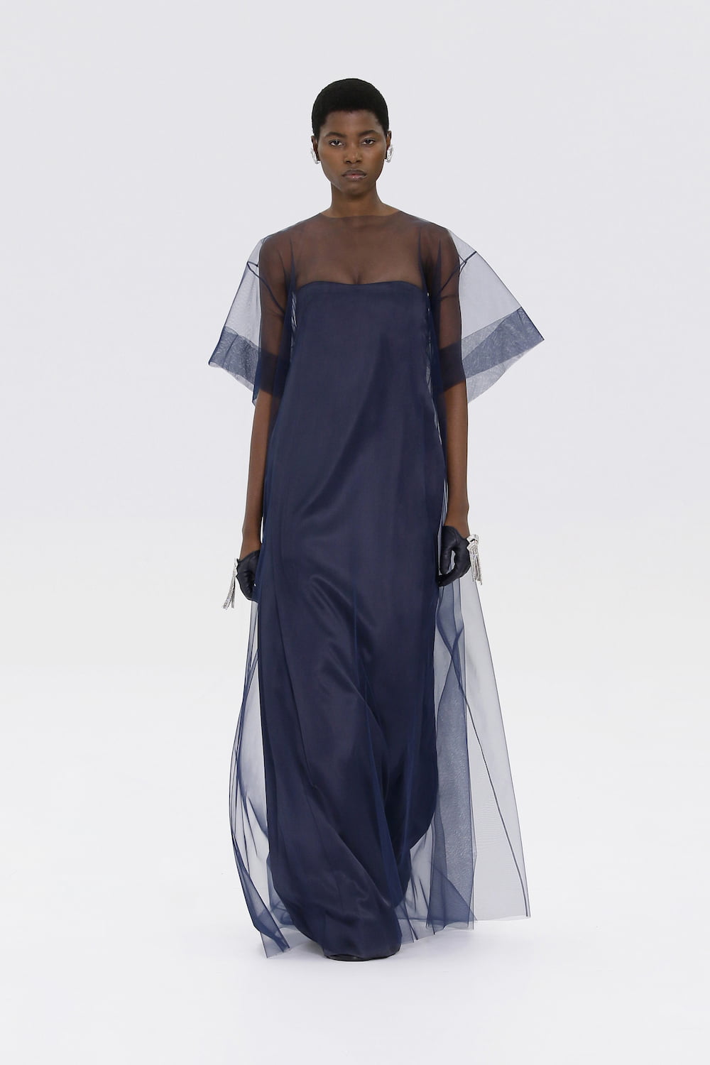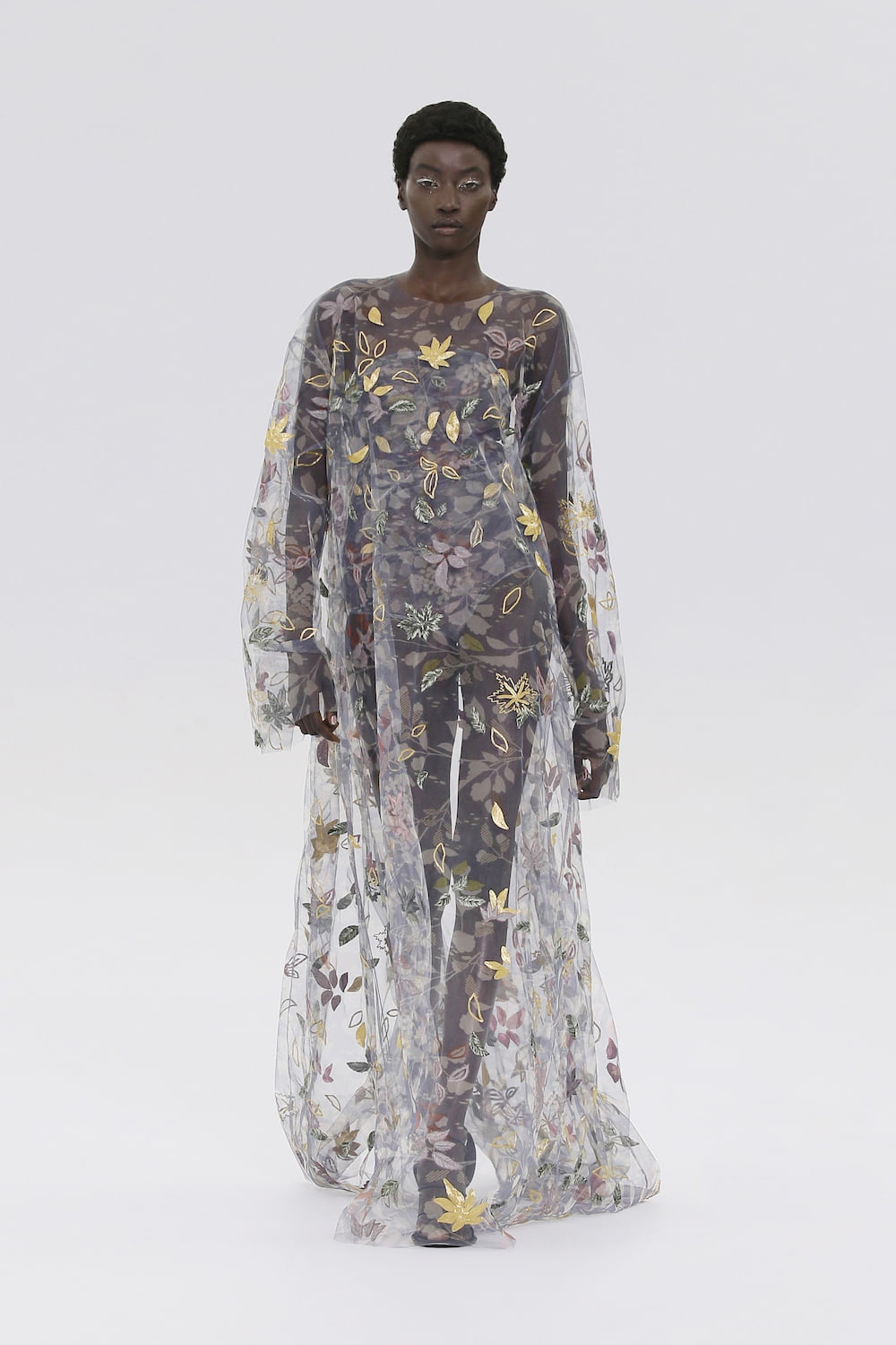 Kim Jones’ haute couture collection for Fendi began with a trip to Japan in March, before the borders had opened. “I managed to get in. I was so determined. I used to go six times a year. I love it so much,” he said during a preview. “We went to see a number of the suppliers we’ve always worked with on special projects, and I bought all these fragments of 17th-century kimonos. Just pieces of hand-painted silk fabric.” The antique pieces inspired him to contact a family of fabric-makers in Kyoto, who recreated and reinterpreted traditional Kata Yuzen motifs for the collection. Jones employed the patterns in long monastic column dresses that appeared like fragments pieced together, and in floral embroideries on transparent garments that included t-shirts, the haute couture way. “It’s pretty light. I wanted lightness in the clothes this season, also in terms of how the embroideries were done,” he explained. The show opened with a pair of tailoring looks constructed in the finest vicuna, a tactility Jones went on to evoke in long knitted dresses. “I wanted to have some light knitwear pieces for, you know, that jet-set lifestyle of the client. They can wear that on the plane and get off and still fabulous.” As the show progressed, his silhouettes became lighter and lighter until the dresses became almost embroidered overlays floating on the skin. “I love the colours,” Jones said of his earthy tones and muted pastels. “I’m really happy with it.”