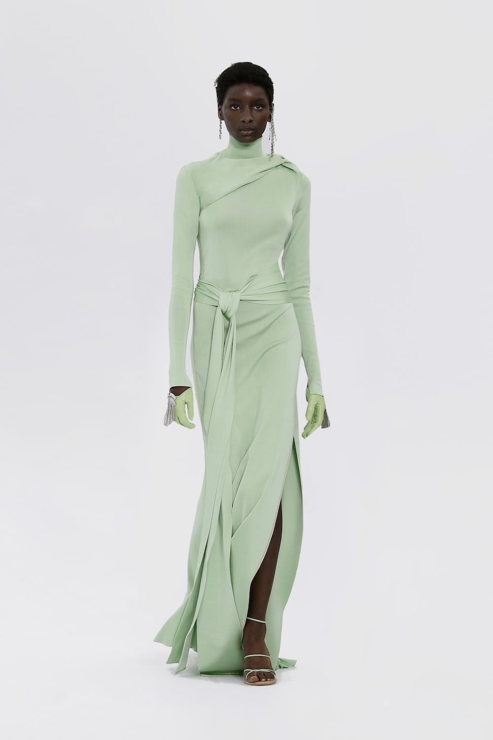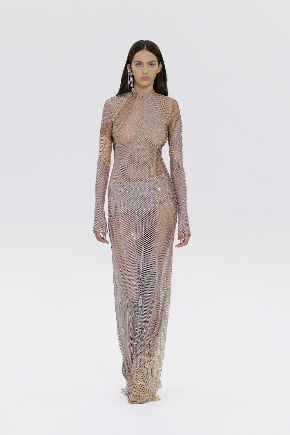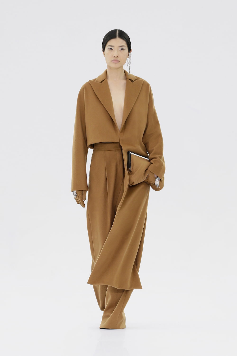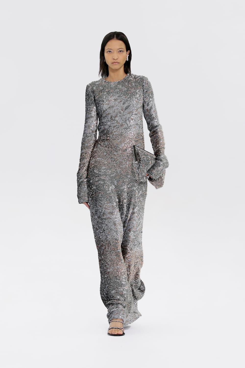 Kim Jones’ haute couture collection for Fendi began with a trip to Japan in March, before the borders had opened. “I managed to get in. I was so determined. I used to go six times a year. I love it so much,” he said during a preview. “We went to see a number of the suppliers we’ve always worked with on special projects, and I bought all these fragments of 17th-century kimonos. Just pieces of hand-painted silk fabric.” The antique pieces inspired him to contact a family of fabric-makers in Kyoto, who recreated and reinterpreted traditional Kata Yuzen motifs for the collection. Jones employed the patterns in long monastic column dresses that appeared like fragments pieced together, and in floral embroideries on transparent garments that included t-shirts, the haute couture way. “It’s pretty light. I wanted lightness in the clothes this season, also in terms of how the embroideries were done,” he explained. The show opened with a pair of tailoring looks constructed in the finest vicuna, a tactility Jones went on to evoke in long knitted dresses. “I wanted to have some light knitwear pieces for, you know, that jet-set lifestyle of the client. They can wear that on the plane and get off and still fabulous.” As the show progressed, his silhouettes became lighter and lighter until the dresses became almost embroidered overlays floating on the skin. “I love the colours,” Jones said of his earthy tones and muted pastels. “I’m really happy with it.”