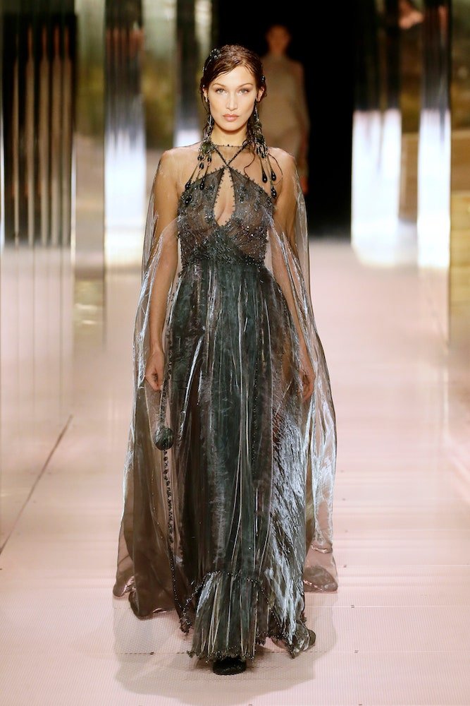 Moore, made her way around a vast glass vitrine maze punctuated by a library of rare Bloomsbury Group first editions, indoor gardens and private places for reflection. She was followed by Bella Hadid in a gossamer grey cape over a beaded bias-cut slip. Then Lila Moss appeared, looking like a modernist angel in a sheer pearl-encrusted caped gown. Her mother Kate was next, in an empire line dress the colour of liquid Mercury.