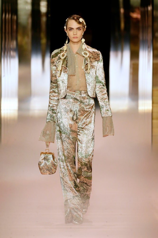With every look, Jones made his intentions for Fendi clear. The clothes are utterly beautiful, womanly, timeless and rooted in craft. Jones was inspired by the Bloomsbury Group, a fascination he’s nurtured since his boyhood, spent in the shadow of Virginia Woolf’s Sussex home. Her era-hopping, gender-morphing Orlando was a seminal text, and inspiration for the metal-bound ‘book’ clutches carried by Jones’s stellar cast of models including Naomi Campbell, Christy Turlington, Cara Delevingne, Adwoa and Kesewa Aboah.