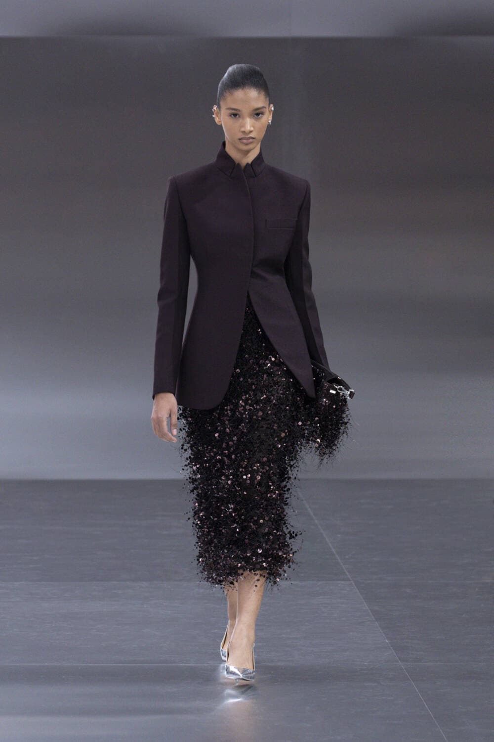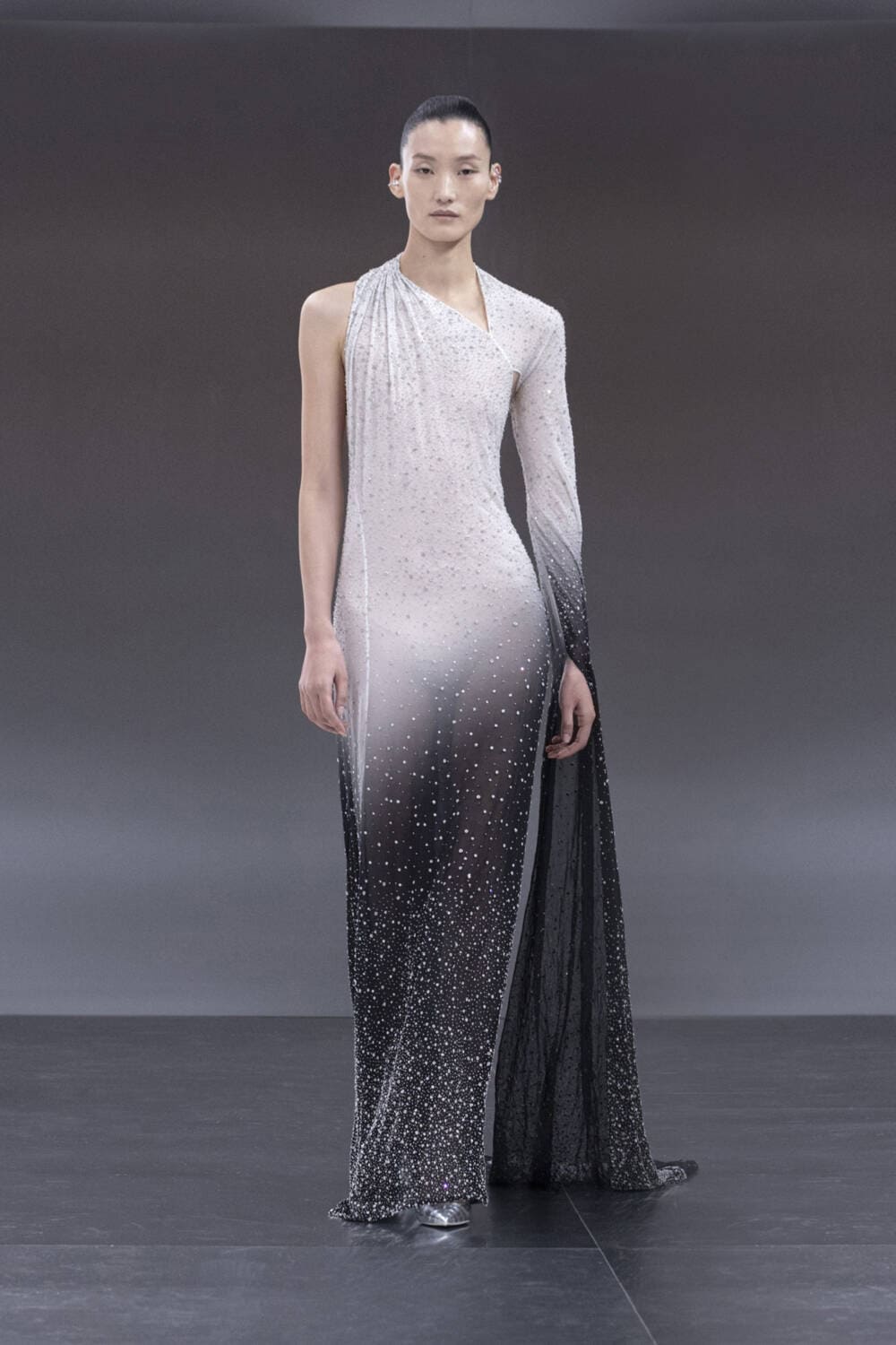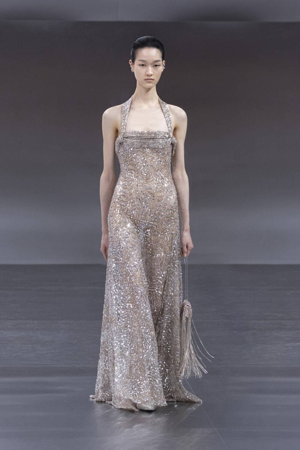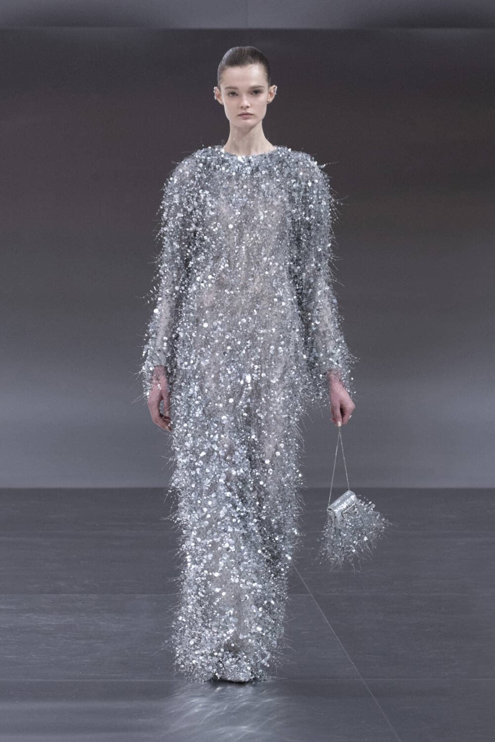 The clothes that came out were streamlined and evoked an effortless mood of modern elegance with an added touch of glamour – it was couture after all. Beginning and ending with a new ‘Scatola’ silhouette – meaning ‘box’ – geometry anchored the range. One was jet black, striking in its absence of complexity; the other was a muted silver, festooning with a labyrinth of shimmering beads, decadent and indulgent. And between them, fresh fabrications were sculpted into skinny suits, flimsy translucent gowns and fur that wasn’t fur, but rather embroidery. There were ultra-fine rib knit dresses tethered with knotted Shibari (Japanese rope bondage) harnesses and a dance between decoration and structure emerged on ankle-length skirts and evening gloves decked with feather-like, all-over fringe.