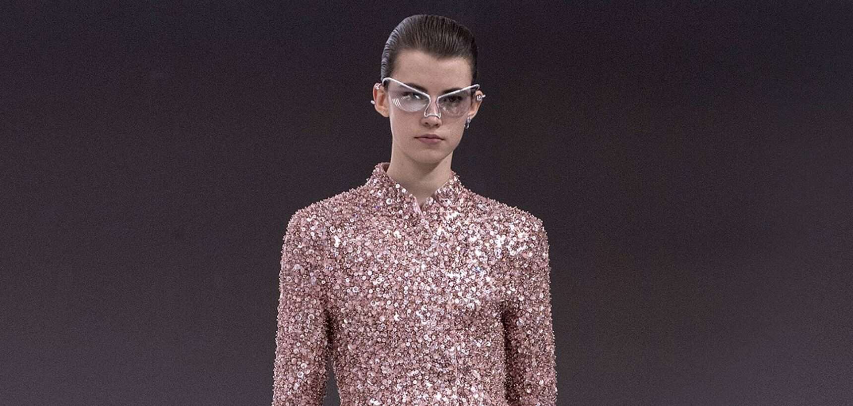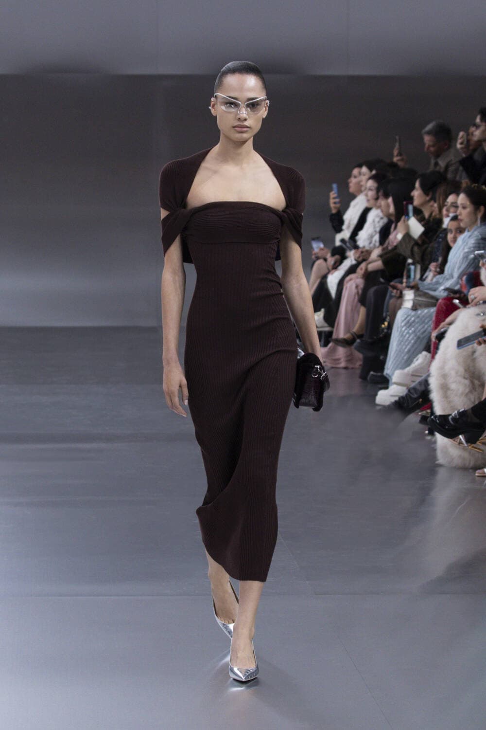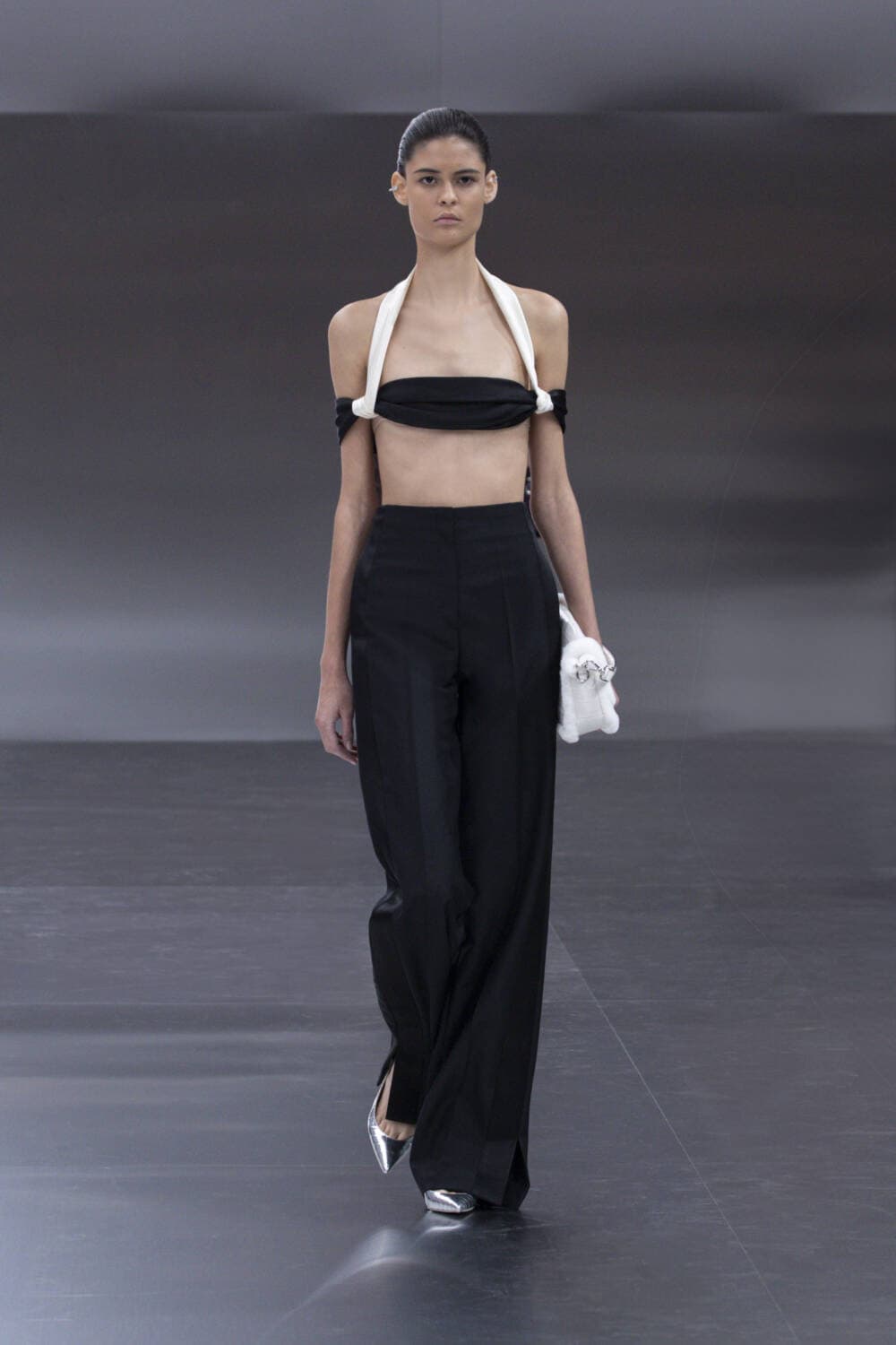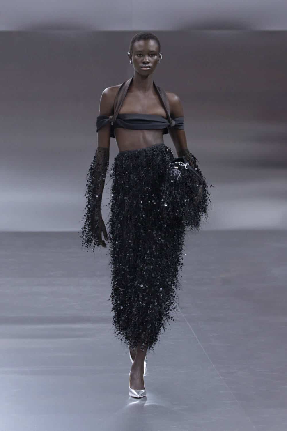 The clothes that came out were streamlined and evoked an effortless mood of modern elegance with an added touch of glamour – it was couture after all. Beginning and ending with a new ‘Scatola’ silhouette – meaning ‘box’ – geometry anchored the range. One was jet black, striking in its absence of complexity; the other was a muted silver, festooning with a labyrinth of shimmering beads, decadent and indulgent. And between them, fresh fabrications were sculpted into skinny suits, flimsy translucent gowns and fur that wasn’t fur, but rather embroidery. There were ultra-fine rib knit dresses tethered with knotted Shibari (Japanese rope bondage) harnesses and a dance between decoration and structure emerged on ankle-length skirts and evening gloves decked with feather-like, all-over fringe.