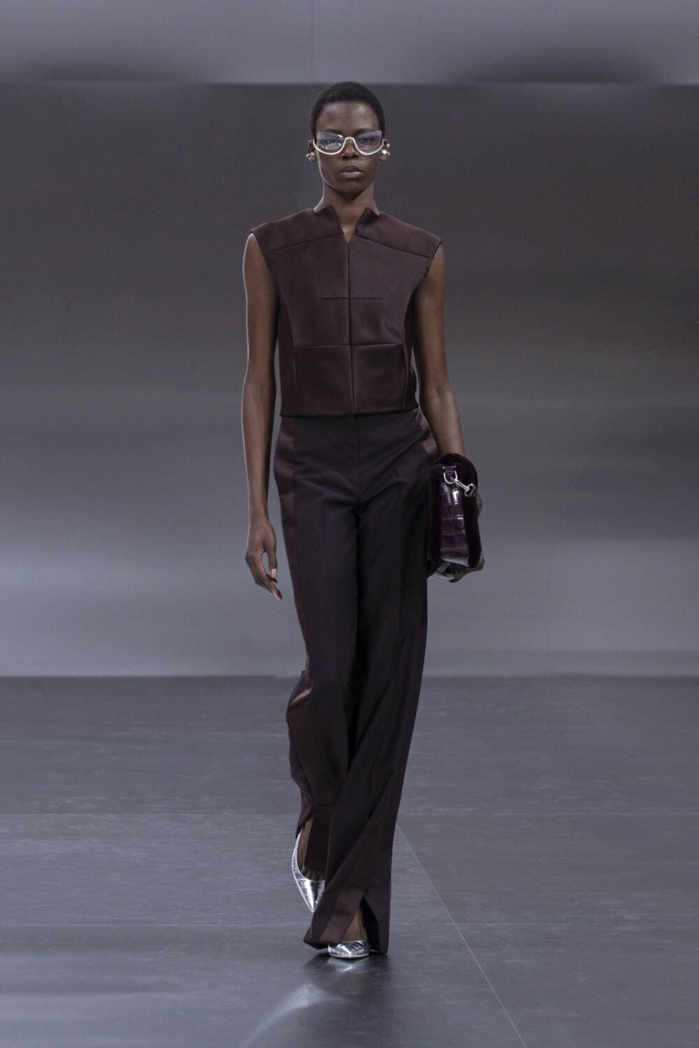 Stepping to the precise and emotional soundscaping of renowned composer and longtime collaborator Max Richter, models carried bespoke Fendi Baguettes in a variety of sizes by Silvia Venturini Fendi in the same materials as the clothes. She also introduced a new line of ‘Gems’ Baguettes which were created with 18k white gold hardware and white diamond-pave-encrusted buckles or platinum leaf. Individually tailored ‘Singular Vision’ fine eyewear by Delfina Delettrez Fendi rested atop noses.