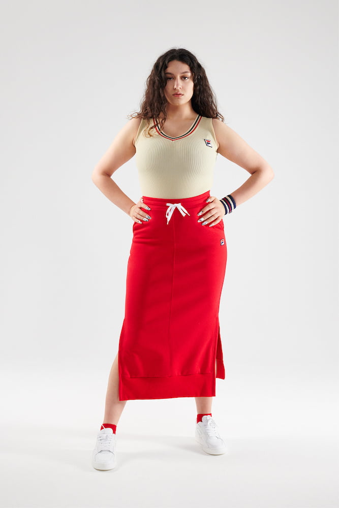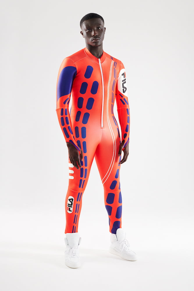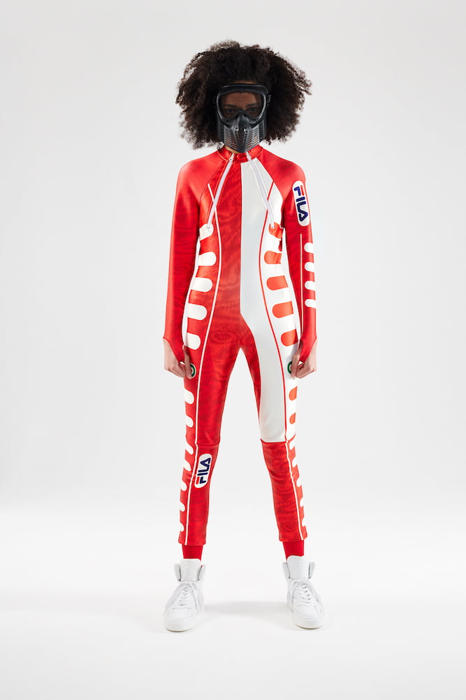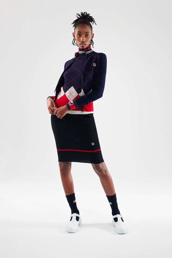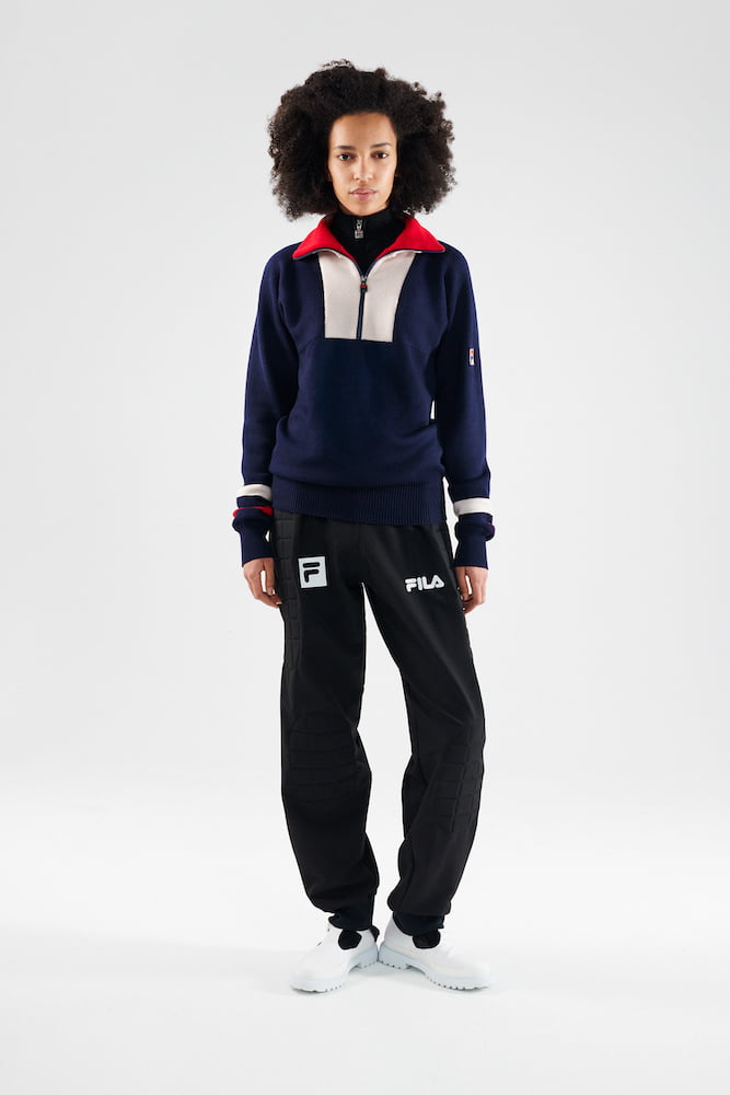 Touring between the pillars of Fila’s history – tennis, golf and motorsports included – Grand curated a wardrobe informed by the past but firmly grounded to the styles of today. Argyle knits, roomy shellsuits and name-plated swimsuits come alongside sporty pencil skirts and bobsleighing lycra get-ups (with matching Fila nails to match).