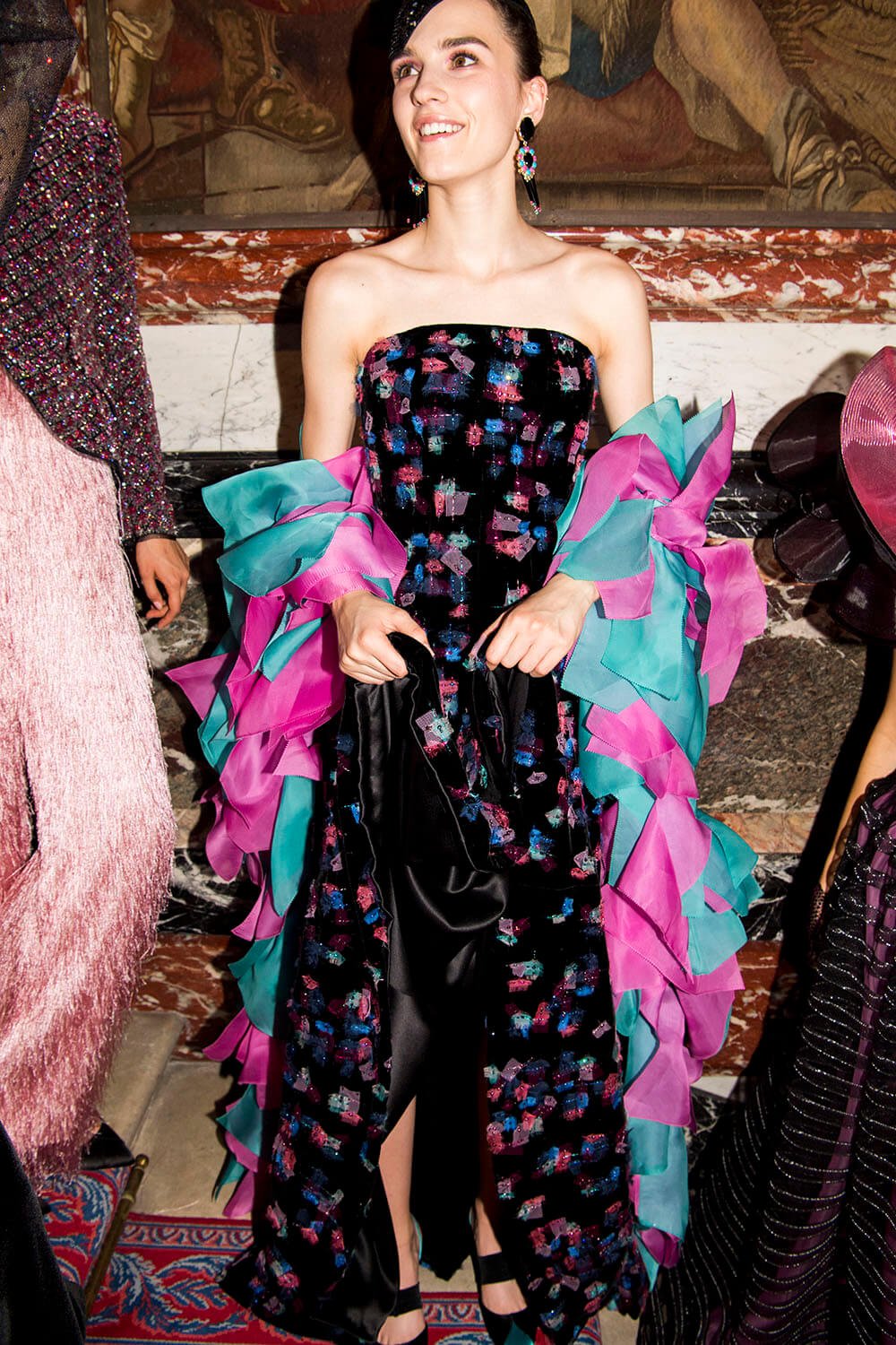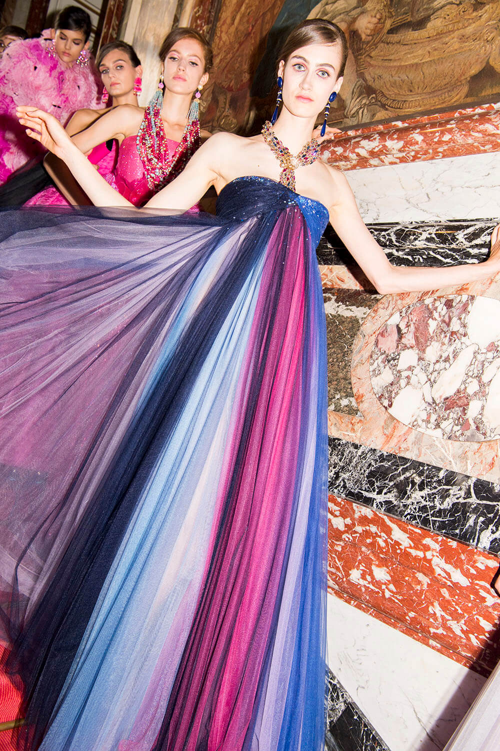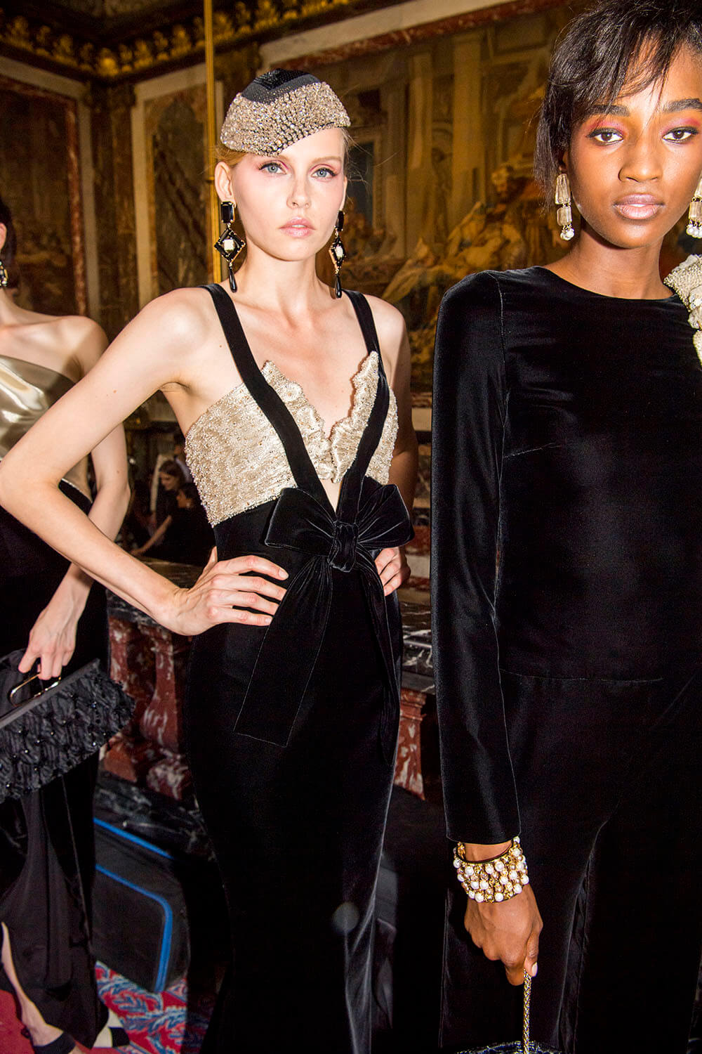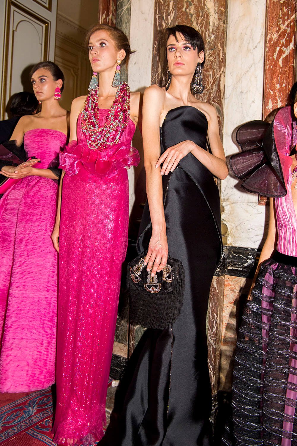 Mr Armani was on a mission. “Conveying to the younger generation the true meaning of couture,” was the maestro’s intention. This 94-look collection was an epic exercise in show and tell. This is how it’s done, kids. Haute elegance, haute refinement, haute guest list (Hi! Tina Turner and Elizabeth Debeki). Presenting salon style (up close and personal) at the Italian Embassy (marble for days), Armani flexed his couture muscles. Every piece was a masterclass in cut, fabrication, detail, refinement and taste. The show covered all the bases. There was effortless daywear for the pulled together trouser-suited Alpha-woman and a whole section devoted to devastatingly chic black velvet gowns. Armani has his moments of play – a fantastical pink fuchsia feather cape nearly stole the show. He also had his moments of levity, opening with a passage of precision cut jackets. Armani served-up high romance with full-skirted gowns made from hundreds of metres of gathered tulle and fashioned pretty pink princess dresses with nipped-in waists and generous skirts. There were countless red carpet “Wow!” moments. Models slunk through the embassy’s grand salons in sinuous columns encrusted with glimmering crystals and beads. What came to the fore was the discipline of Armani’s taste and his commitment to elegance. As he took his bow, the lithe 83 year old designer bent down to pick a fallen feather off his immaculate runway. He’s a perfectionist and with this collection it really showed.