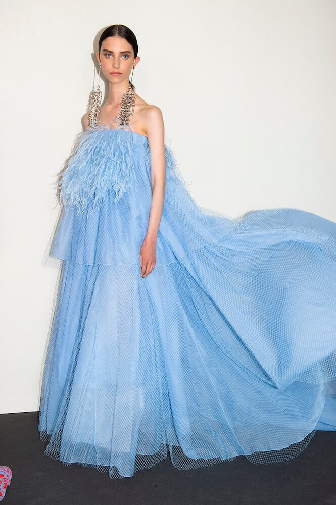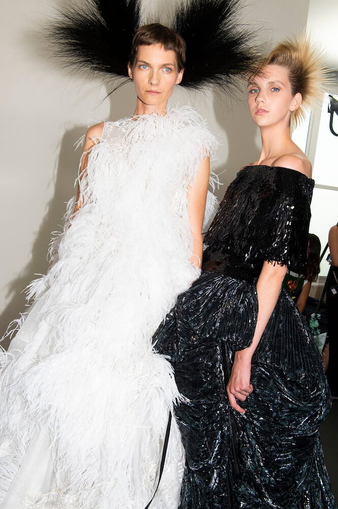 “I wanted to take it up a notch” said Clare Waight Keller after her sensational Givenchy show. Her intention? “To push it to something that has more theatre.” That she did, titling the show “Noblesse Radicale” and sending out a series of dramatic designs. One strict sheath dress looked like it was embraced by a cloud of dancing orange feathers. Feather petticoats sprouted from beneath taffeta ball skirts and thousands of black beads created a raven-like texture for other gowns. “I needed a narrative” she said, imagining an “anarchic” woman living in an enchanted chateau. Her muse would wander through its mysterious room picking up a panniered feather ball gowns, swagged sequinned over coats or fishtail skirts with a dramatic crinolines hems along the way.