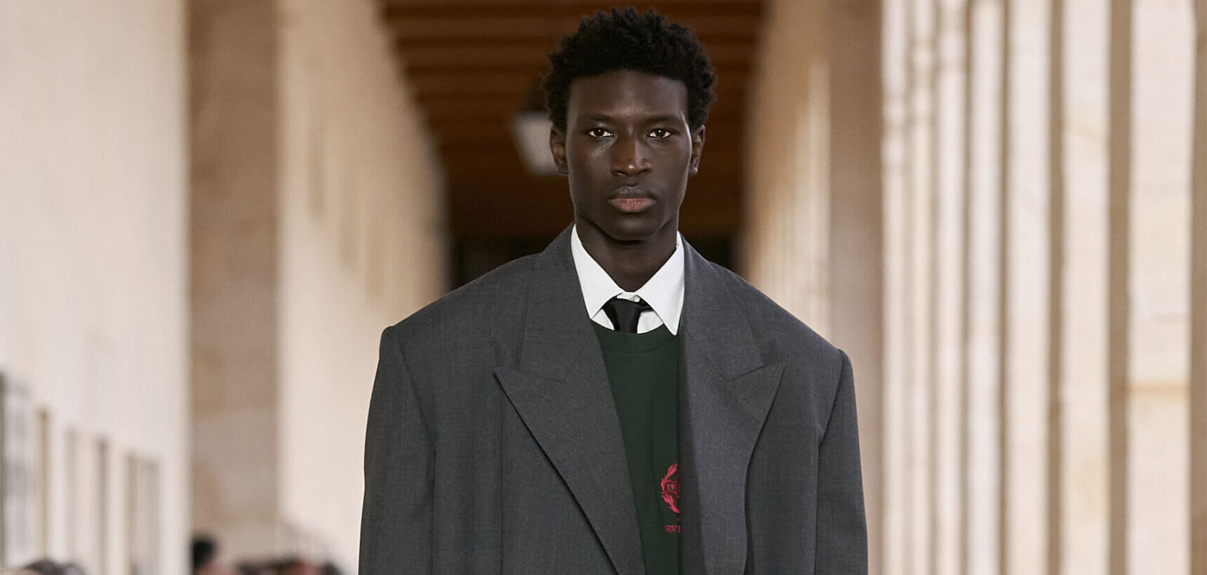 Matthew M. Williams’ Givenchy goes from strength to strength. His menswear SS24 collection, unveiled Thursday afternoon, saw the designer explore a “free-spirited sophistication”, where sartorialism shaped up to be a “gesture of nonconformity” and elegance an “expression of individuality”. Loosening up the classic suit, he cut blazers boxy and oversized, and paired such with slouched trousers. More tailored Wall Street suits were casualised when worn beneath dad-like waterproof jackets. Throughout, Williams cleverly re-contextulised “the archetypes of smartness”. Whether that was schoolboy uniforms, echoed in shirts and ties worn beneath silky bomber jackets and slick, silver track tops, to utility belts and gilets coupled with smart trousers.