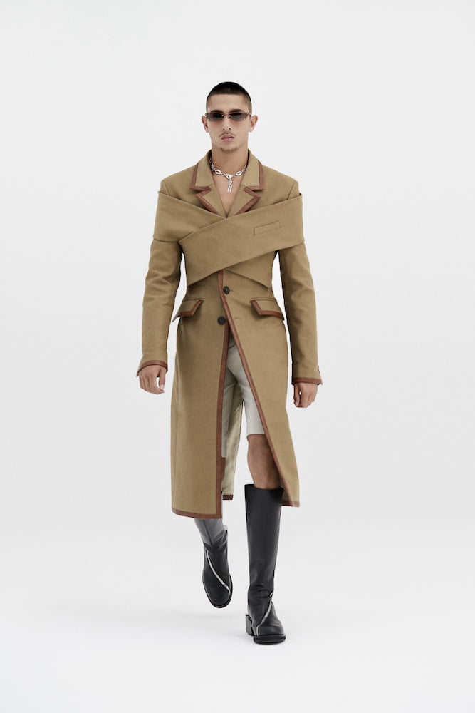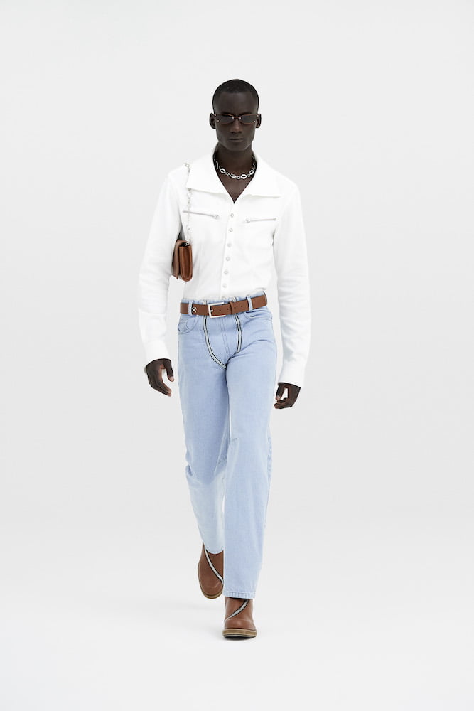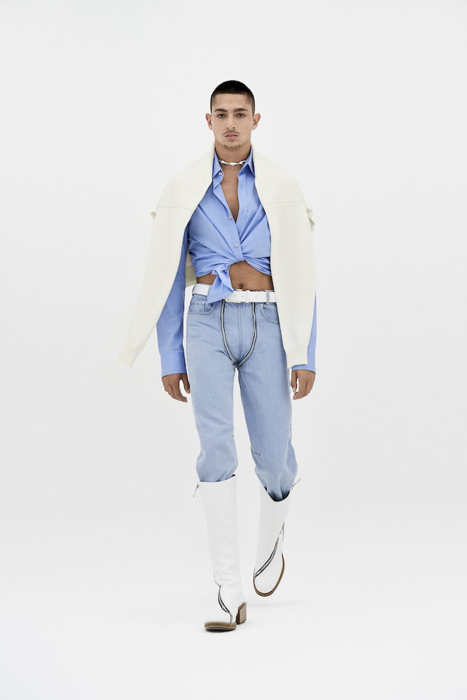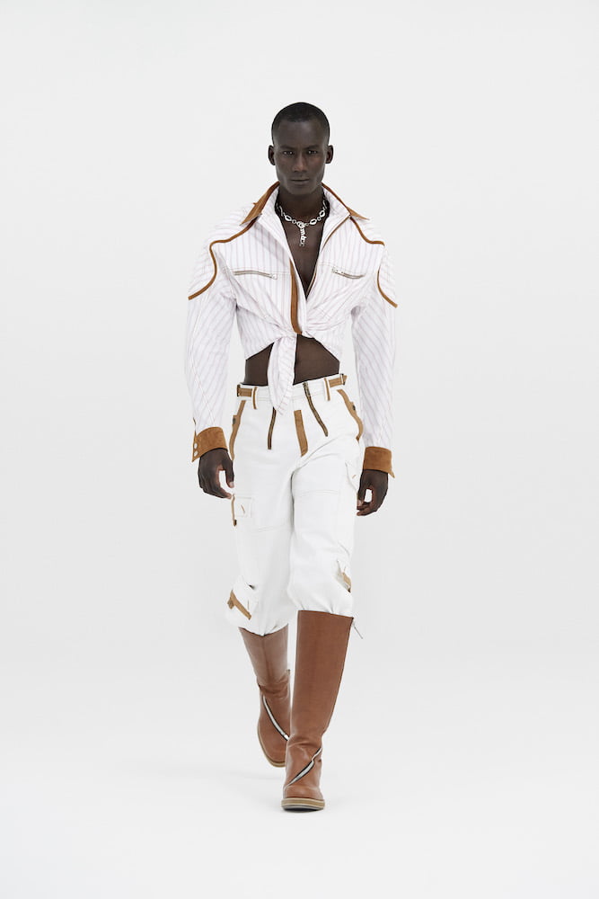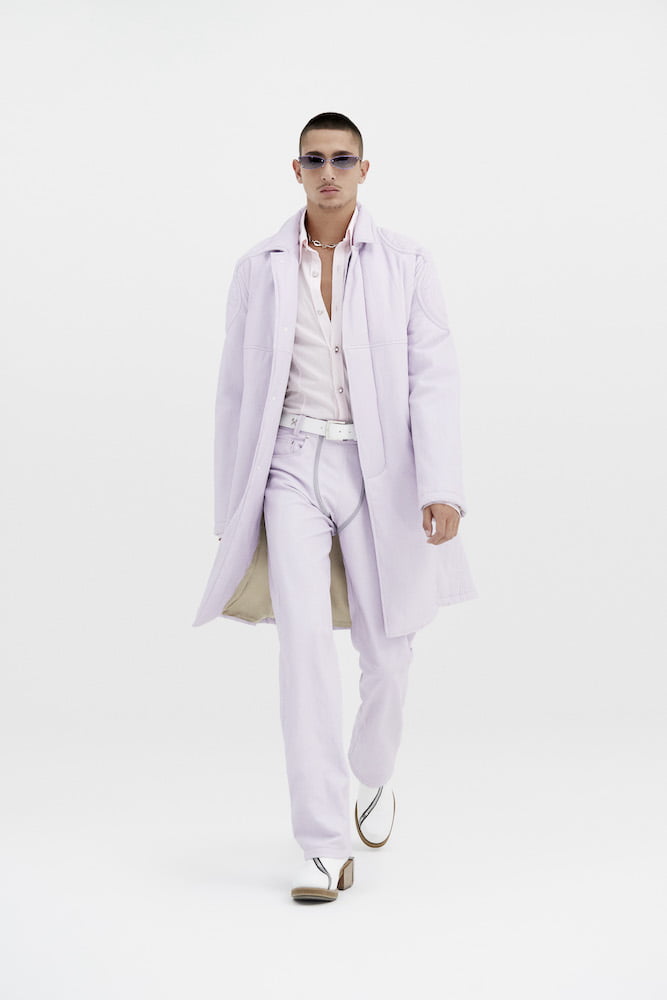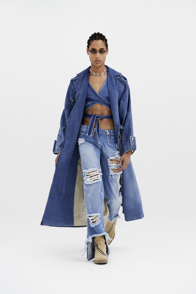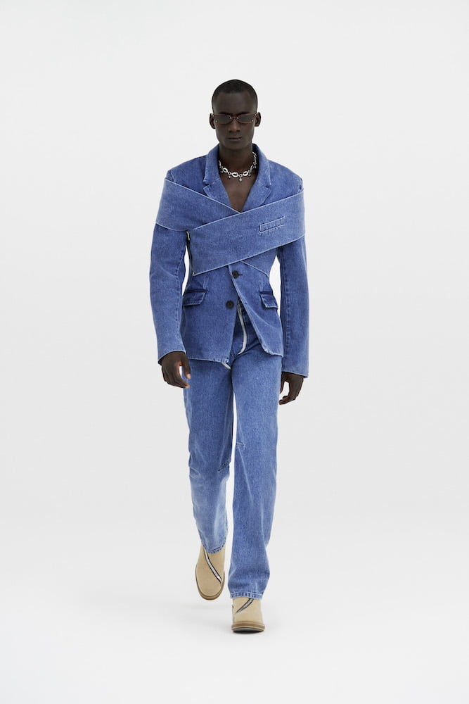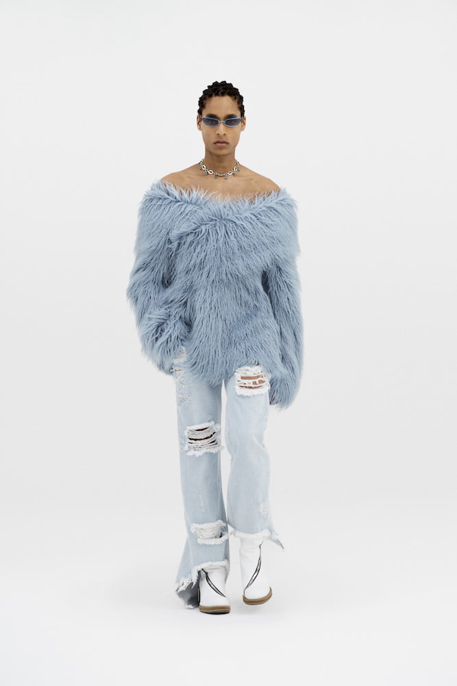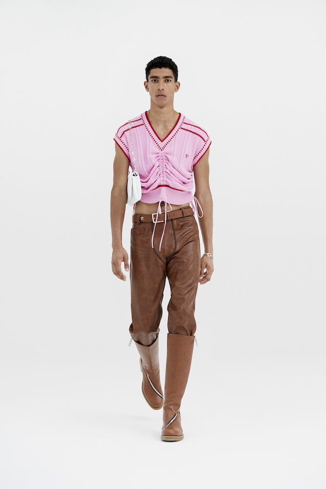 Looking to activities usually reserved for the white, upper class – skiing, horse-riding, etc – the pair approached the tropes associated with such using their GmbH design language, channeled through a queer and BIPOC perspective. Models came wearing rouched, knitted tops, kinky horseriding boots and gentle-hued jumpers which were draped over the shoulders of belly-baring shirts. The brand’s dramatic, shoulder-wrapped tailoring was encased in denim for the first time, worn alongside lavender vegan-leather trousers and a shirt, jean and tan over-the-shoulder bag combo the pair jokingly call “the Princess Diana going to the country club”.