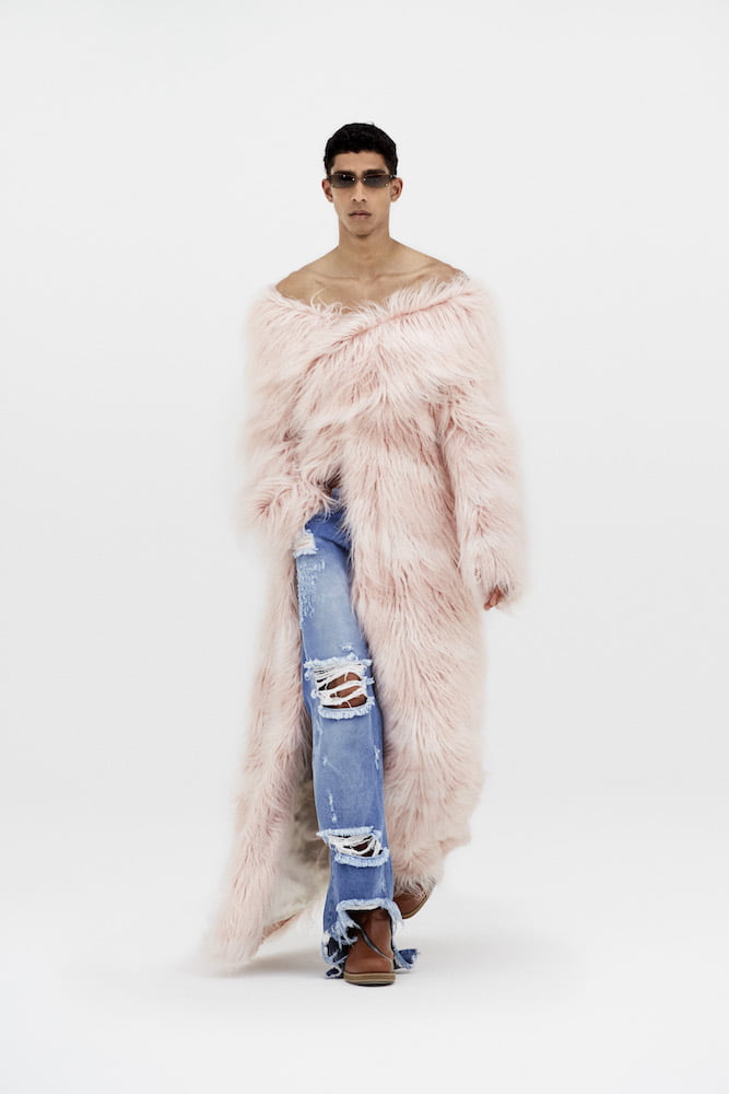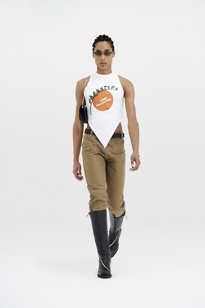 The collection comes complete with a Free Palestine top made with queer Palestinian label Trashy Clothing, as well as a slew of faux fur coats which will become part of the label’s fledging demi-couture line. “The response has been great,” affirms Huseby. “The last collection we made these pieces out of necessity because we really wanted to do a show.”