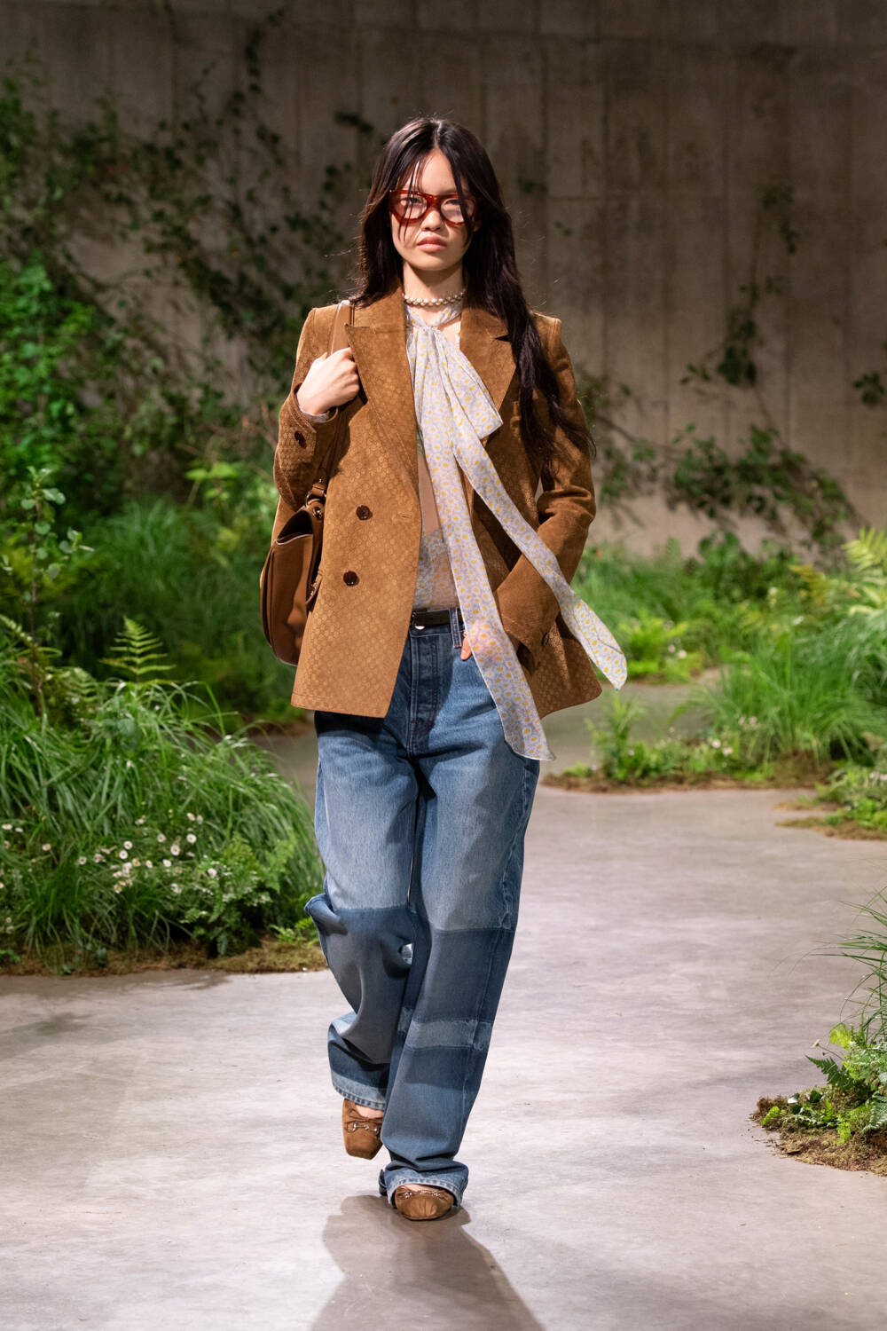 On the catwalk the designer presented a marriage of English spirit and Italian flair. The first looks laid out his approach. A series of exquisitely crafted suede pieces – tailored jackets, caban coats, hot pants and mod tunics – all bore the unmistakable touch of Gucci’s artisans. Worn with Sloaney pussy bow blouses, (made sexy in sheer wisps of chiffon), baggy jeans, punky studded brothel creepers, monogrammed ballet pumps and supersized Jackie bags (big enough, perhaps to kill off the mini bag fad?). It brought into focus the Sabato effect. Gucci today equals classic-meets-oh-so-now-proportions, served with an unmistakable dash of Italian craft and sensuality.