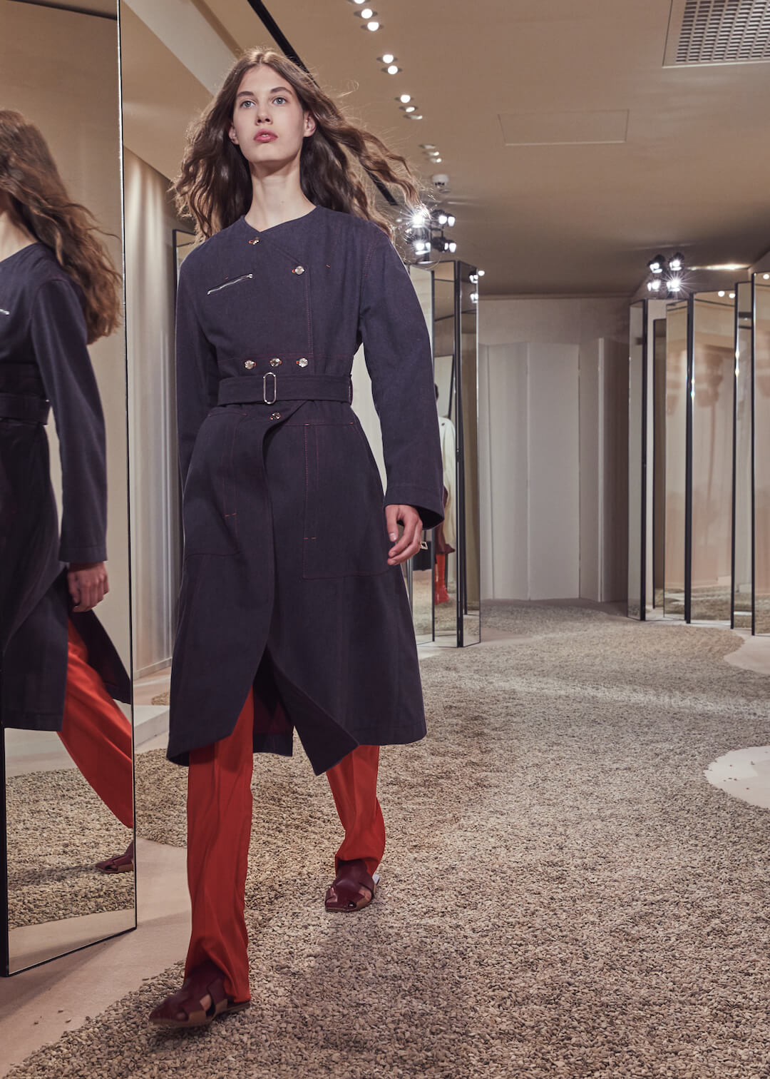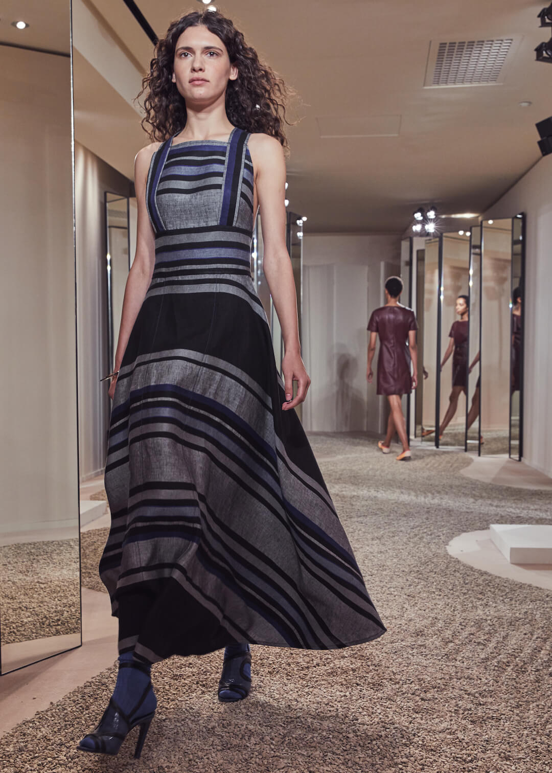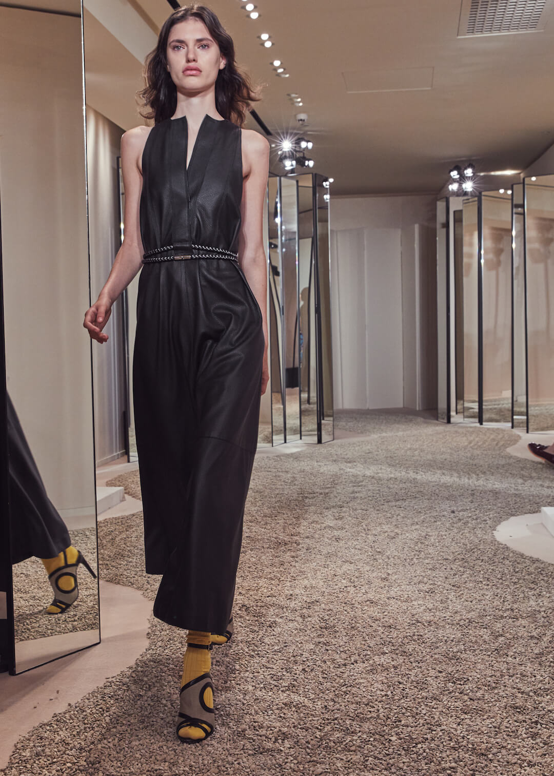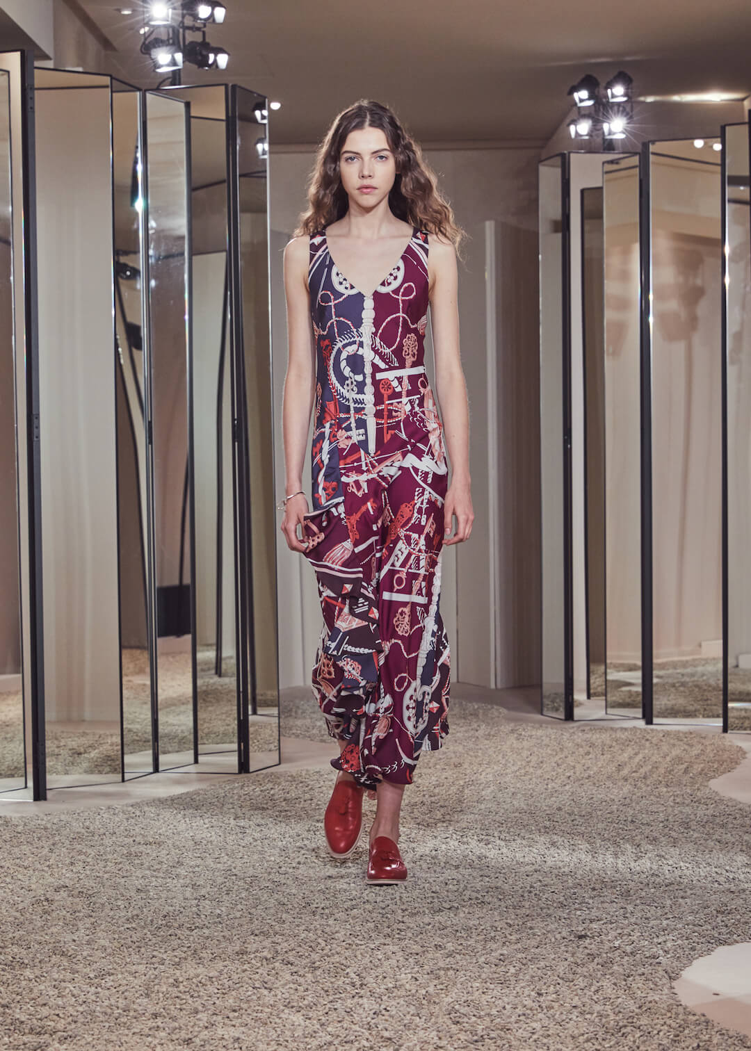 Hermés, can we count the ways that we love you? No, apparently, we have a word limit. And we’ve been told off for rambling. But it’s a lot. Can’t help but feel I am an Hermès woman born into a non-Hermès (poor) woman’s body. Today’s pre-collection took place in their store, which seems right – Hermès is about things to buy. There are ideas here – don’t get us wrong – the slinky, summery take on their silk scarf dress, scarves that also twisted round the girl’s waists, fresh touches of sportswear – top stitching and toggle fastenings – or those luminous Seventies swimsuits that fastened around the neck with rope. Garth was particularly fond of them. Said it was a moment. That all felt new.