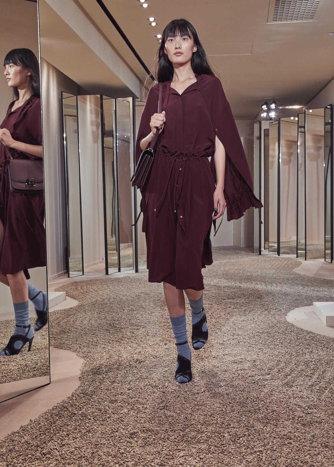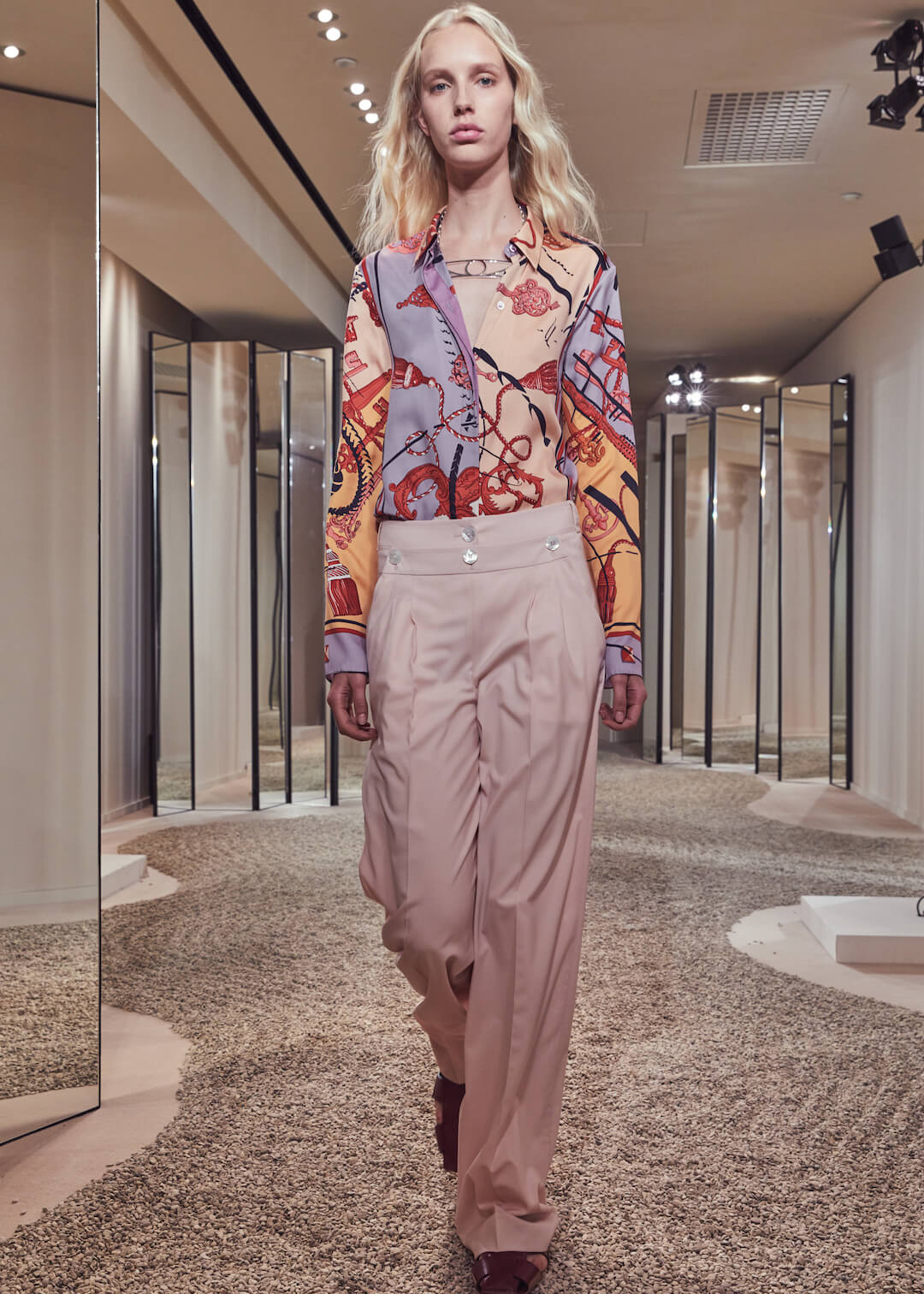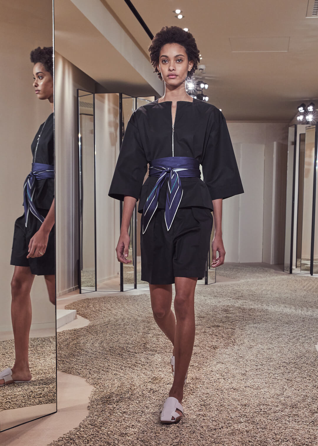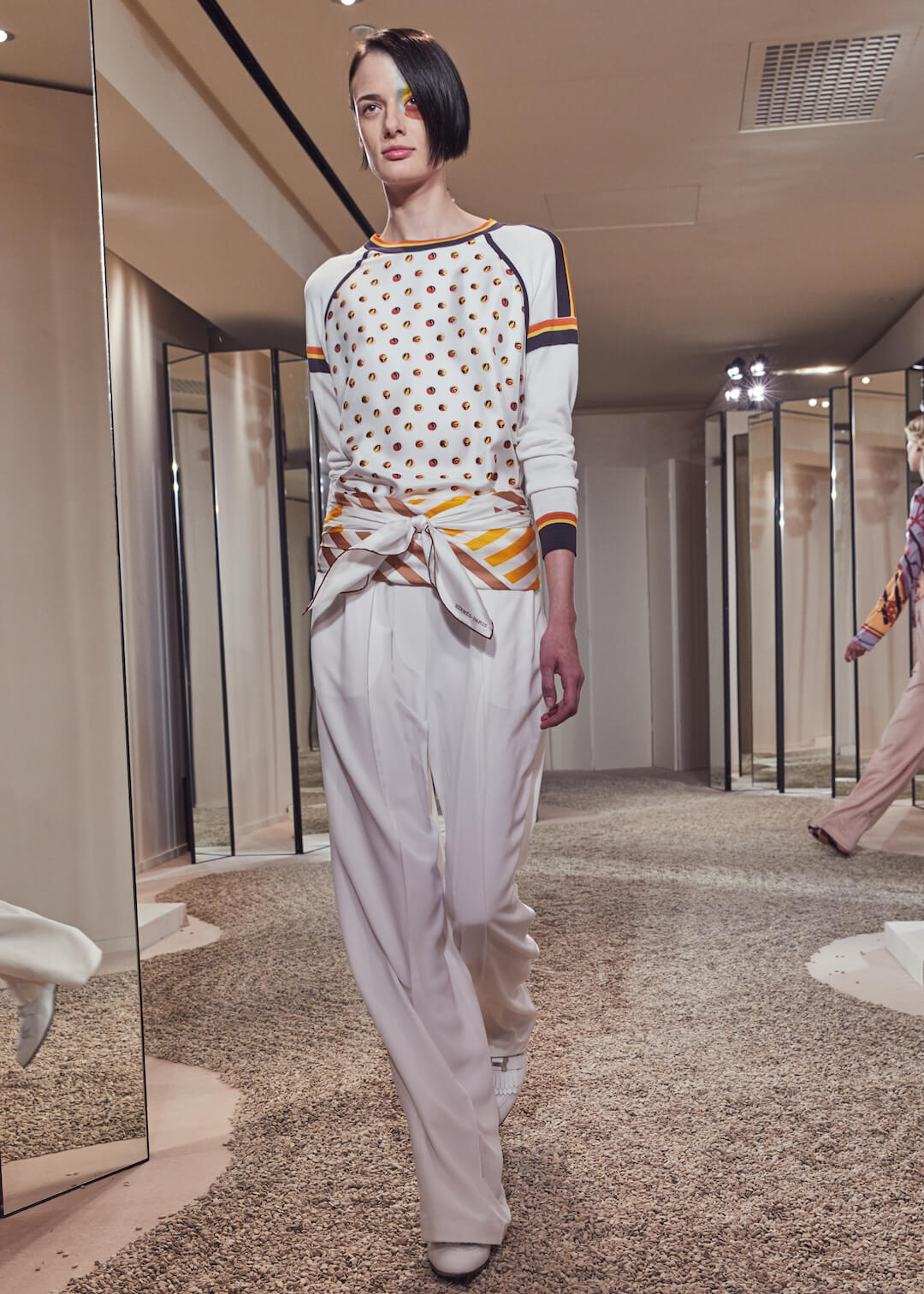 Hermés, can we count the ways that we love you? No, apparently, we have a word limit. And we’ve been told off for rambling. But it’s a lot. Can’t help but feel I am an Hermès woman born into a non-Hermès (poor) woman’s body. Today’s pre-collection took place in their store, which seems right – Hermès is about things to buy. There are ideas here – don’t get us wrong – the slinky, summery take on their silk scarf dress, scarves that also twisted round the girl’s waists, fresh touches of sportswear – top stitching and toggle fastenings – or those luminous Seventies swimsuits that fastened around the neck with rope. Garth was particularly fond of them. Said it was a moment. That all felt new.