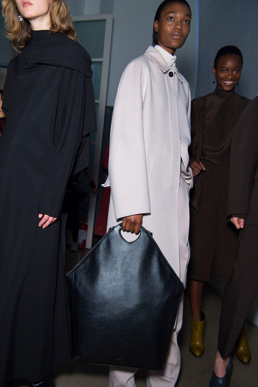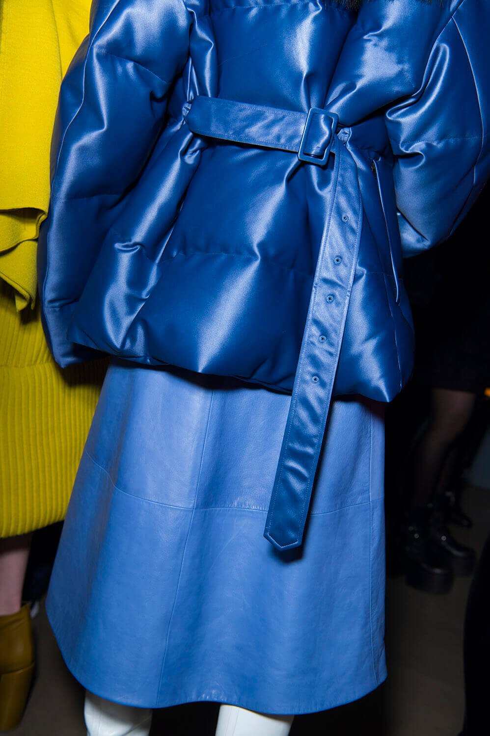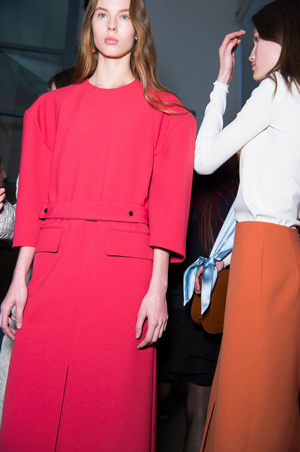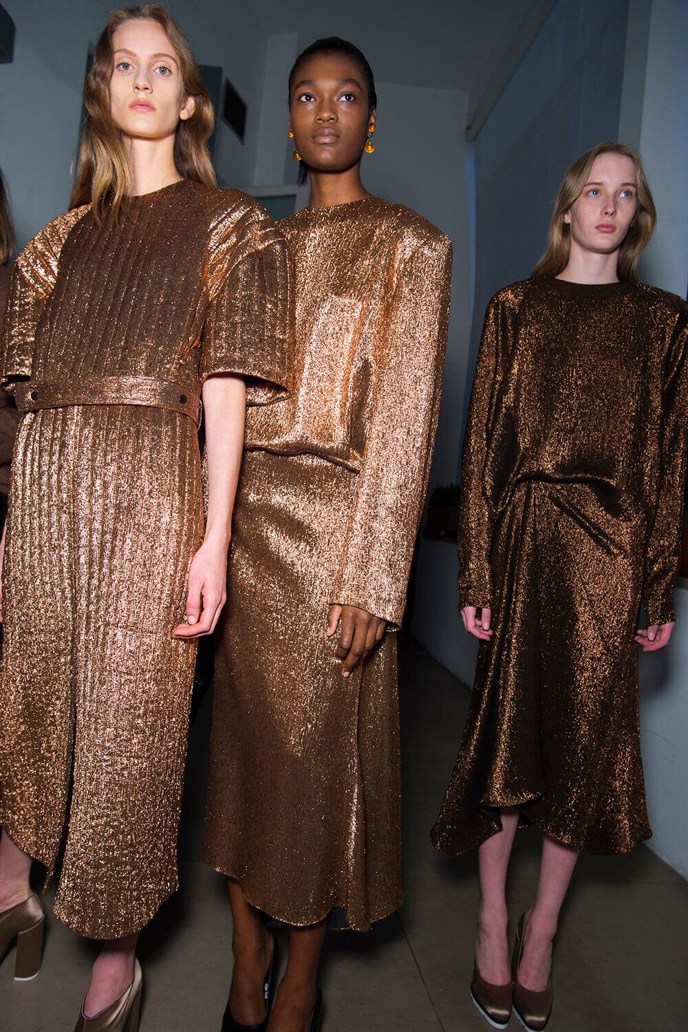 Jil Sander’s girls are getting their glitz on. They don’t let their hair down often (call them disciplined) so take this as an occasion. Because the show ended with a glitzy metallic moment (we’re sniffing a bit of a trend here, Bottega’s ladies earlier were similarly molten) coming through in wide-shouldered drapey lurex and lame dresses, some that wrapped around the waist like tied sleeves. Can’t help but reference Quality Street here – something about a coloured metallic situation always summons up a strawberry cream. Elsewhere, there was that play on tailoring that Rodolfo has made a bit of a signature, big and boxy – here in red wool and black leather, that shape becoming softer, more rounded as the show went along – the sleeves on dresses and blazers curved, the silhouette pumped up with puffa jackets that sat on top. It ended with a bit of a fashion whisper – would this would be Rodolfo Paglialunga’s final collection for Jil? If (and we emphasise “if” here) this is the case – then how better to make your exit than with a bit of sparkle?