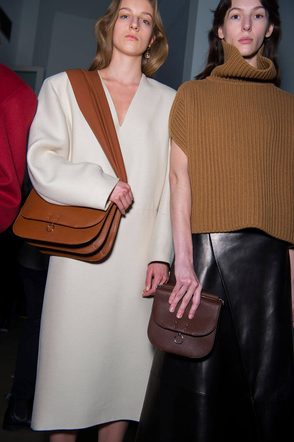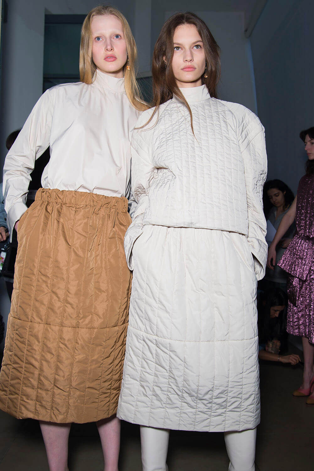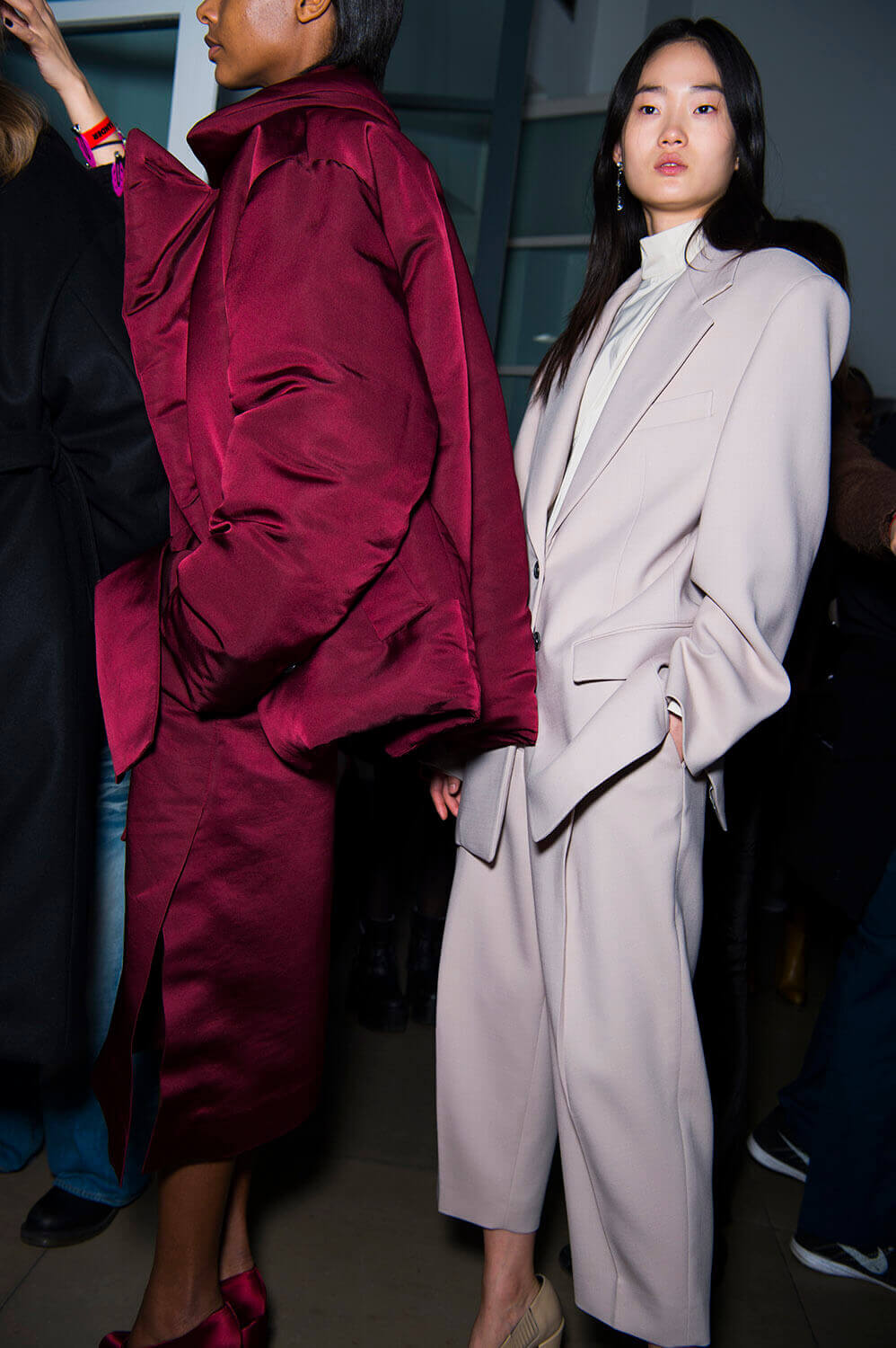 Jil Sander’s girls are getting their glitz on. They don’t let their hair down often (call them disciplined) so take this as an occasion. Because the show ended with a glitzy metallic moment (we’re sniffing a bit of a trend here, Bottega’s ladies earlier were similarly molten) coming through in wide-shouldered drapey lurex and lame dresses, some that wrapped around the waist like tied sleeves. Can’t help but reference Quality Street here – something about a coloured metallic situation always summons up a strawberry cream. Elsewhere, there was that play on tailoring that Rodolfo has made a bit of a signature, big and boxy – here in red wool and black leather, that shape becoming softer, more rounded as the show went along – the sleeves on dresses and blazers curved, the silhouette pumped up with puffa jackets that sat on top. It ended with a bit of a fashion whisper – would this would be Rodolfo Paglialunga’s final collection for Jil? If (and we emphasise “if” here) this is the case – then how better to make your exit than with a bit of sparkle?