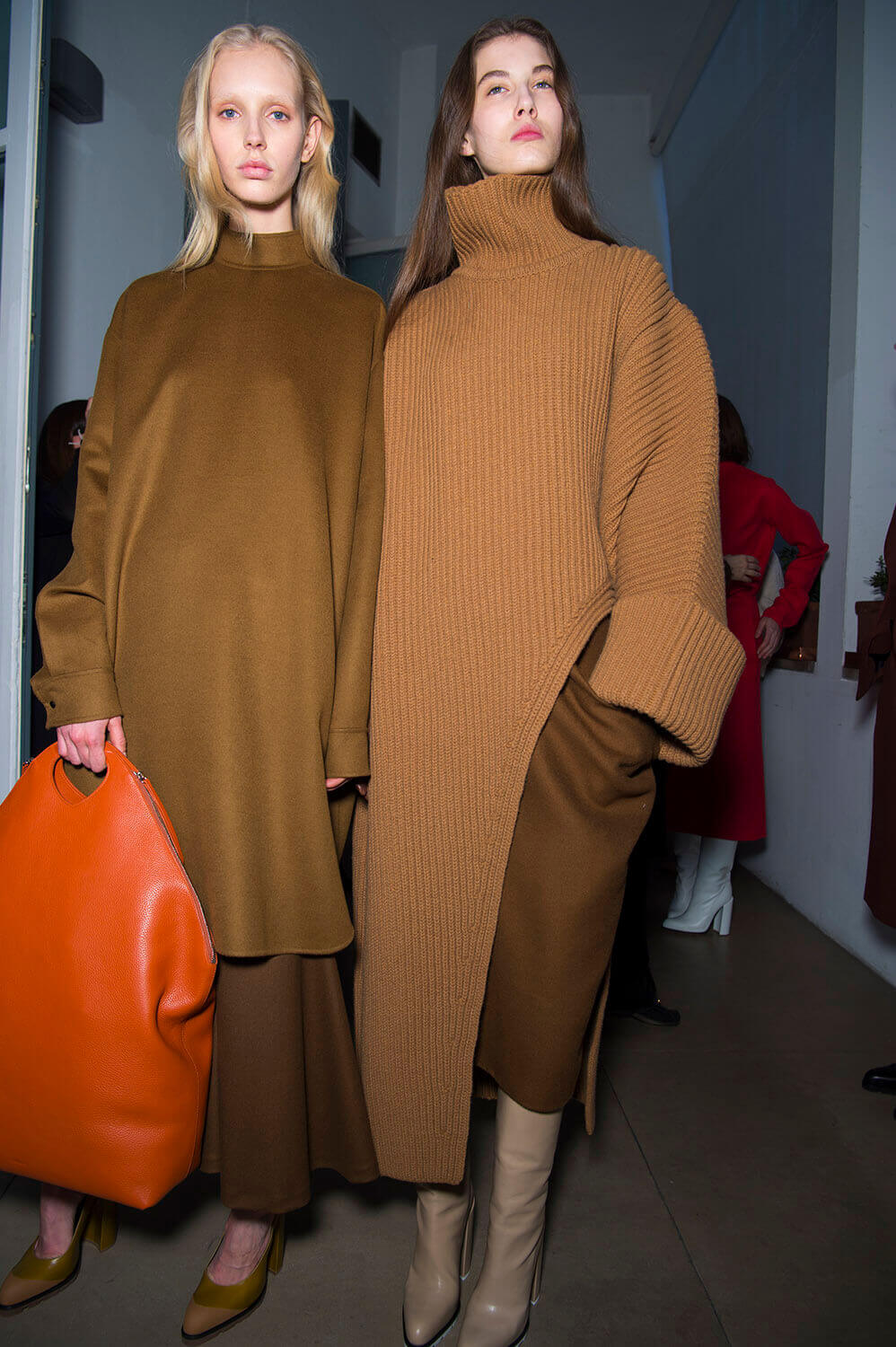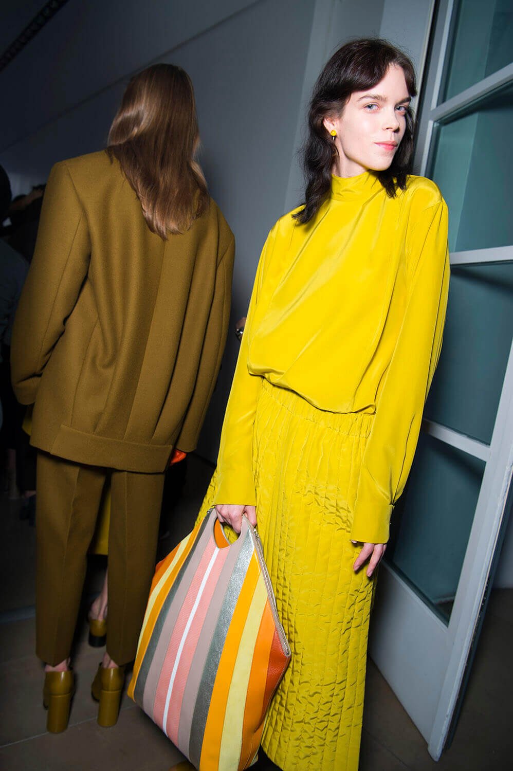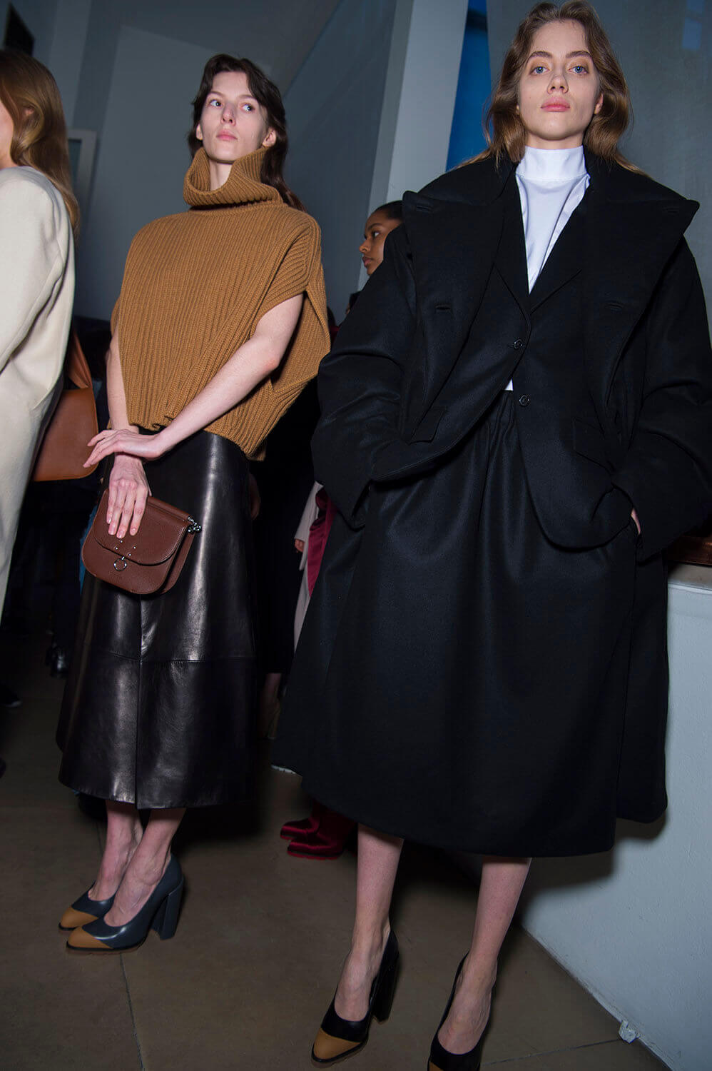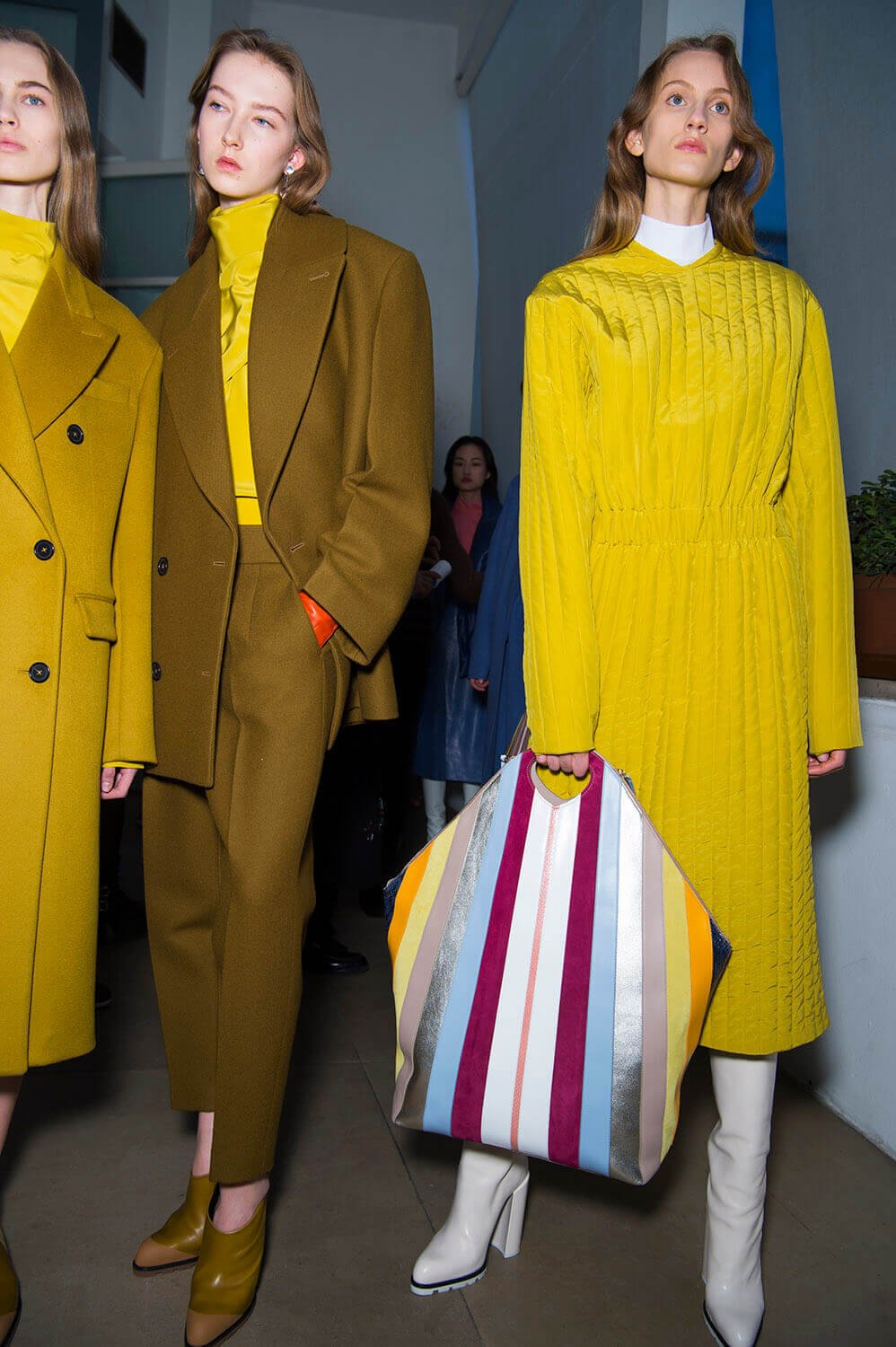 Jil Sander’s girls are getting their glitz on. They don’t let their hair down often (call them disciplined) so take this as an occasion. Because the show ended with a glitzy metallic moment (we’re sniffing a bit of a trend here, Bottega’s ladies earlier were similarly molten) coming through in wide-shouldered drapey lurex and lame dresses, some that wrapped around the waist like tied sleeves. Can’t help but reference Quality Street here – something about a coloured metallic situation always summons up a strawberry cream. Elsewhere, there was that play on tailoring that Rodolfo has made a bit of a signature, big and boxy – here in red wool and black leather, that shape becoming softer, more rounded as the show went along – the sleeves on dresses and blazers curved, the silhouette pumped up with puffa jackets that sat on top. It ended with a bit of a fashion whisper – would this would be Rodolfo Paglialunga’s final collection for Jil? If (and we emphasise “if” here) this is the case – then how better to make your exit than with a bit of sparkle?