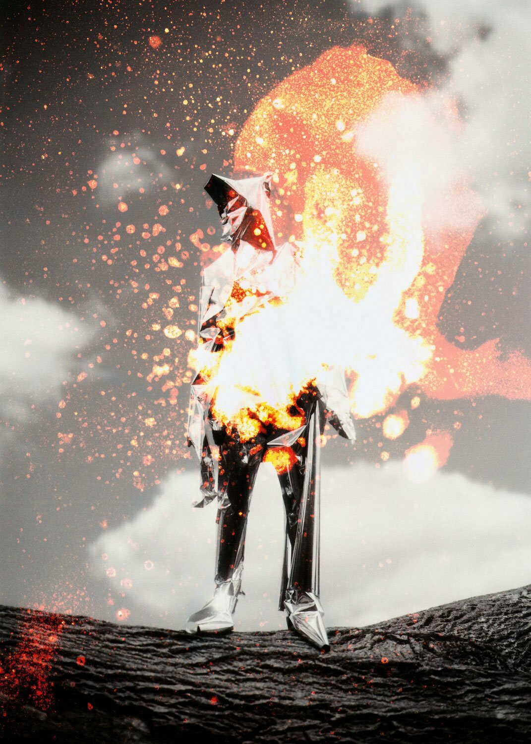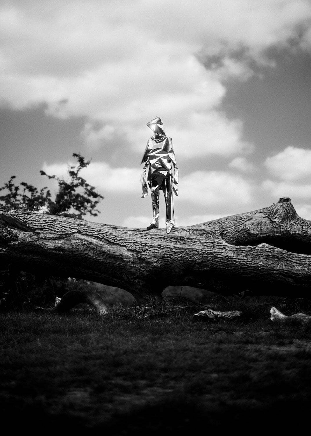 Flicking through One For Sorrow, that figure takes shape as a tin man. “He shines and reflects the light, all the while inside he suffers, suffocating in his own costume of reflection,” Hight explains. On a fallen tree the tin man stands, his alloyed exterior gleaming against the panoramic UVs, instigating an intimacy that is both tender and alienating. It evokes uncertainty, conjuring the uncanny and unleashes an ocean of emotions upon the onlooker. Hight constructs an apocalyptic, post-reality universe, placing the viewer in the midst of the chaotic compositions alongside the tin man, so that they cannot be certain of what it is they are seeing, where they even are, or what might happen next.