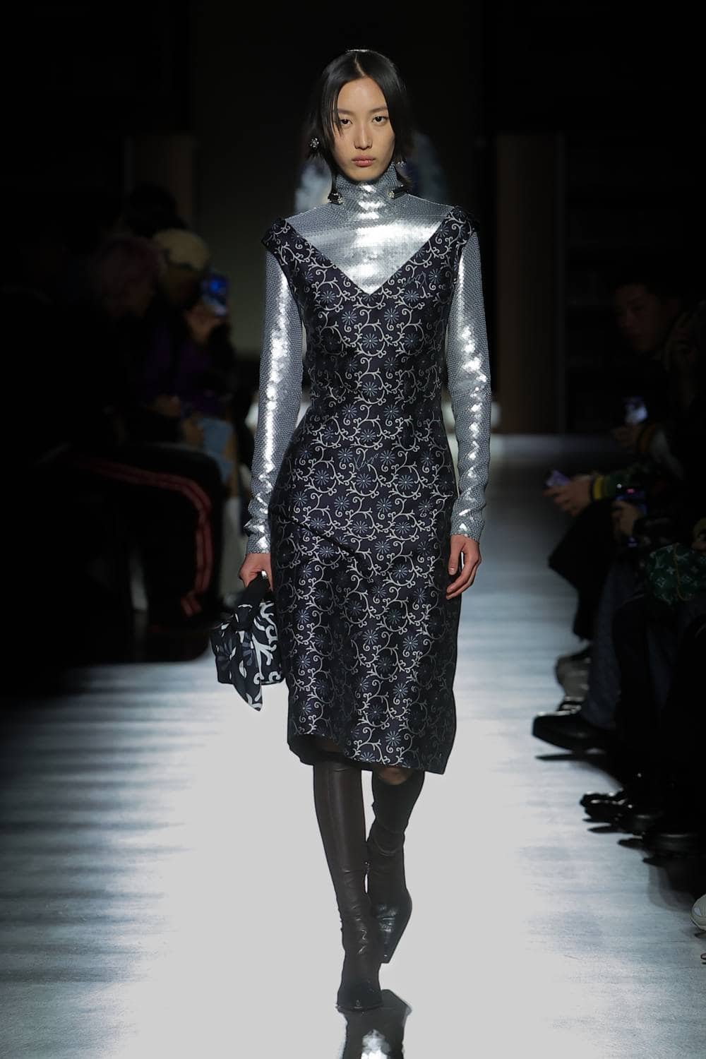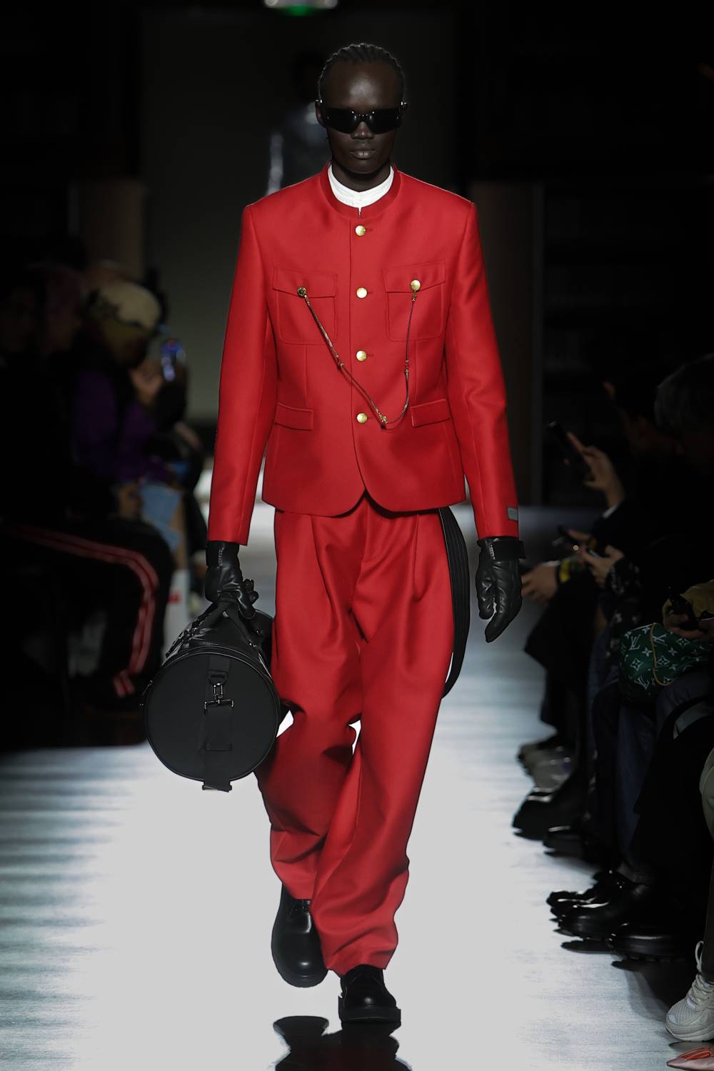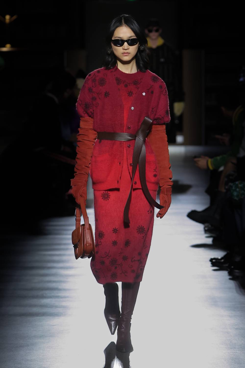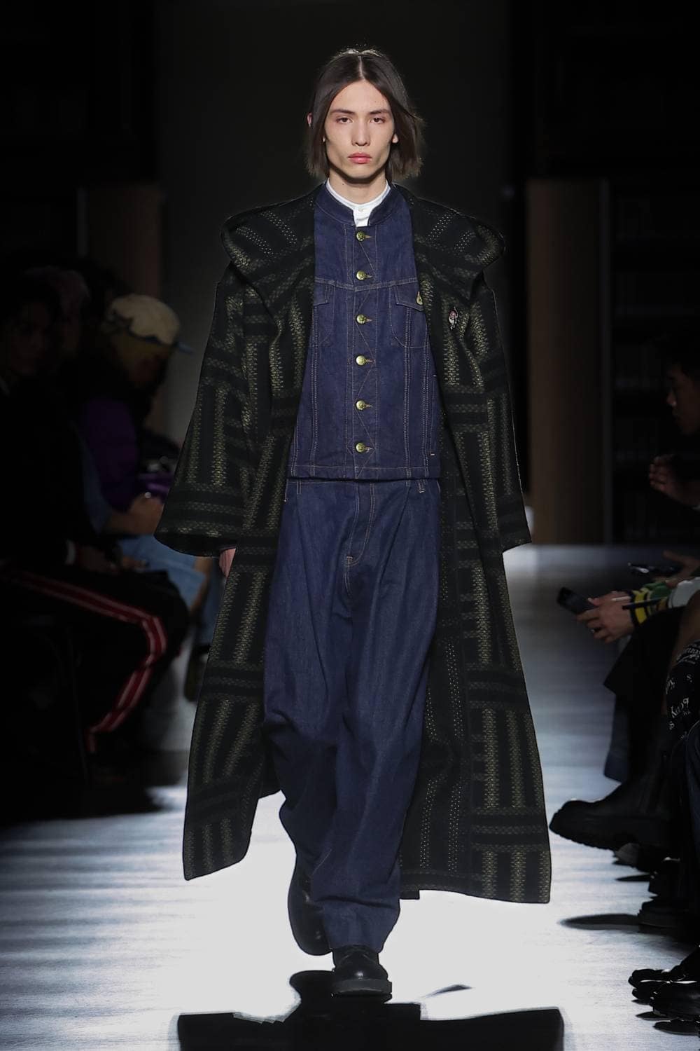 Menswear silhouettes also evolved from Japan’s red ‘gakuran‘ schoolboy suit, which morphed into both tailoring and voluminous outerwear. The loose, elongated silhouettes were infused with sashiko embroidery and beading, and worn with futuristic skate shoes or biker boots. For women, opulent twinsets were nipped in at the waist by judo belts.