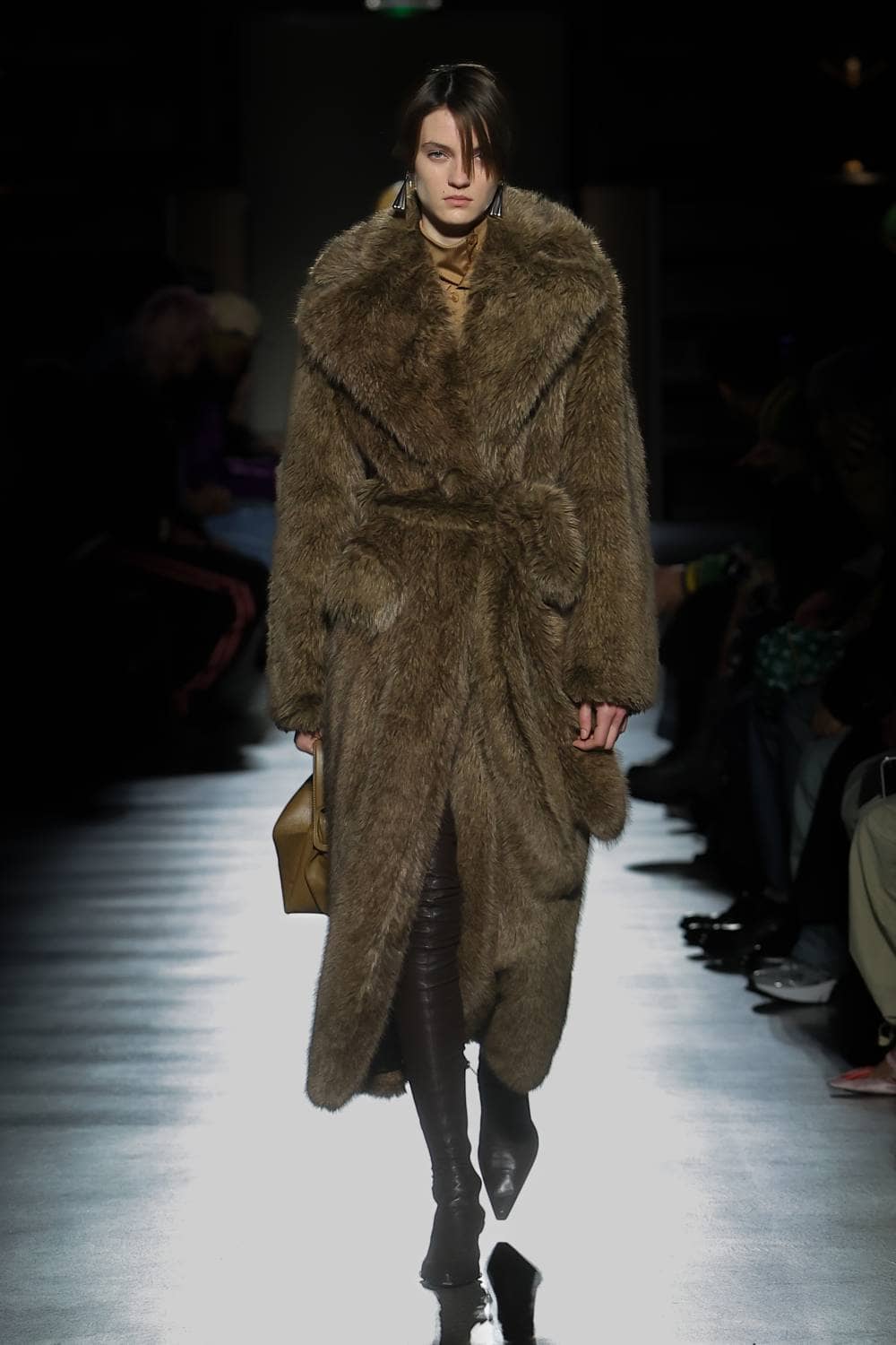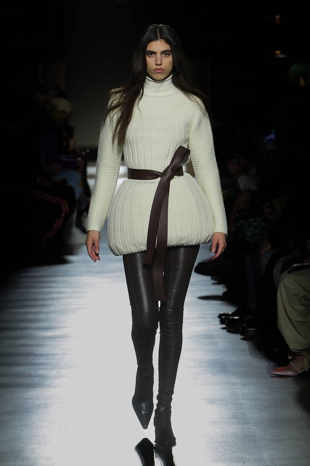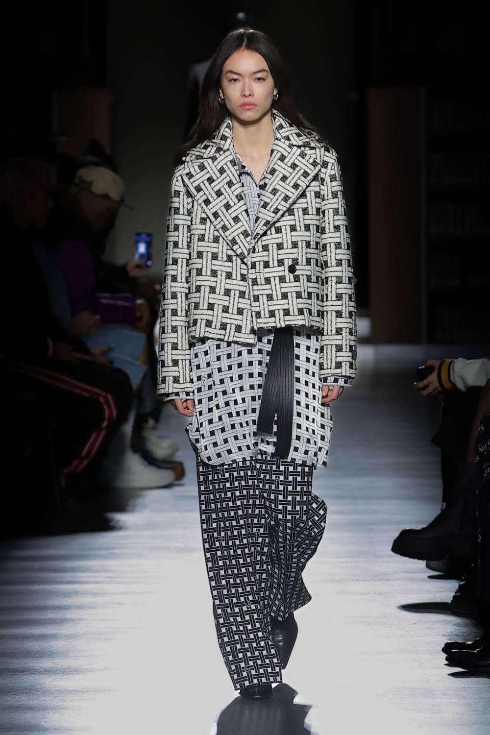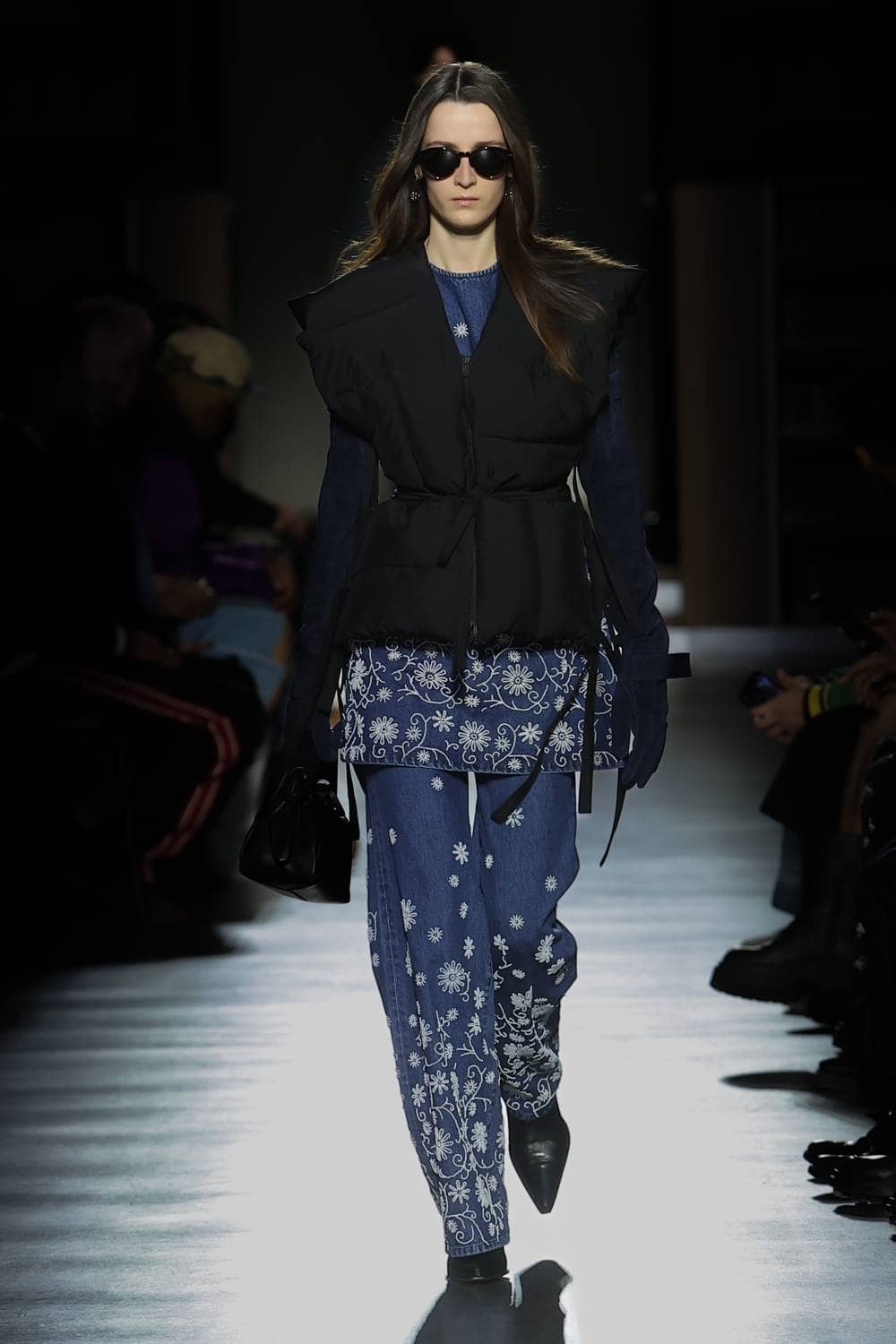 Menswear silhouettes also evolved from Japan’s red ‘gakuran‘ schoolboy suit, which morphed into both tailoring and voluminous outerwear. The loose, elongated silhouettes were infused with sashiko embroidery and beading, and worn with futuristic skate shoes or biker boots. For women, opulent twinsets were nipped in at the waist by judo belts.