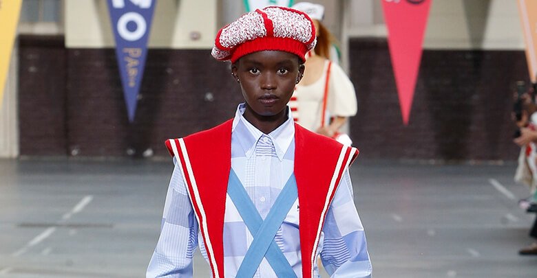 Though, the standout elements of the collection arguably lay in the details. From high-top loafers and candy-striped socks to petite leather satchels that oh-so politely concluded the collegiate aesthetic. The designer also offered a Japanese perspective of Parisian couture – informed by Kenzo in the ’80s – and its elevation of the maritime uniform. This can be seen through naval collars and jaunty sailor’s caps, playfully worn lopsided and emblazoned in the brand’s logo.