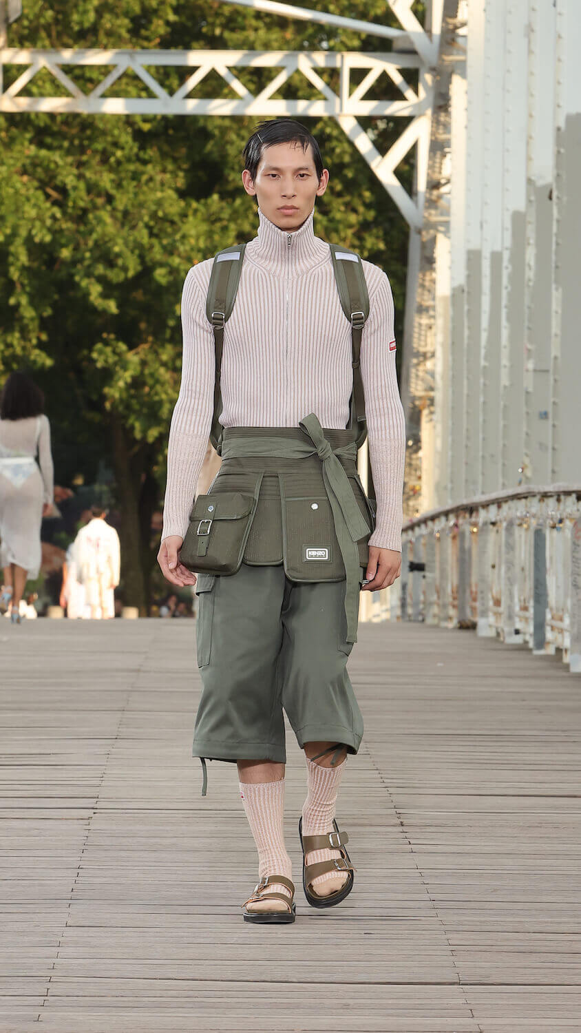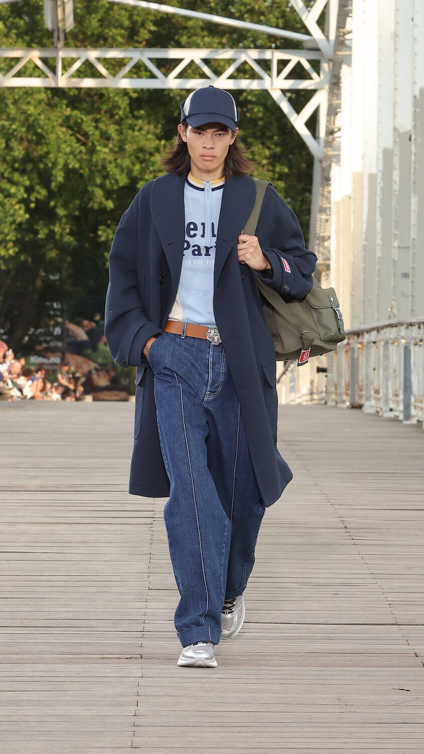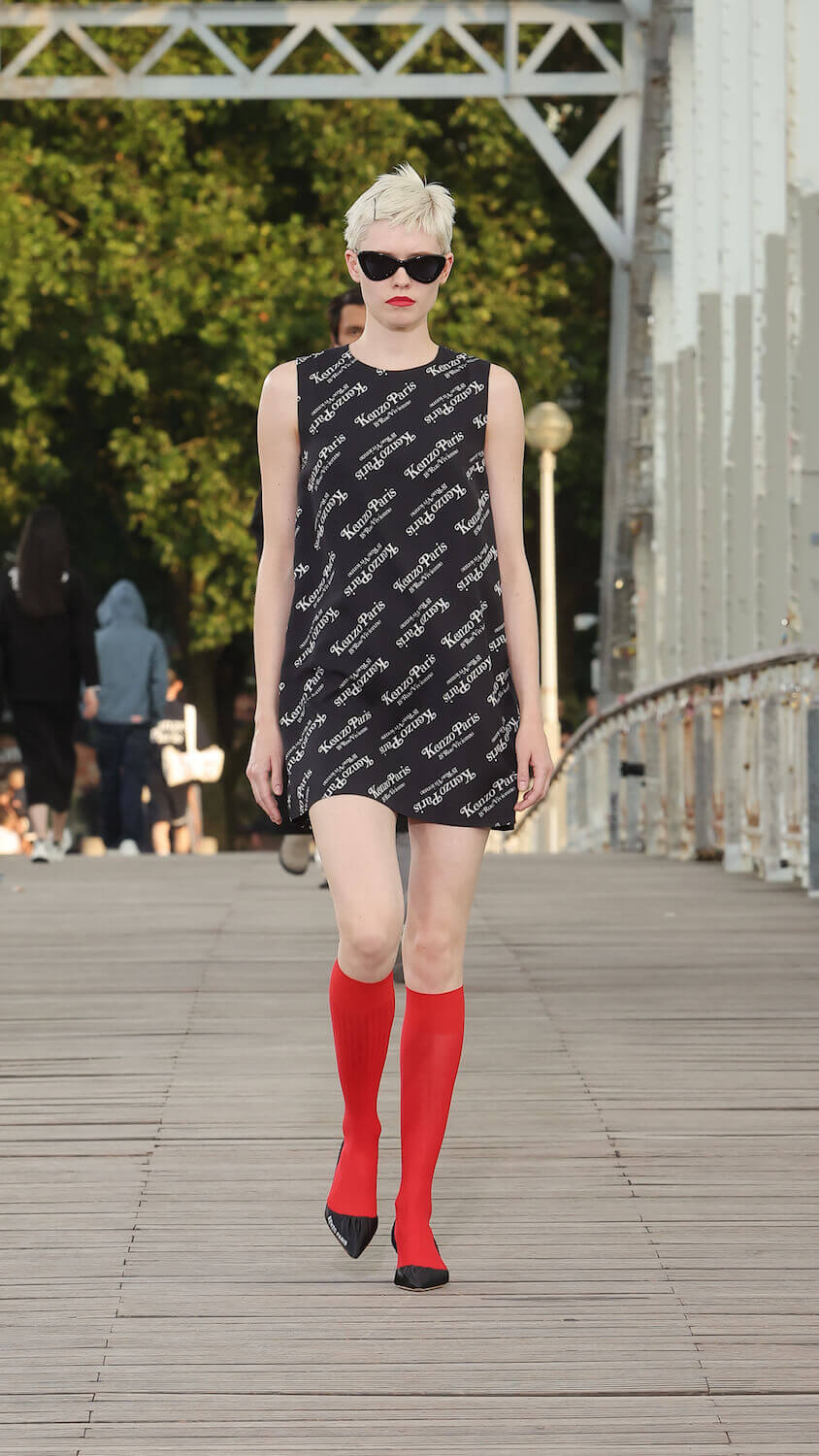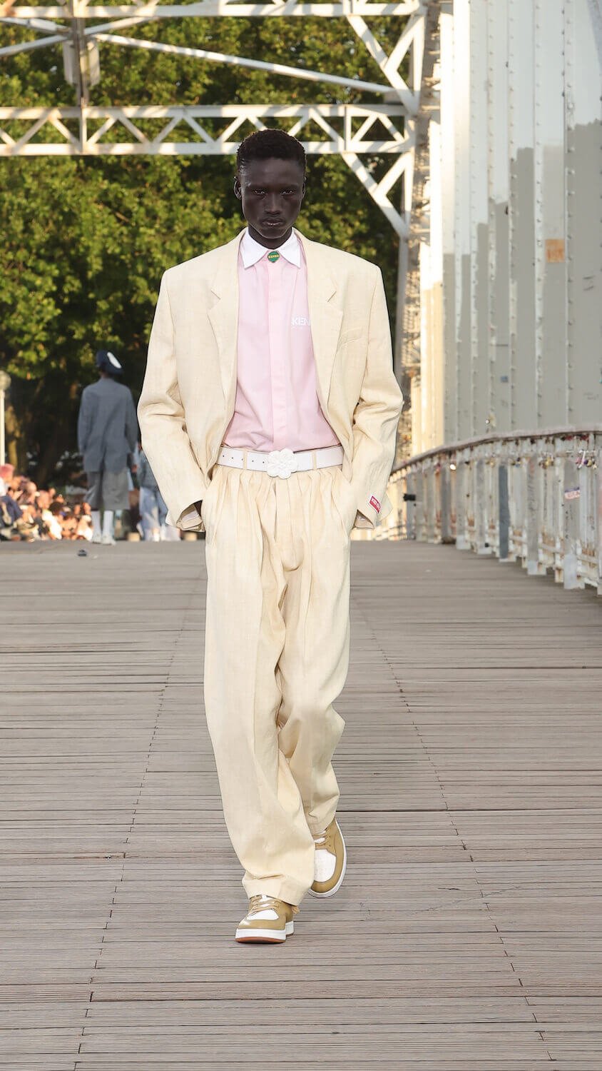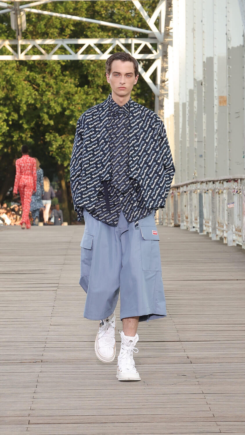 Suspended between opposing sides of a city, strung over the River Seine on the Passerelle Debilly footbridge that links the Palais de Tokyo with the Eiffel Tower, Kenzo’s SS24 collection kicked off; casual, colourful and considered. Entitled City Pop Paris, it was a line up envisioned in the memory of an elusive musical genre born in the same nation as the brand; Japan.