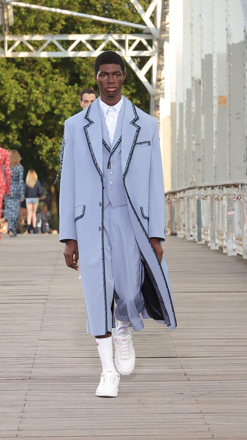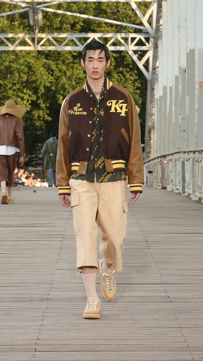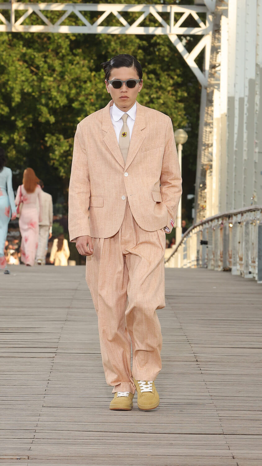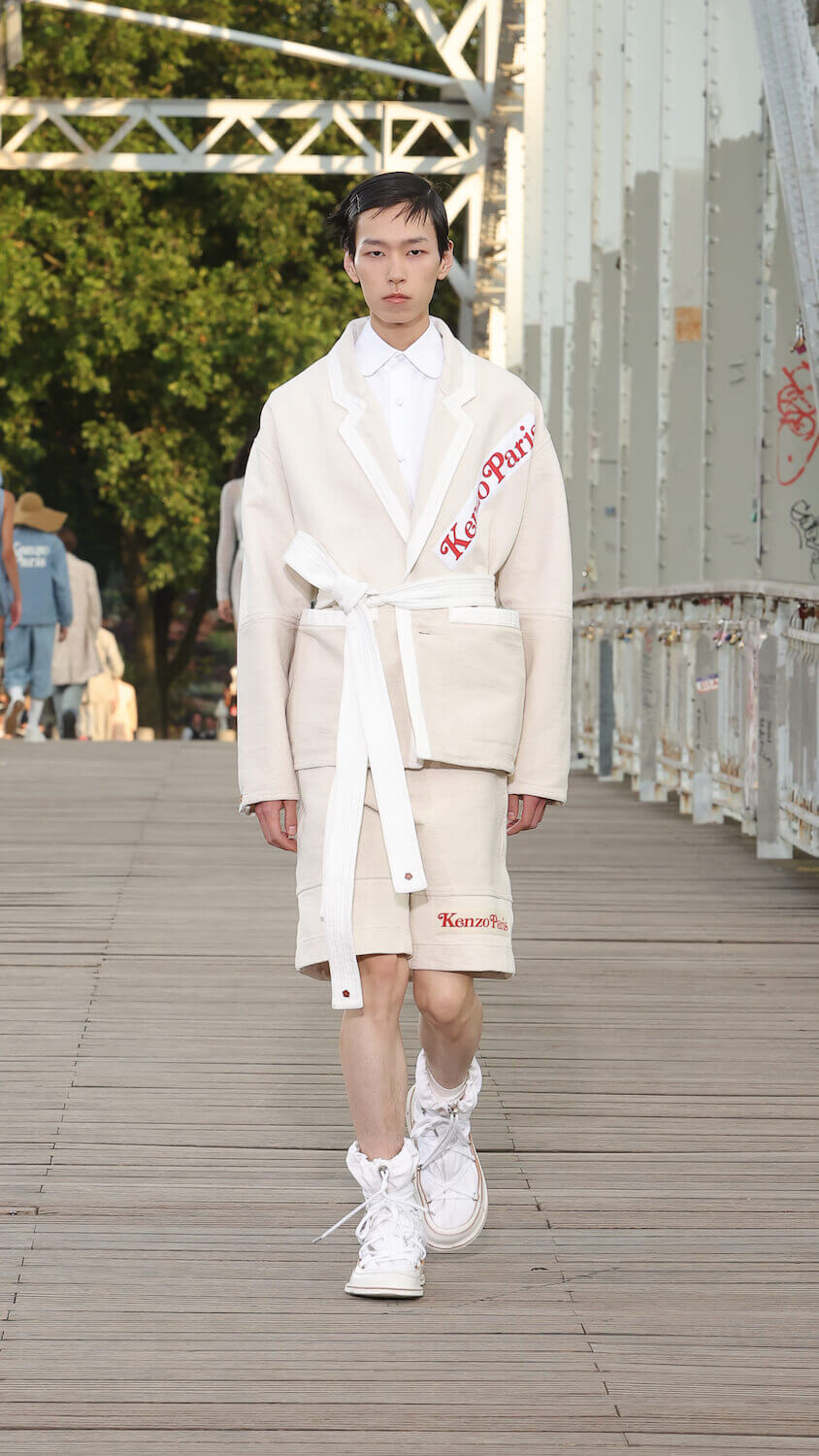 Suspended between opposing sides of a city, strung over the River Seine on the Passerelle Debilly footbridge that links the Palais de Tokyo with the Eiffel Tower, Kenzo’s SS24 collection kicked off; casual, colourful and considered. Entitled City Pop Paris, it was a line up envisioned in the memory of an elusive musical genre born in the same nation as the brand; Japan.