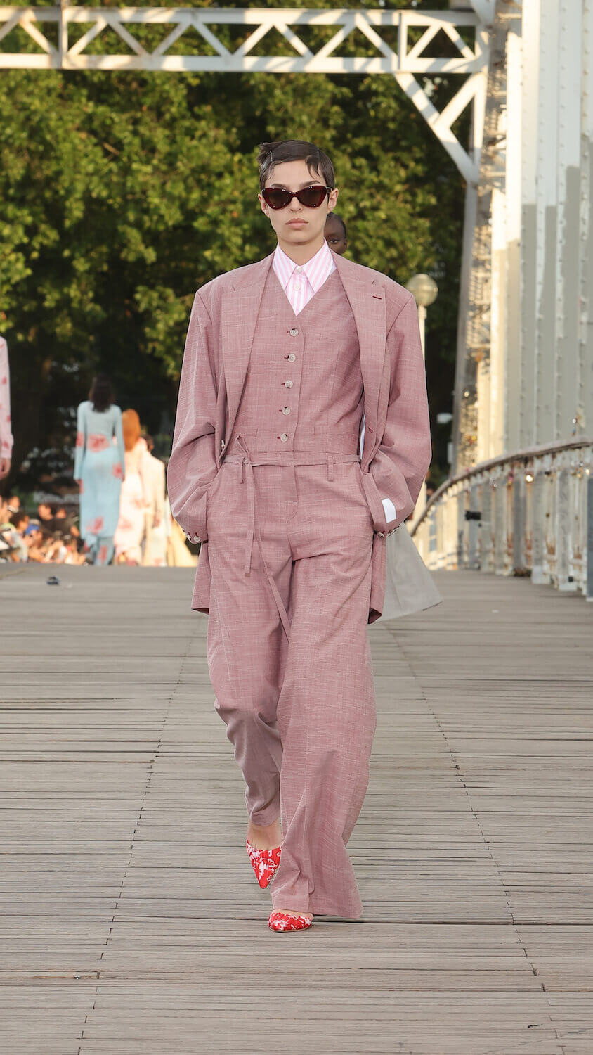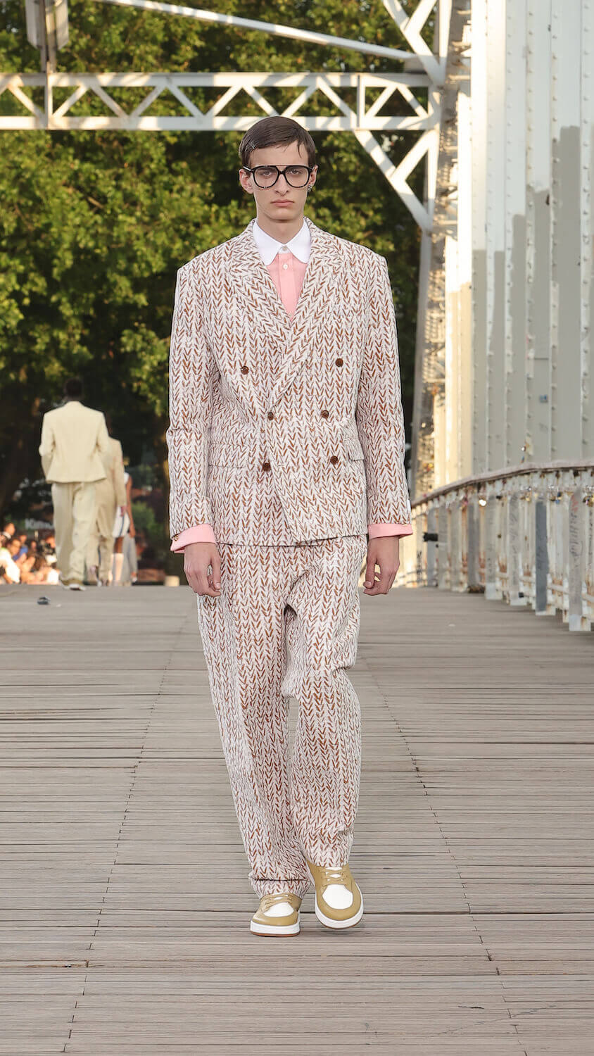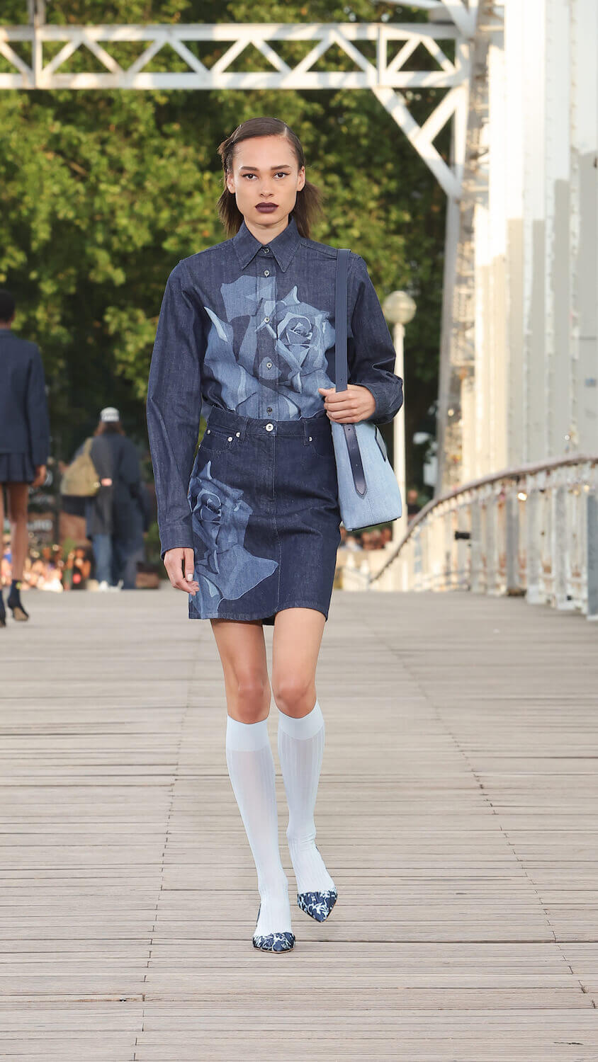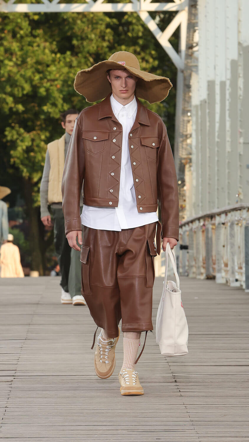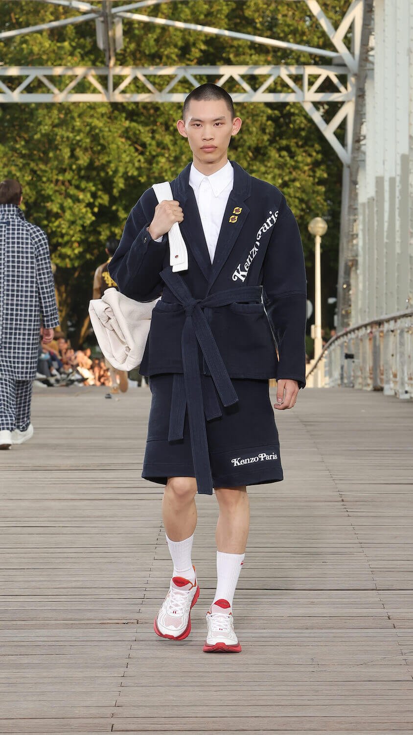 Suspended between opposing sides of a city, strung over the River Seine on the Passerelle Debilly footbridge that links the Palais de Tokyo with the Eiffel Tower, Kenzo’s SS24 collection kicked off; casual, colourful and considered. Entitled City Pop Paris, it was a line up envisioned in the memory of an elusive musical genre born in the same nation as the brand; Japan.