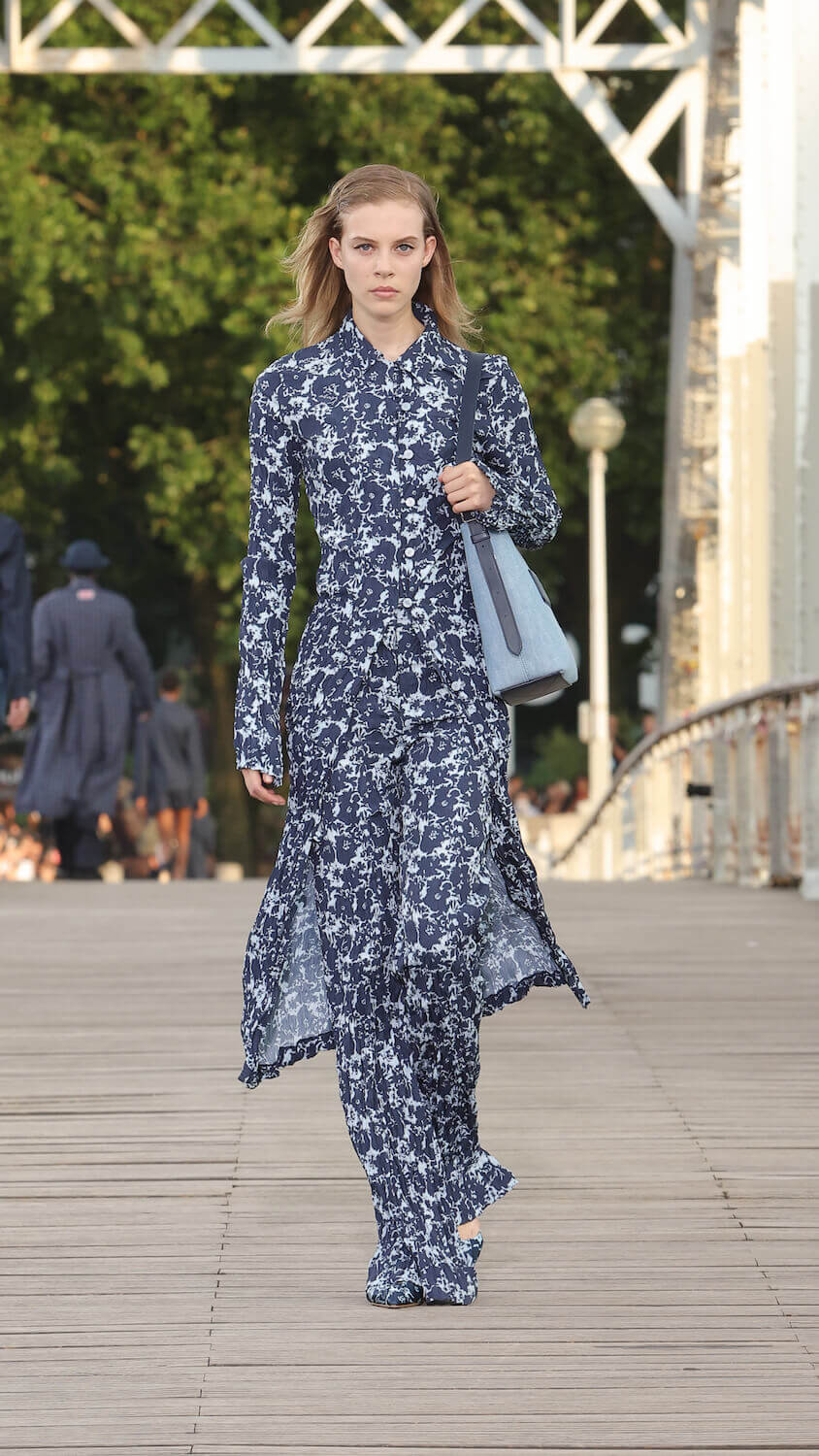 The rest of the offering invited sakura flowers onto denim twinsets, shift dresses and trench coats, while a mixture of workwear, sport and evening silhouettes sifted through salmon, crimson, baby blue, camel and black colourways.