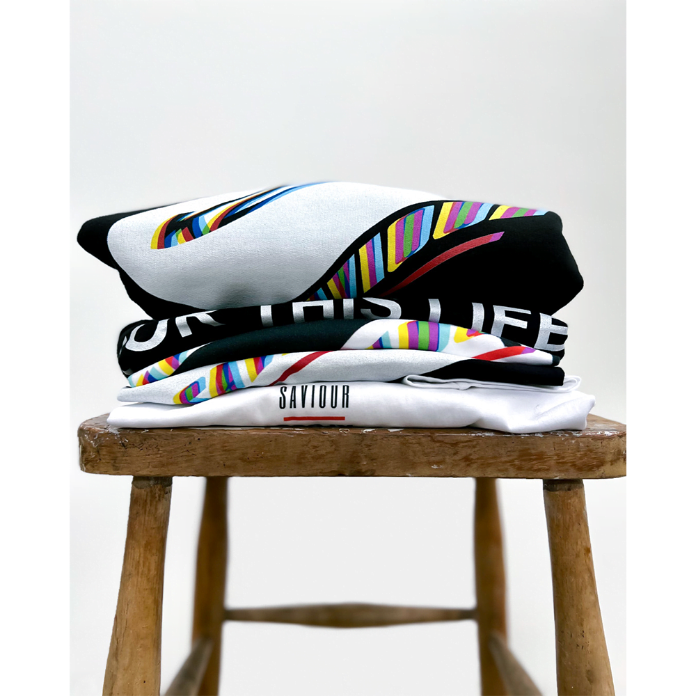 After a wardrobe refresher for your seasonal rotation? Kloss is coming at cha with a brand new merch drop. The creative community’s founder, Alec Maxwell, has tapped British label Saviour for a limited merch drop that dresses everyday garms in psychedelic prints, all while giving back to charity. Launched last year, Saviour founders William Rook and John Akanmu tend to splatter their borderless artwork onto hoodies, tees and jackets, often inspired by British culture that surrounds them. Saviour’s clothing keeps edges ragged, seams pulled and fabrics layered, taking pride in the imperfections that have come to define the brand.