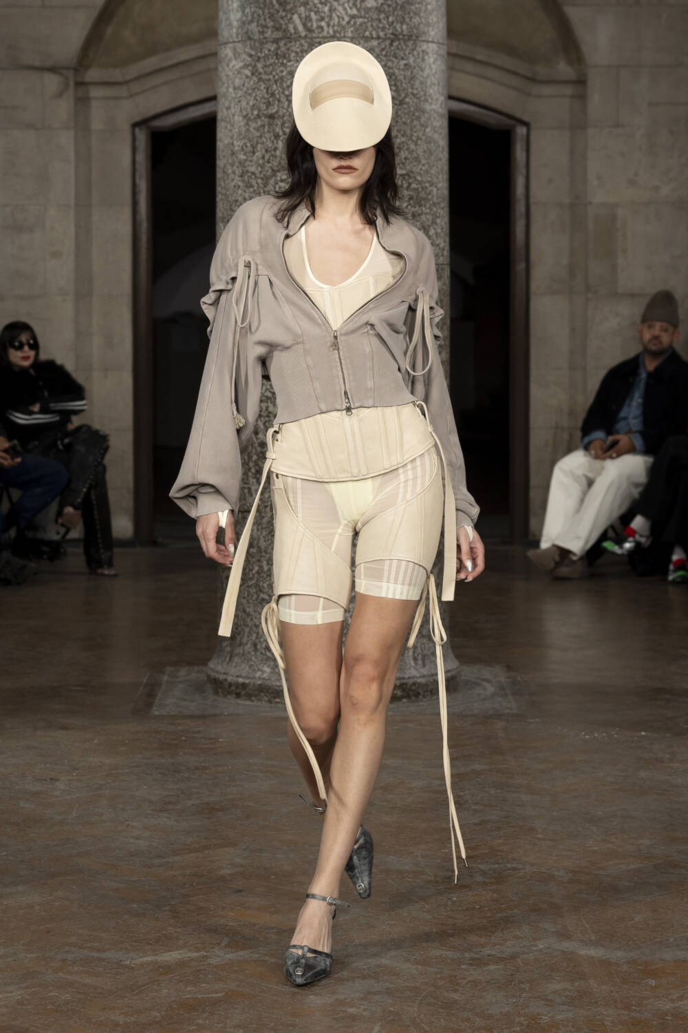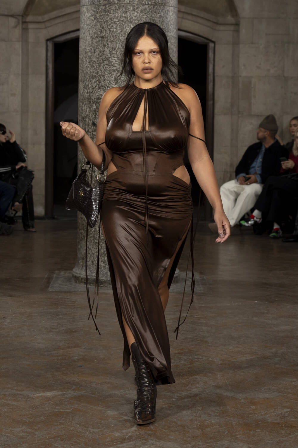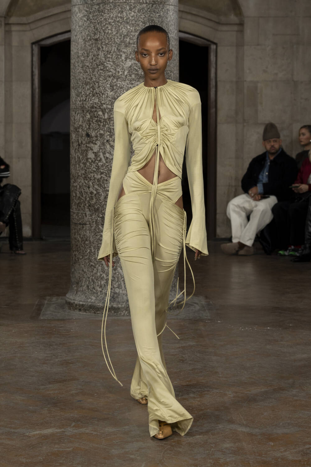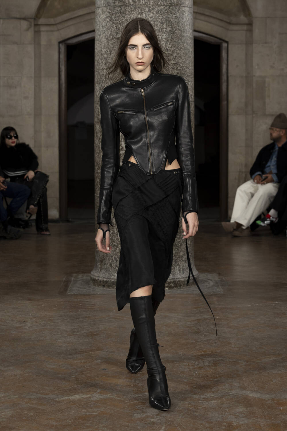 Co-creative directors Charlotte Knowles and Alexandre Arsenault looked to design greats like Madame Grès and Azzedine Alaïa to better understand their sartorial codes. The homework paid off in spades, translating into gorgeously gathered silk jumpsuits and gowns, sculptural outerwear and grungy biker leather sets that all fit snug as a bug. The cherry on top of a delicious sundae, chic intergalactic hats came courtesy of legendary milliner Stephen Jones who admired his handiwork from the FROW.