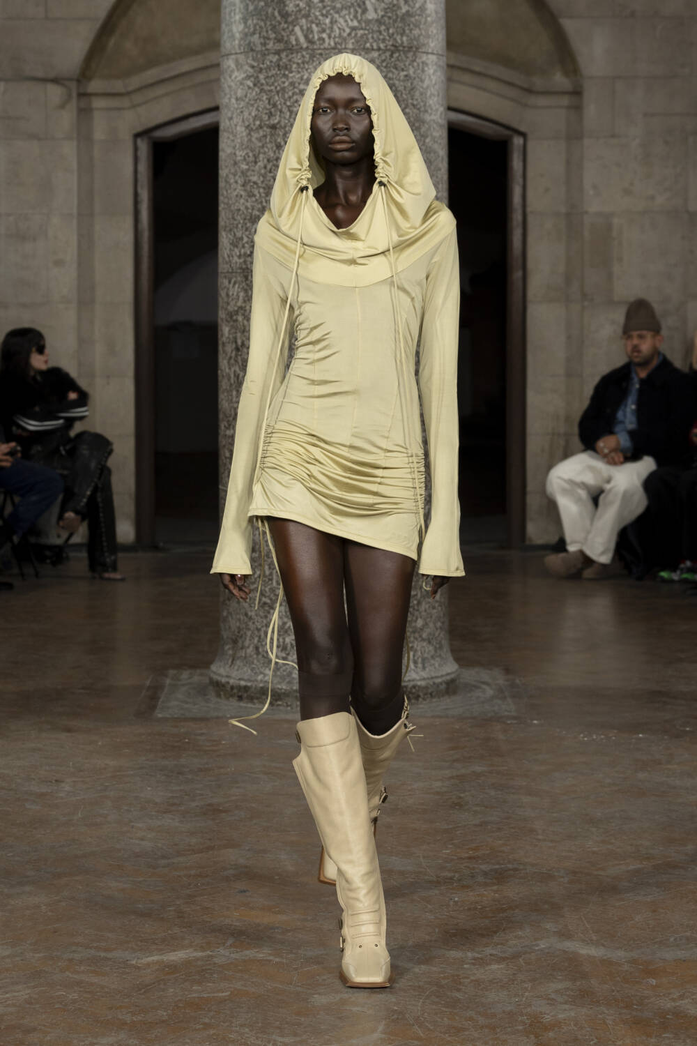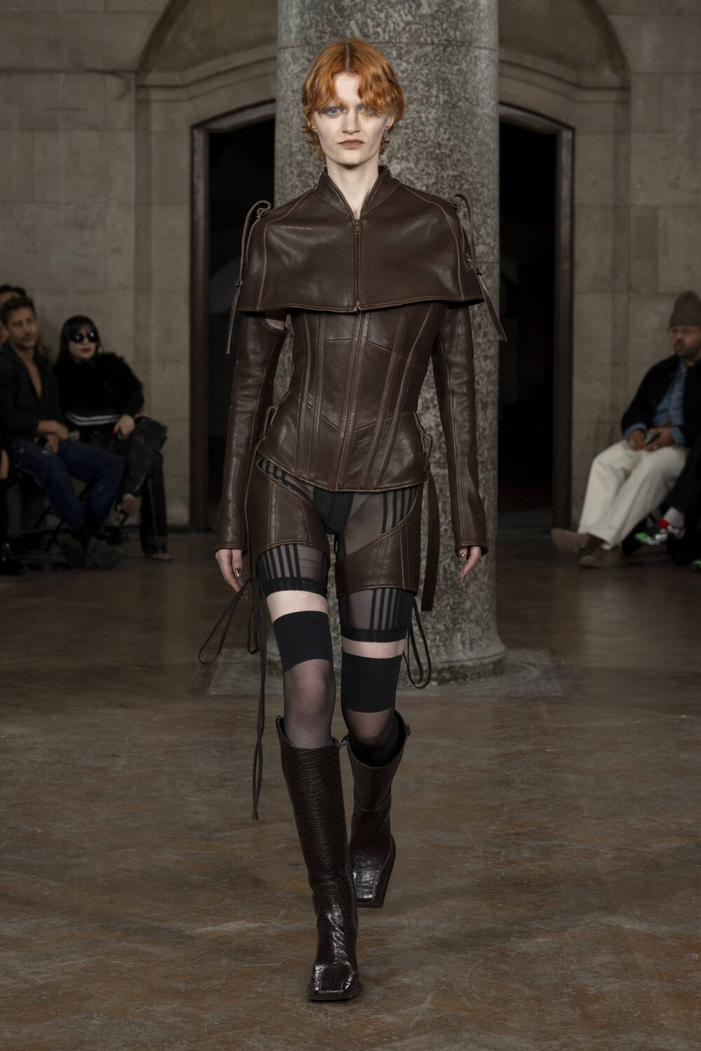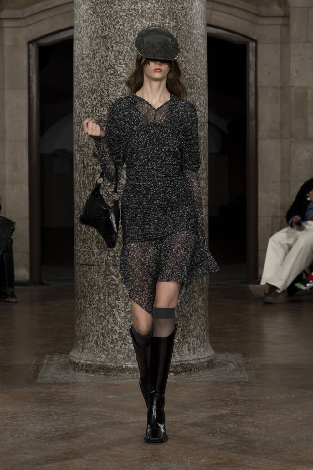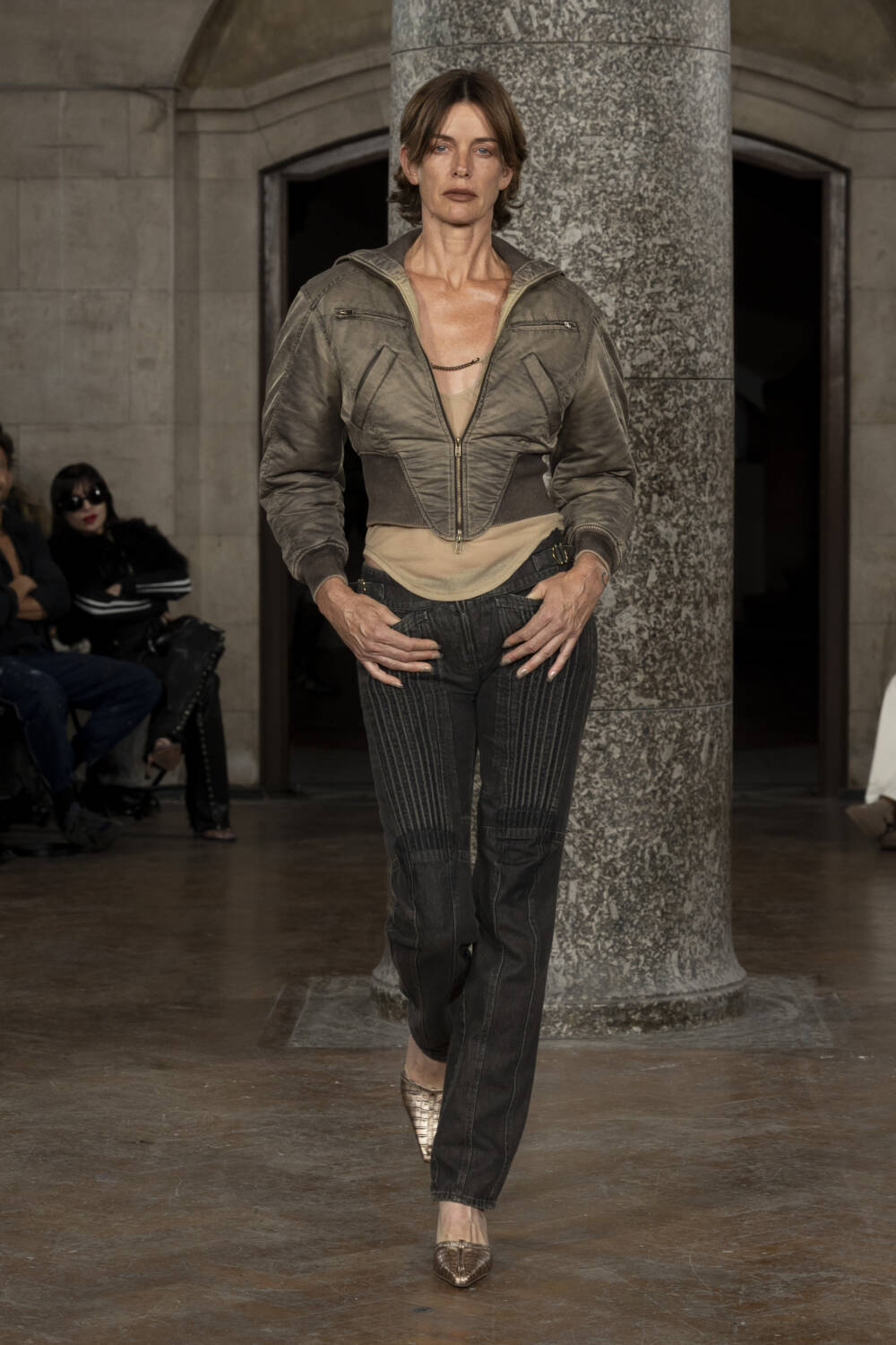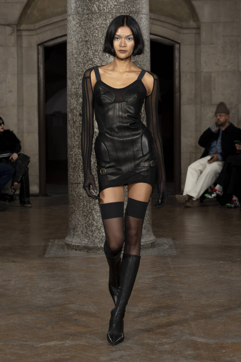 Co-creative directors Charlotte Knowles and Alexandre Arsenault looked to design greats like Madame Grès and Azzedine Alaïa to better understand their sartorial codes. The homework paid off in spades, translating into gorgeously gathered silk jumpsuits and gowns, sculptural outerwear and grungy biker leather sets that all fit snug as a bug. The cherry on top of a delicious sundae, chic intergalactic hats came courtesy of legendary milliner Stephen Jones who admired his handiwork from the FROW.