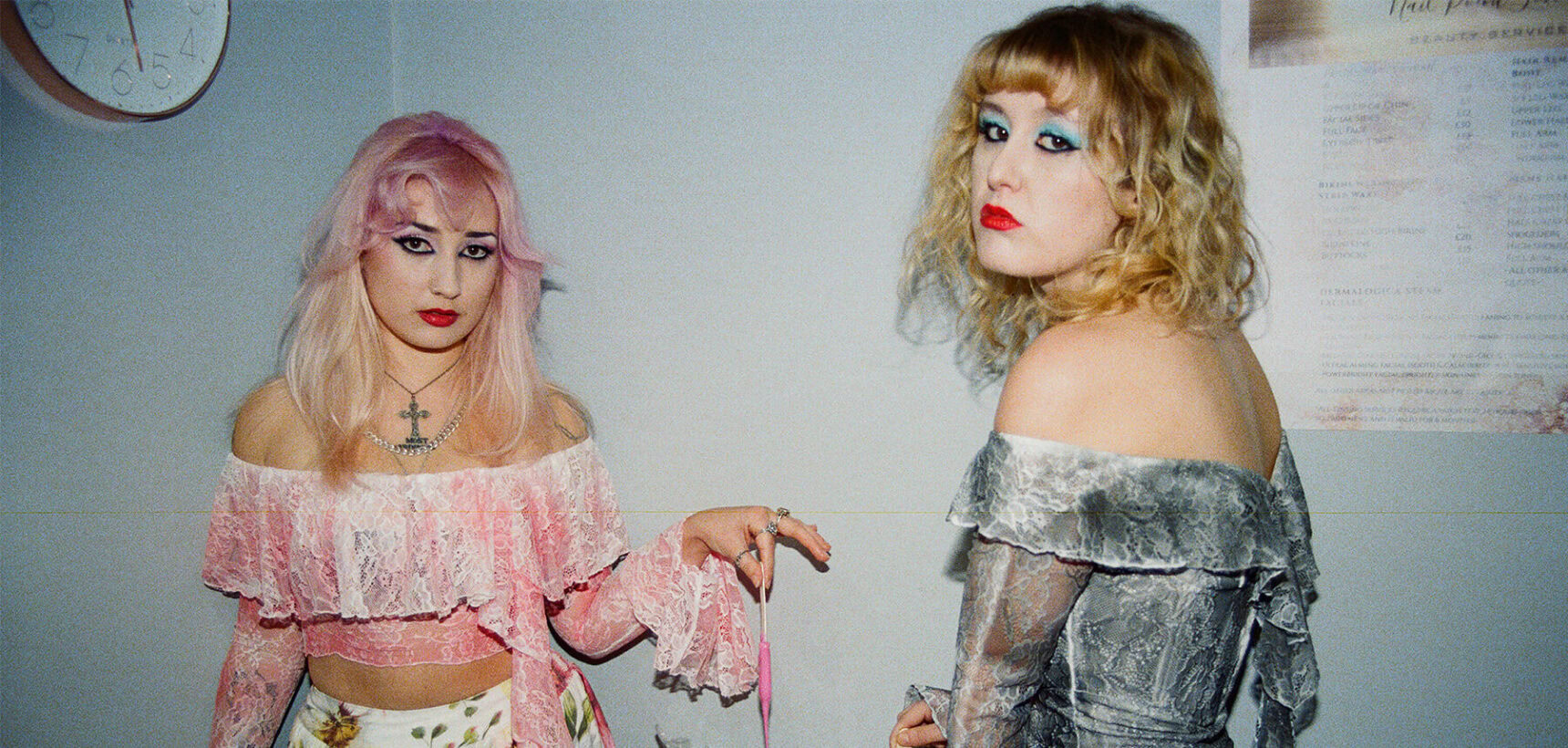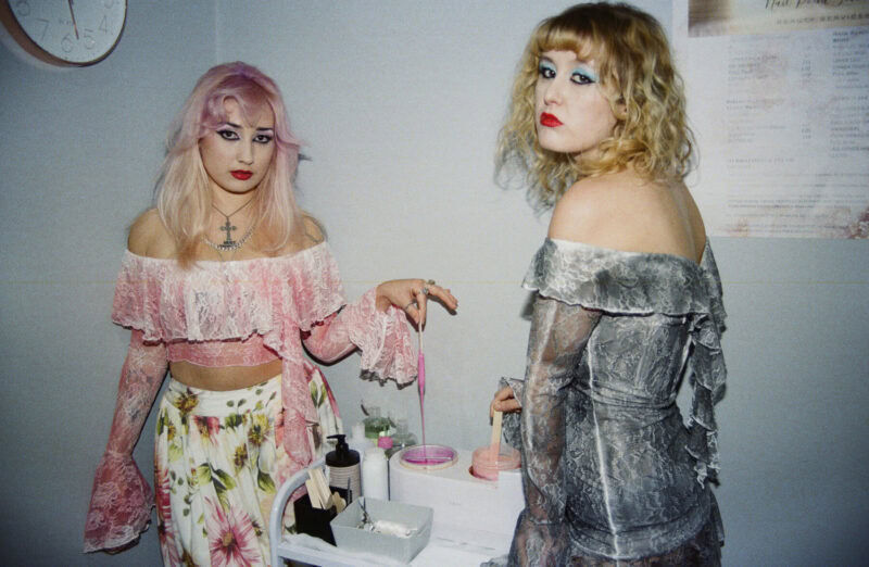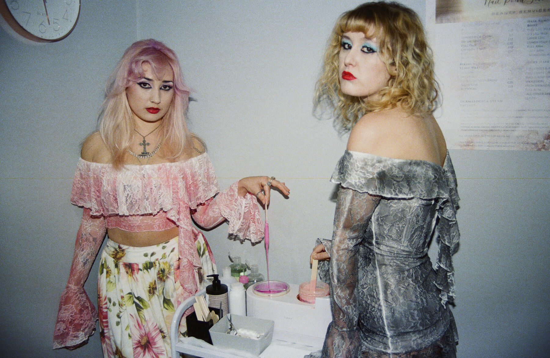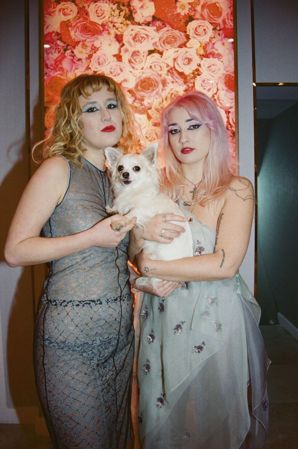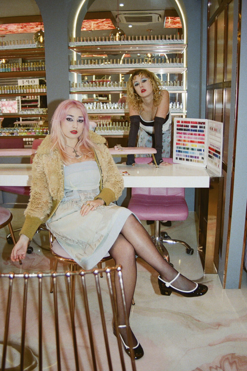 We meet at record shop Rough Trade East in Brick Lane a few hours before the duo are due to perform an intimate gig there. Sitting in a narrow green back room, surrounded by peeling, washed-out band stickers and record paraphernalia, the pair ricochet off each other as they talk. Bedecked in a black satin slip dress and smudged red lipstick, Lunny often leads the charge, while a more low-key Macieira – who has donned one of her “beloved” Juicy Couture velour tracksuits – picks up the story whenever needed.