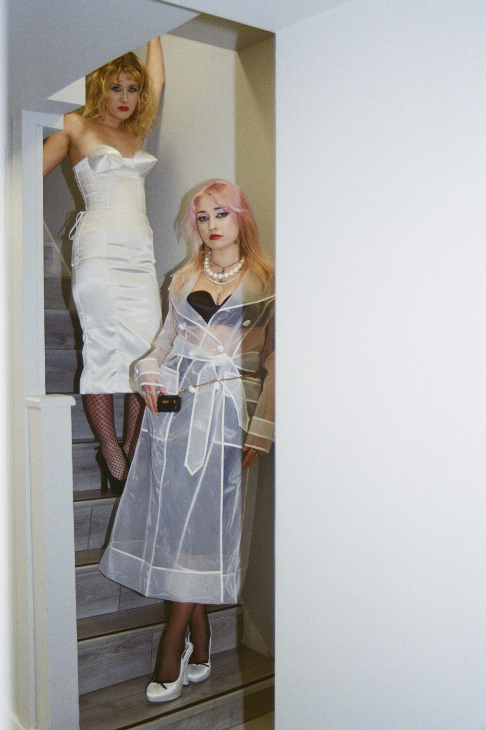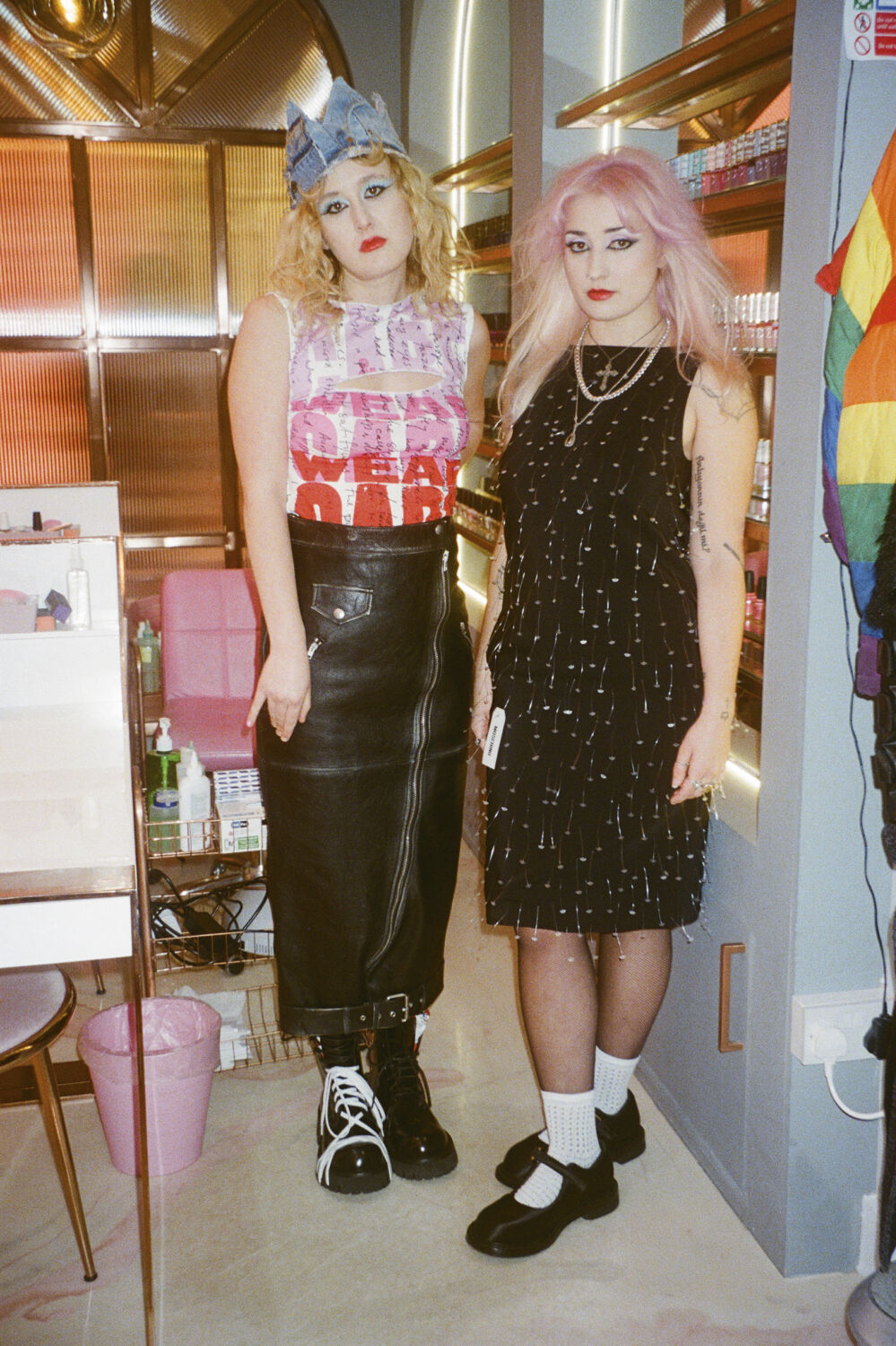 from left: Lilly wears corset and trousers by GIUSEPPE DI MORABITO, Phoebe wears GIUSEPPE DI MORABITO