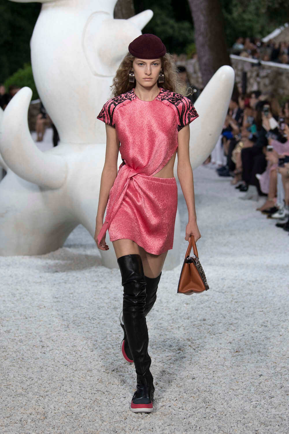 This was the epic tour-de-force fire in Nicolas Ghesquière’s heart, marking a new five year contract at Louis Vuitton. In case you missed the memo last week, Nicolas Ghesquière is #notgoinganywhere. And so we begin this review with a breaking newsworthy collaboration: Louis Vuitton has partnered with Grace Coddington on a capsule collection. Yes, that’s right, her love for cats, that she has always sketched so fabulously, purred on the arms of Ghesquière’s girls as they glided through the grounds of the Foundation Maeght. “I hope it will be a dream come true for Pumpkin, Blanket and Nicolas’ dog – it certainly is for me,” Grace said. “It started with our love for animals, it’s where Nicolas and I really connect beyond fashion.” A connection we are here for. So this was Cruise 2019 and these girls were cruising, their new found territory overlooking the Colline des Gardettes’ hilltop amongst the five elements that Isabelle Maeght said before the show are vegetable, mineral, water, fire and human. Healthy! Yes, it was down to earth, completely grounded in thigh high leather boots that scrunched into solid golden platform sneaker situations leading the way, space walkers. There is always an undercurrent of pretty in Ghesquière’s LV; loose satin shorts were somewhere between boxer and boudoir, giant paillettes flounced like bird feathers on a new-school youthful red carpet, for the next wave of young actors. The purest white pleats sliced sleeves so killer soft with their partners in crime- tough leather panels over shoulders, an armour in full force. Sunglasses were goggle and visor, Princess Anne last week vibes – we knew she was on to something. Each jacket and vest was perfectly sculpted, falling in our direction, the Ghesquière’s effect. It was a fire collection and it all glistened and shined, that Vuitton energy pumping out with the collaboration of the season. Oh how we want a Grace ‘Cat’ Coddington right now. Love partnerships at this clever Vuitton level. Nicolas Ghesquière was right. He’s not going anywhere. Placing order for thigh high sneaker boots now.