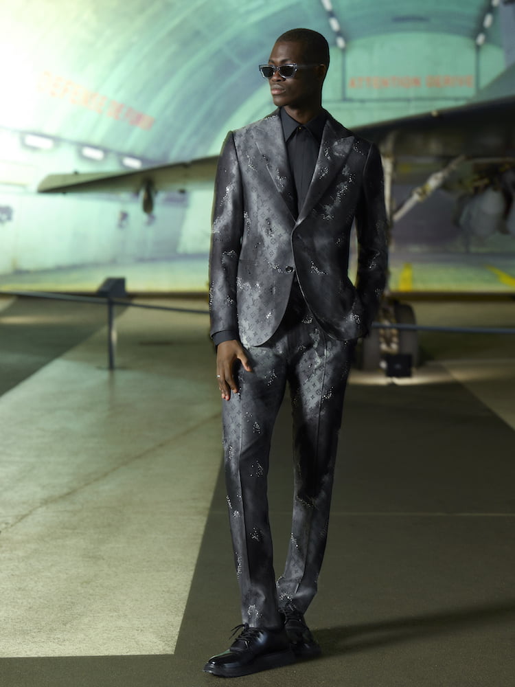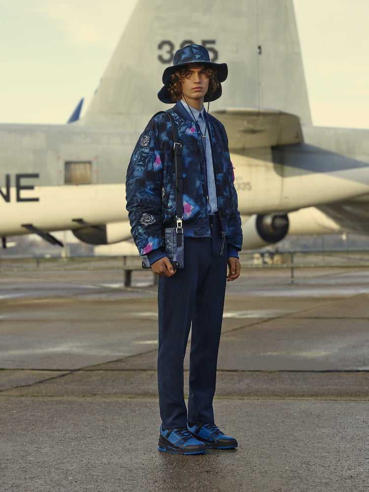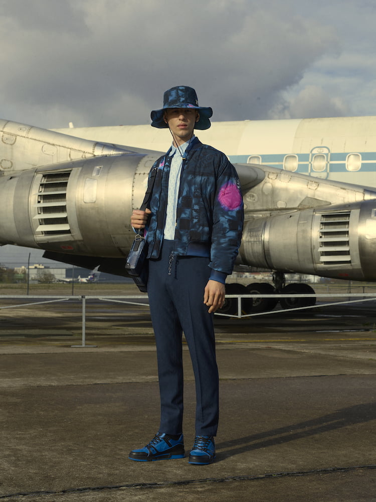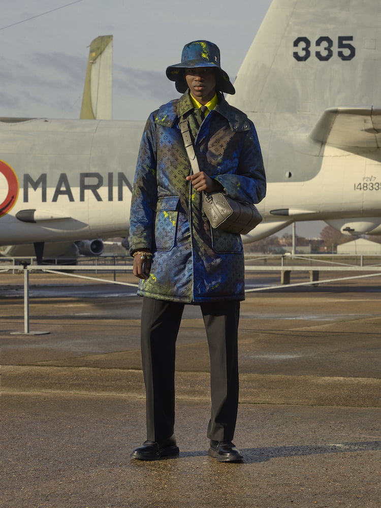 What Abloh calls “Back-to-work” tailoring comes smothered in a tie-dye, galaxy rendition of the Louis Vuitton monogram, paired alongside similar, technicoloured bomber jackets and flower-shaped bucket hats.