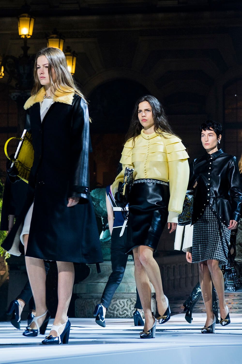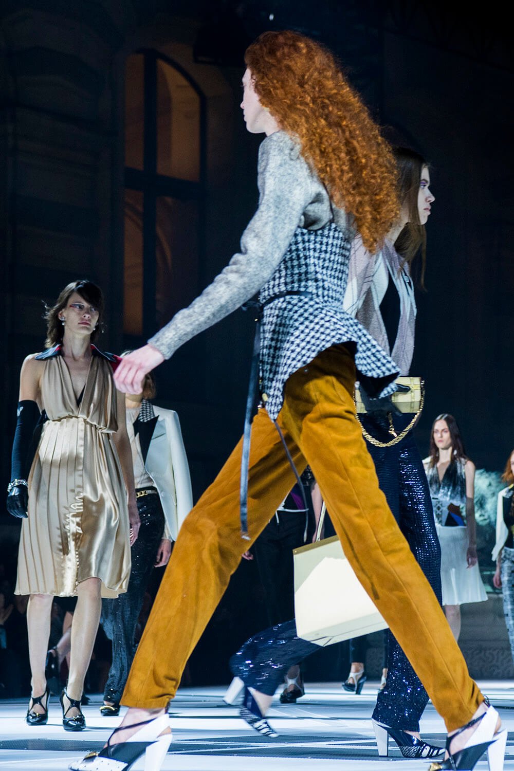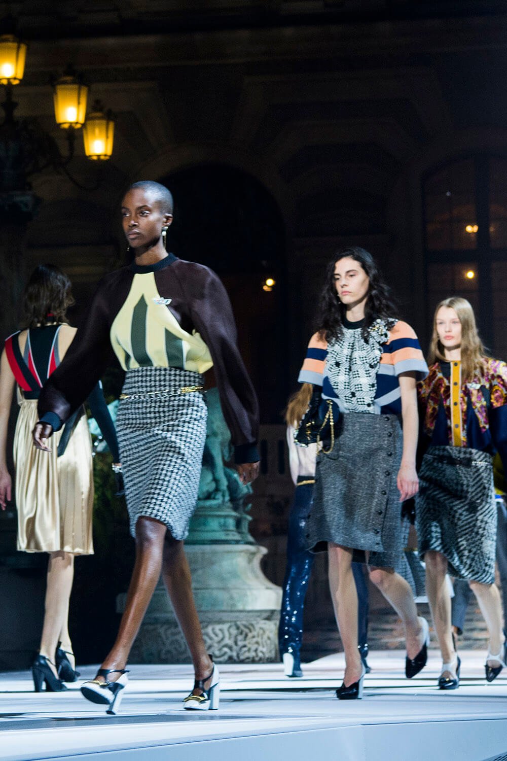 In the dead of the night (well, 6.30pm in Paris) the ladies of Louis Vuitton came out from their lair into the Musee Du Louvre’s courtyard, spotlit. The past was meeting the future, quite literally, as the runway ramp turned from the original Louvre paving into a white and grey landing pad. Star Wars style. Water spurted from the statues and Grace Jones’ eerie, theatrical ‘I’ve Seen That Face Before’ filled the night, “Strange, he shadows me back home, footsteps echo on the stones, rainy nights on Hausmann Boulevard, Parisian music drifting from the bars,” setting the scene. These women were up to something. Skirts fell to the knee, woollen checkered and pleated, straight down and straight to business. Embellished fringing fell off the shoulders and skirts and jumpers were lined with crystals on collars and waists.