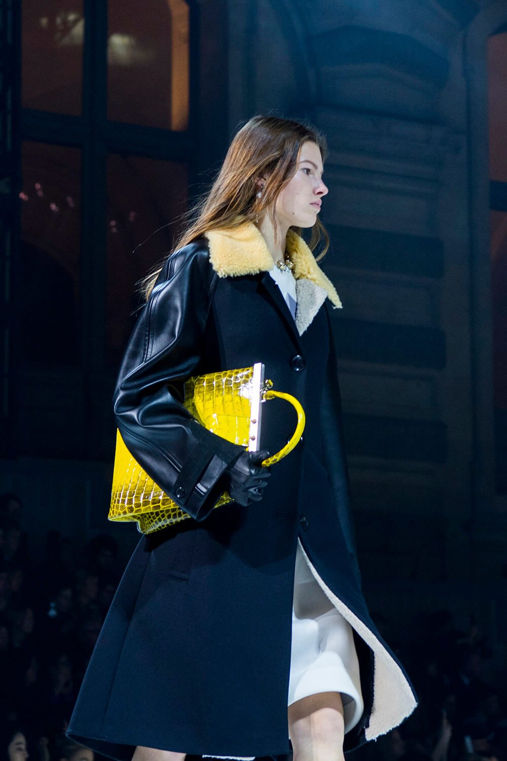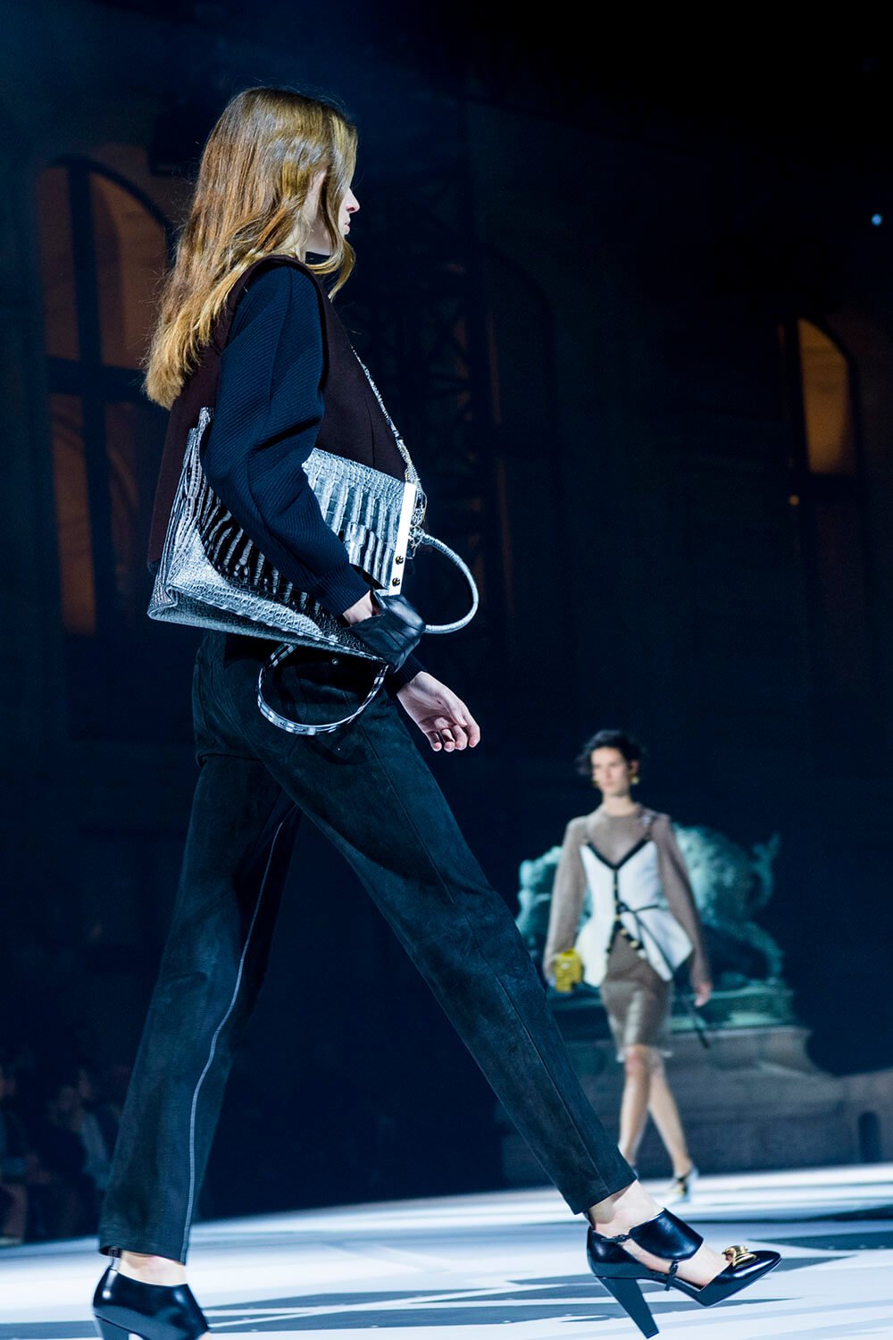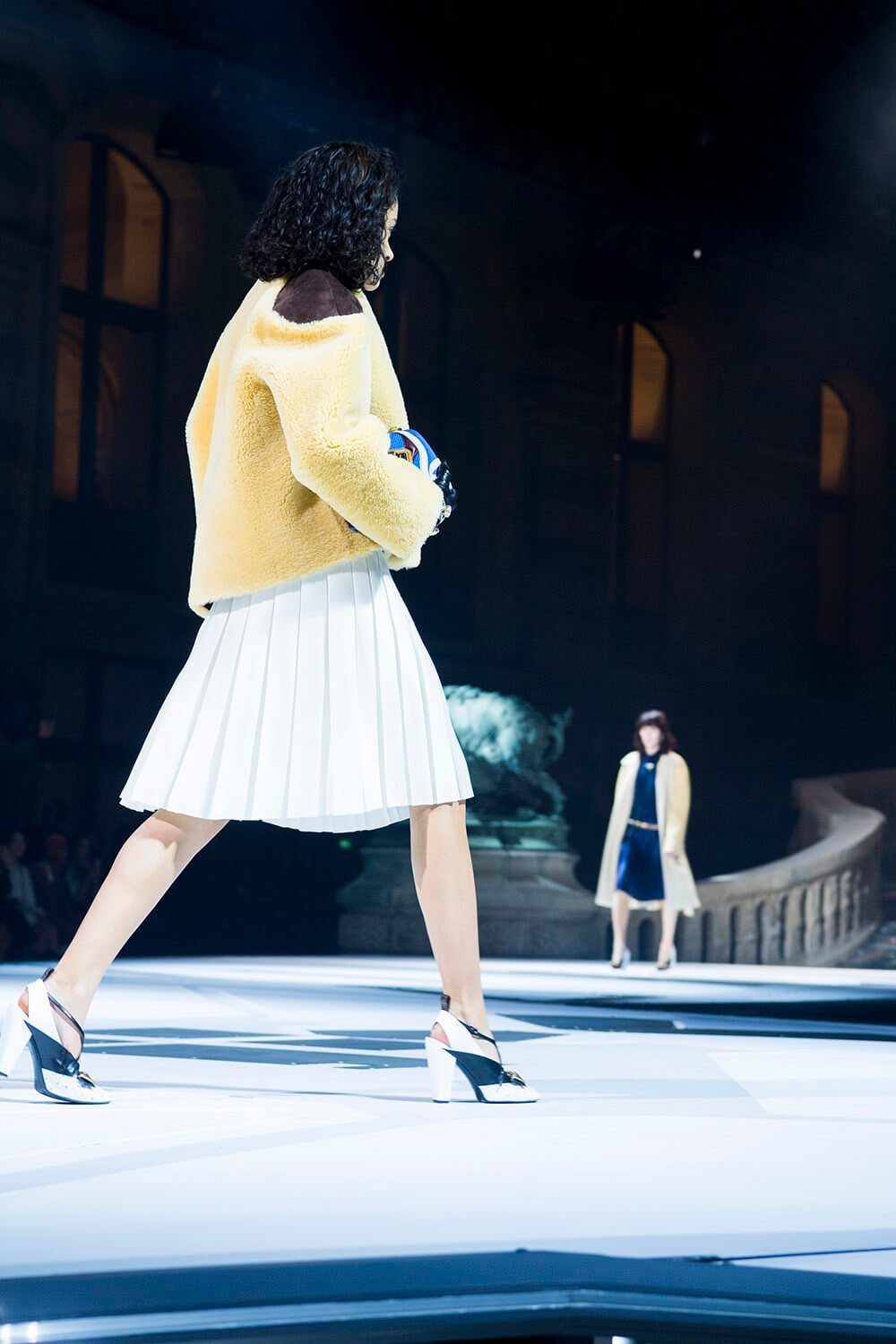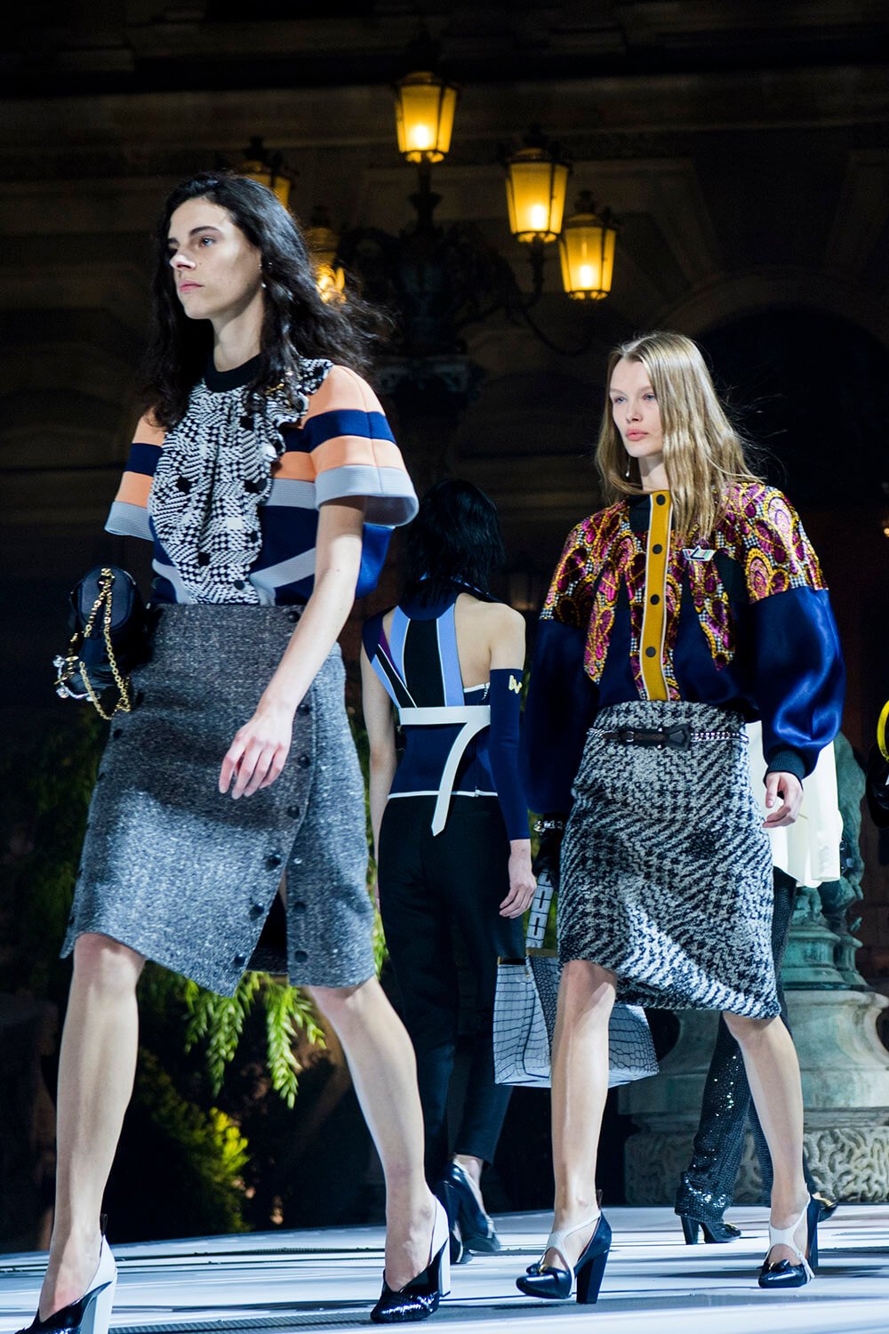 In the dead of the night (well, 6.30pm in Paris) the ladies of Louis Vuitton came out from their lair into the Musee Du Louvre’s courtyard, spotlit. The past was meeting the future, quite literally, as the runway ramp turned from the original Louvre paving into a white and grey landing pad. Star Wars style. Water spurted from the statues and Grace Jones’ eerie, theatrical ‘I’ve Seen That Face Before’ filled the night, “Strange, he shadows me back home, footsteps echo on the stones, rainy nights on Hausmann Boulevard, Parisian music drifting from the bars,” setting the scene. These women were up to something. Skirts fell to the knee, woollen checkered and pleated, straight down and straight to business. Embellished fringing fell off the shoulders and skirts and jumpers were lined with crystals on collars and waists.
